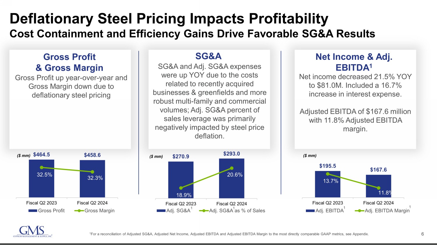5 Q2 Fiscal 2024 Sales Highlights Solid demand in commercial and multi - family construction drove volume increases in Ceilings, Steel Framing and Complementary Products, offset by price deflation in Steel Framing U.S. Residential Sales Q224 Net Sales $ 1.4 B Per Day Net Sales 2.1% U.S. Commercial Sales 0.4% U.S. Wallboard Volume For GMS Multi - Family – Up 17.0% Commercial – Up 6.5% Single - Family – Down 11.4% 5.7% 0.7% Deflationary price dynamics in Steel Framing reduced net sales by $85 million for the quarter Q224 Q223 Change Q224 Q223 Change Volume Price/Mix/Fx Wallboard 9.0$ 9.0$ 0.1% 9.0$ 9.0$ -0.3% -1.0% 0.7% Ceilings 2.7$ 2.5$ 9.9% 2.6$ 2.5$ 7.2% 5.8% 1.4% Steel Framing 3.6$ 4.3$ -16.6% 3.5$ 4.3$ -17.4% 13.1% -30.5% Complementary Products 6.6$ 6.3$ 4.8% 6.2$ 6.3$ -1.4% Total 21.9$ 22.1$ -0.7% 21.3$ 22.1$ -3.1% Per Day Net Sales Per Day Organic Sales Per Day Organic Growth