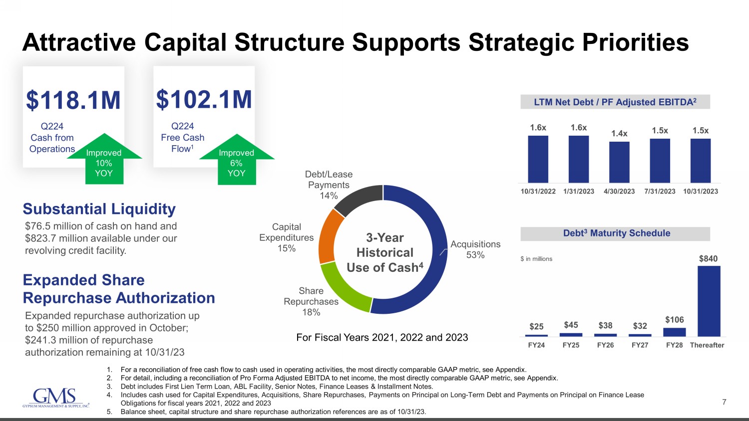 6 $464.5 $458.6 32.5% 32.3% 31.1% 31.6% 32.1% 32.6% $0 $50 $100 $150 $200 $250 $300 $350 $400 $450 $500 Fiscal Q2 2023 Fiscal Q2 2024 Gross Profit Gross Margin ($ mm) Deflationary Steel Pricing Impacts Profitability Cost Containment and Efficiency Gains Drive Favorable SG&A Results 1 For a reconciliation of Adjusted SG&A, Adjusted Net Income, Adjusted EBITDA and Adjusted EBITDA Margin to the most directly c omp arable GAAP metrics, see Appendix. 1 1 1 $270.9 $293.0 18.9% 20.6% 18.0% 18.5% 19.0% 19.5% 20.0% 20.5% 21.0% 21.5% $0 $50 $100 $150 $200 $250 $300 Fiscal Q2 2023 Fiscal Q2 2024 Adj. SG&A Adj. SG&A as % of Sales ($ mm) 1 $195.5 $167.6 13.7% 11.8% 10.5% 11.0% 11.5% 12.0% 12.5% 13.0% 13.5% 14.0% 14.5% 15.0% 15.5% 16.0% $0 $50 $100 $150 $200 $250 $300 Fiscal Q2 2023 Fiscal Q2 2024 Adj. EBITDA Adj. EBITDA Margin ($ mm) Gross Profit & Gross Margin Gross Profit up year - over - year and Gross Margin down due to deflationary steel pricing SG&A SG&A and Adj. SG&A expenses were up YOY due to the costs related to recently acquired businesses & greenfields and more robust multi - family and commercial volumes; Adj. SG&A percent of sales leverage was primarily negatively impacted by steel price deflation. Net Income & Adj. EBITDA 1 Net income decreased 21.5% YOY to $81.0M. Included a 16.7% increase in interest expense. Adjusted EBITDA of $167.6 million with 11.8% Adjusted EBITDA margin.