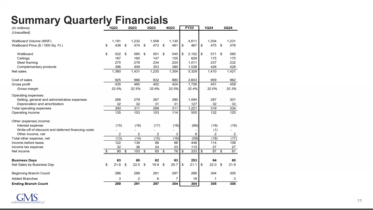 11 Summary Quarterly Financials (In millions) 1Q23 2Q23 3Q23 4Q23 FY23 1Q24 2Q24 (Unaudited) Wallboard Volume (MSF) 1,191 1,232 1,058 1,130 4,611 1,204 1,231 Wallboard Price ($ / '000 Sq. Ft.) 438$ 474$ 473$ 481$ 467$ 475$ 476$ Wallboard 522$ 585$ 501$ 545$ 2,152$ 571$ 585$ Ceilings 167 160 147 155 629 175 175 Steel framing 275 278 234 224 1,011 237 232 Complementary products 396 409 353 380 1,538 426 428 Net sales 1,360 1,431 1,235 1,304 5,329 1,410 1,421 Cost of sales 925 966 832 880 3,603 959 962 Gross profit 435 465 402 424 1,726 451 459 Gross margin 32.0% 32.5% 32.6% 32.5% 32.4% 32.0% 32.3% Operating expenses: Selling, general and administrative expenses 268 279 267 280 1,094 287 301 Depreciation and amortization 32 32 31 31 127 32 33 Total operating expenses 300 311 299 311 1,221 319 334 Operating income 135 153 103 114 505 132 125 Other (expense) income: Interest expense (15) (16) (17) (18) (66) (19) (19) Write-off of discount and deferred financing costs - - - - - (1) - Other income, net 2 2 2 3 8 2 2 Total other expense, net (13) (14) (15) (16) (58) (18) (17) Income before taxes 122 139 88 98 448 114 108 Income tax expense 32 36 24 23 115 27 27 Net income 90$ 103$ 65$ 76$ 333$ 87$ 81$ Business Days 63 65 62 63 253 64 65 Net Sales by Business Day 21.6$ 22.0$ 19.9$ 20.7$ 21.1$ 22.0$ 21.9$ Beginning Branch Count 286 289 291 297 286 304 305 Added Branches 3 2 6 7 18 1 3 Ending Branch Count 289 291 297 304 304 305 308