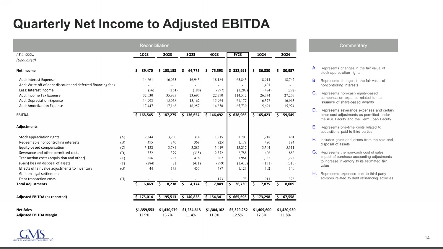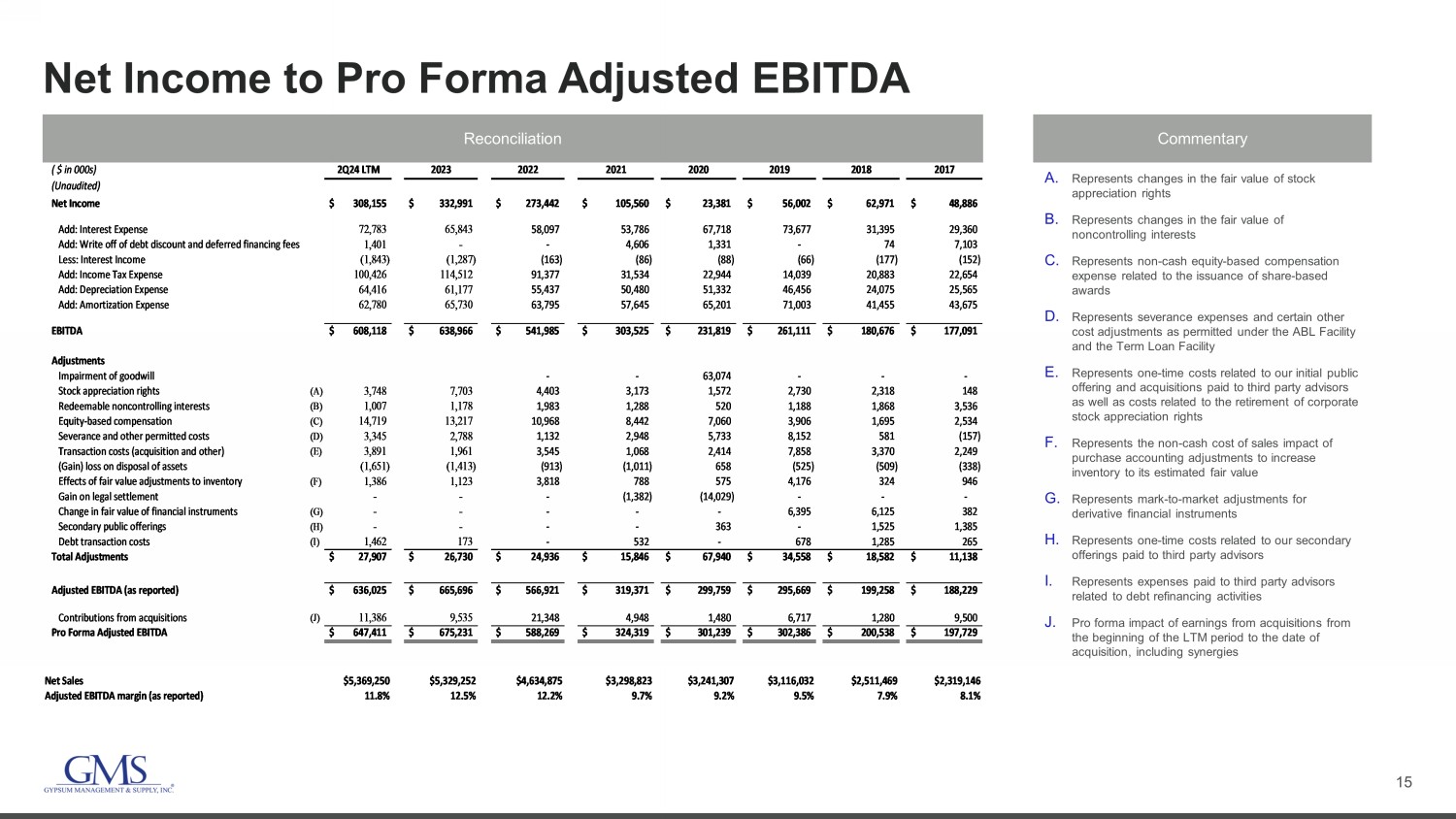 14 Quarterly Net Income to Adjusted EBITDA Reconciliation Commentary A. Represents changes in the fair value of stock appreciation rights B. Represents changes in the fair value of noncontrolling interests C. Represents non - cash equity - based compensation expense related to the issuance of share - based awards D. Represents severance expenses and certain other cost adjustments as permitted under the ABL Facility and the Term Loan Facility E. Represents one - time costs related to acquisitions paid to third parties F. Includes gains and losses from the sale and disposal of assets G. Represents the non - cash cost of sales impact of purchase accounting adjustments to increase inventory to its estimated fair value H. Represents expenses paid to third party advisors related to debt refinancing activities ( $ in 000s) 1Q23 2Q23 3Q23 4Q23 FY23 1Q24 2Q24 (Unaudited) Net Income 89,470$ 103,153$ 64,775$ 75,593$ 332,991$ 86,830$ 80,957$ Add: Interest Expense 14,661 16,055 16,943 18,184 65,843 18,914 18,742 Add: Write off of debt discount and deferred financing fees - - - - - 1,401 - Less: Interest Income (56) (154) (180) (897) (1,287) (474) (292) Add: Income Tax Expense 32,030 35,995 23,697 22,790 114,512 26,734 27,205 Add: Depreciation Expense 14,993 15,058 15,162 15,964 61,177 16,327 16,963 Add: Amortization Expense 17,447 17,168 16,257 14,858 65,730 15,691 15,974 EBITDA 168,545$ 187,275$ 136,654$ 146,492$ 638,966$ 165,423$ 159,549$ Adjustments Stock appreciation rights (A) 2,344 3,230 314 1,815 7,703 1,218 401 Redeemable noncontrolling interests (B) 495 340 368 (25) 1,178 480 184 Equity-based compensation (C) 3,132 3,781 3,285 3,019 13,217 3,304 5,111 Severance and other permitted costs (D) 352 379 (315) 2,372 2,788 406 882 Transaction costs (acquisition and other) (E) 386 292 476 807 1,961 1,385 1,223 (Gain) loss on disposal of assets (F) (284) 81 (411) (799) (1,413) (131) (310) Effects of fair value adjustments to inventory (G) 44 135 457 487 1,123 302 140 Gain on legal settlement - - - - - - Debt transaction costs (H) - - - 173 173 911 378 Total Adjustments 6,469$ 8,238$ 4,174$ 7,849$ 26,730$ 7,875$ 8,009$ Adjusted EBITDA (as reported) 175,014$ 195,513$ 140,828$ 154,341$ 665,696$ 173,298$ 167,558$ Net Sales $1,359,553 $1,430,979 $1,234,618 $1,304,102 $5,329,252 $1,409,600 $1,420,930 Adjusted EBITDA Margin 12.9% 13.7% 11.4% 11.8% 12.5% 12.3% 11.8%