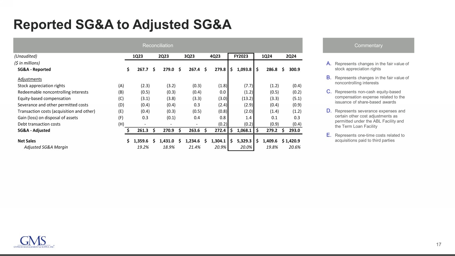 16 Income Before Taxes to Adjusted Net Income Reconciliation Commentary A. Depreciation and amortization from the increase in value of certain long - term assets associated with the April 1, 2014 acquisition of the predecessor company and amortization of intangible assets from the acquisitions of Titan, Westside Building Materials, and AMES Taping Tools B. Normalized cash tax rate determined based on our estimated taxes excluding the impact of purchase accounting and certain other deferred tax amounts ($ in 000s) 2Q24 2Q23 (Unaudited) Income before taxes 108,162$ 139,148$ EBITDA adjustments 8,009 8,238 Write-off of debt discount and deferred financing fees - - Purchase accounting depreciation and amortization (A) 10,823 13,057 Adjusted pre-tax income 126,994 160,443 Adjusted income tax expense 32,383 40,913 Adjusted net income 94,611$ 119,530$ Effective tax rate (B) 25.5% 25.5% Weighted average shares outstanding: Basic 40,466 42,232 Diluted 41,088 42,887 Adjusted net income per share: Basic 2.34$ 2.83$ Diluted 2.30$ 2.79$