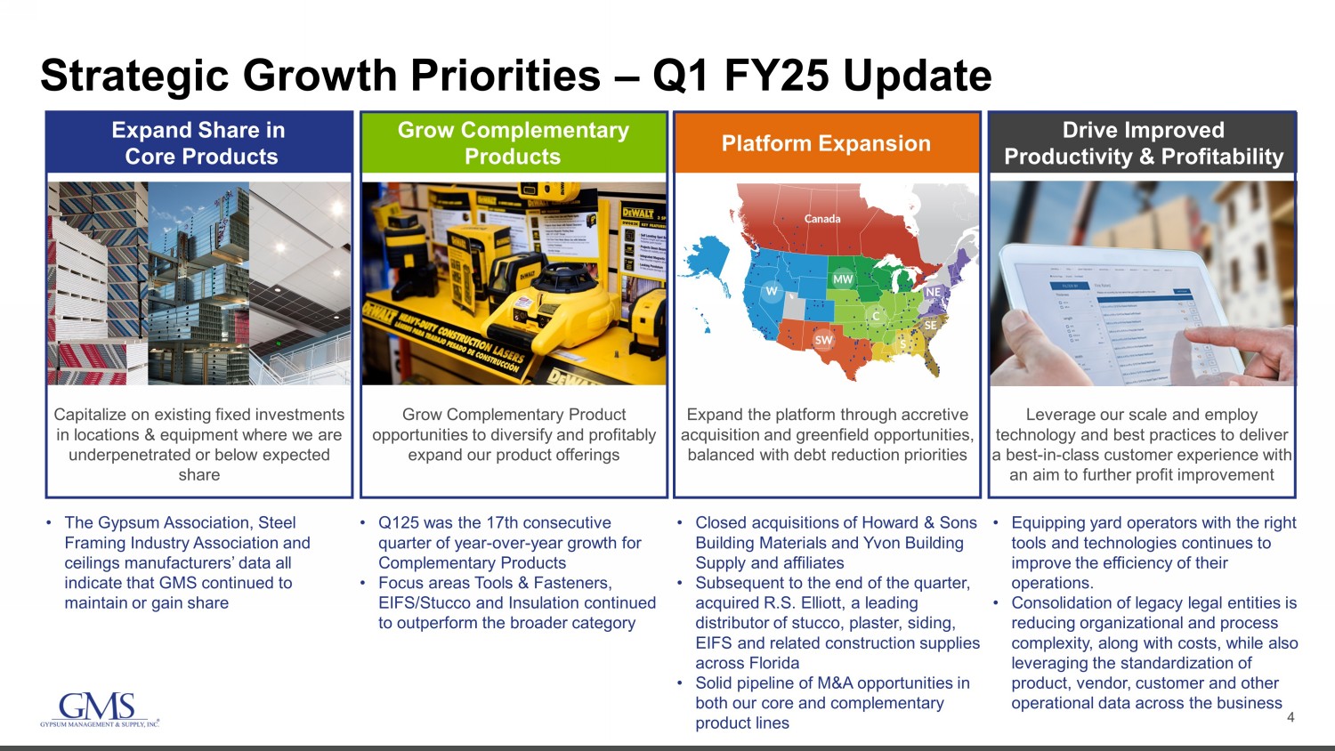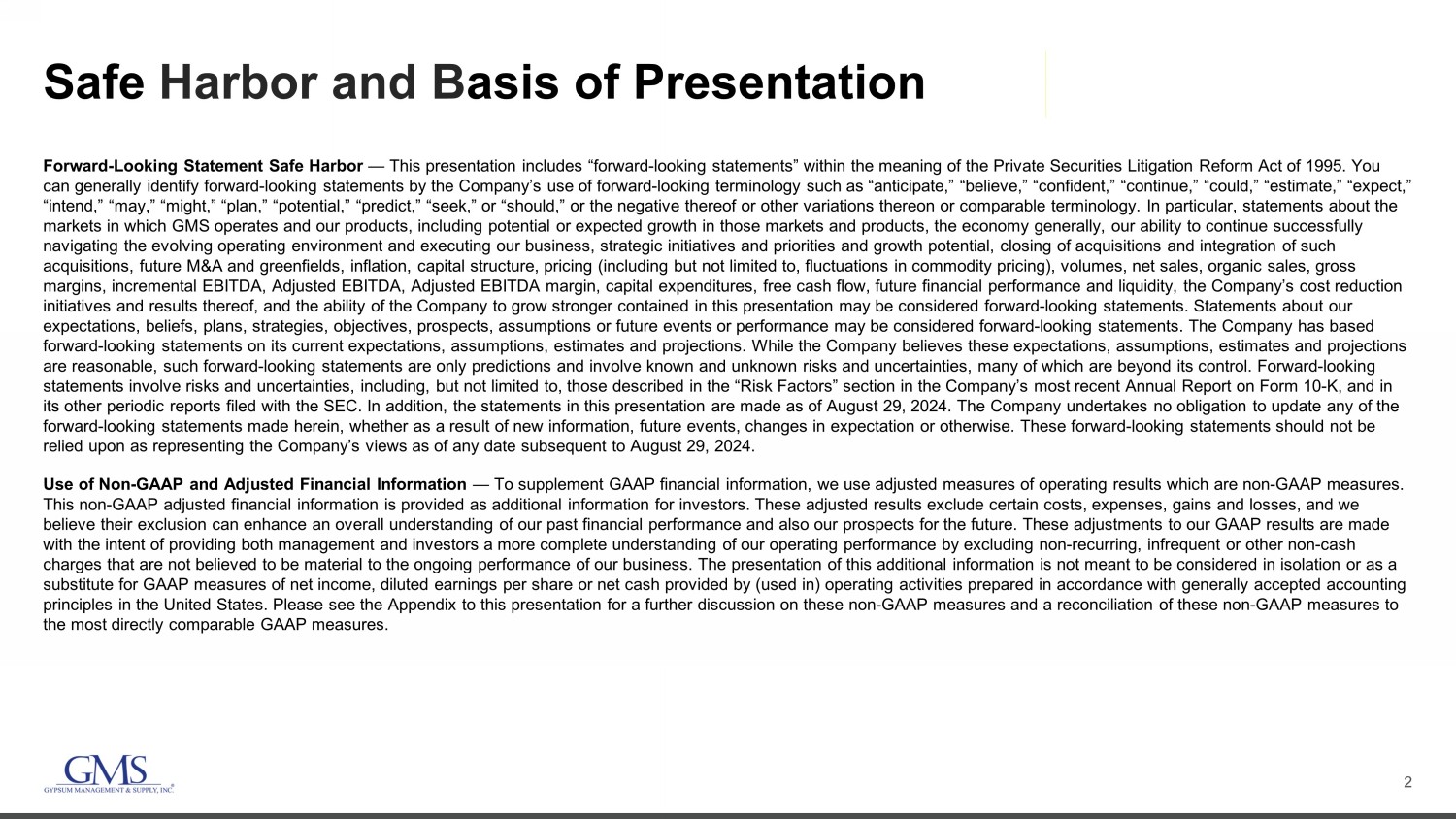 2 Safe Harbor and B asis of Presentation Forward - Looking Statement Safe Harbor — This presentation includes “forward - looking statements” within the meaning of the Private Securities Litigation Reform Act of 1995. You can generally identify forward - looking statements by the Company’s use of forward - looking terminology such as “anticipate,” “bel ieve,” “confident,” “continue,” “could,” “estimate,” “expect,” “intend,” “may,” “might,” “plan,” “potential,” “predict,” “seek,” or “should,” or the negative thereof or other variations th ere on or comparable terminology. In particular, statements about the markets in which GMS operates and our products, including potential or expected growth in those markets and products, the eco nom y generally, our ability to continue successfully navigating the evolving operating environment and executing our business, strategic initiatives and priorities and growth pot ent ial, closing of acquisitions and integration of such acquisitions, future M&A and greenfields, inflation, capital structure, pricing (including but not limited to, fluctuations i n c ommodity pricing), volumes, net sales, organic sales, gross margins, incremental EBITDA, Adjusted EBITDA, Adjusted EBITDA margin, capital expenditures, free cash flow, future financial per formance and liquidity, the Company’s cost reduction initiatives and results thereof, and the ability of the Company to grow stronger contained in this presentation may be consid ere d forward - looking statements. Statements about our expectations, beliefs, plans, strategies, objectives, prospects, assumptions or future events or performance may be considere d f orward - looking statements. The Company has based forward - looking statements on its current expectations, assumptions, estimates and projections. While the Company believes these expectations, assumptions, estimates and projections are reasonable, such forward - looking statements are only predictions and involve known and unknown risks and uncertainties, many of which are beyond its control. Forward - looking statements involve risks and uncertainties, including, but not limited to, those described in the “Risk Factors” section in t he Company’s most recent Annual Report on Form 10 - K, and in its other periodic reports filed with the SEC. In addition, the statements in this presentation are made as of August 29, 202 4. The Company undertakes no obligation to update any of the forward - looking statements made herein, whether as a result of new information, future events, changes in expectation or otherwi se. These forward - looking statements should not be relied upon as representing the Company’s views as of any date subsequent to August 29, 2024. Use of Non - GAAP and Adjusted Financial Information — To supplement GAAP financial information, we use adjusted measures of operating results which are non - GAAP measures. This non - GAAP adjusted financial information is provided as additional information for investors. These adjusted results exclude certain costs, expenses, gains and losses, and we believe their exclusion can enhance an overall understanding of our past financial performance and also our prospects for the fu ture. These adjustments to our GAAP results are made with the intent of providing both management and investors a more complete understanding of our operating performance by excl udi ng non - recurring, infrequent or other non - cash charges that are not believed to be material to the ongoing performance of our business. The presentation of this additional inf ormation is not meant to be considered in isolation or as a substitute for GAAP measures of net income, diluted earnings per share or net cash provided by (used in) operating activities pr epared in accordance with generally accepted accounting principles in the United States. Please see the Appendix to this presentation for a further discussion on these non - GAAP measure s and a reconciliation of these non - GAAP measures to the most directly comparable GAAP measures.