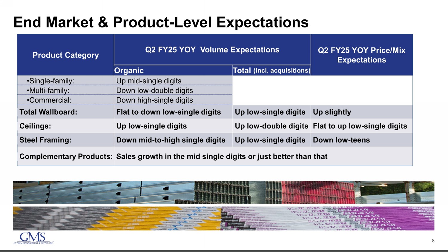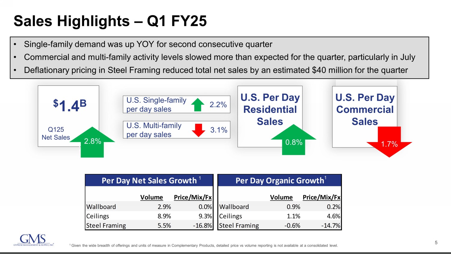 3 Wallboard 41% Ceilings 14% Steel Framing 14% Complementary Products 31% Q1 Fiscal 2025 At a Glance Comparisons are to Q 1 FY2 4 • Volume growth across all four major product categories, inclusive of acquisitions • Resilient or improved pricing in Wallboard, Ceilings and Complementary Products • Positive contributions from acquisitions • Softening demand in multi - family and commercial end markets, partially offset by year - over - year growth in single - family demand • Net Sales of $1.4 billion, up 2.8% U.S. Wallboard Volume For GMS Multi - Family – Down 2.3% Commercial – Up 0.2% Single - Family – Up 4.1% 1 For a reconciliation of Adjusted EBITDA to the most directly comparable GAAP metrics, see Appendix. • Gross margin of 31.2%, down 80 bps • Net income of $57.2 million, compared to $86.8 million • Adjusted EBITDA 1 of $145.9 million, compared to $173.3 million • Implementing $25 million annualized cost reduction program Q1 FY25 Net Sales Q1 FY25 Q1 FY24 Change Wallboard 587.9$ 571.4$ 2.9% 1.1% Ceilings 207.2$ 175.2$ 18.2% 5.7% Steel Framing 209.9$ 236.8$ -11.4% -15.3% Complementary Products 443.5$ 426.2$ 4.1% -2.7% Total 1,448.5$ 1,409.6$ 2.8% -2.2% Organic Sales Change Net Sales