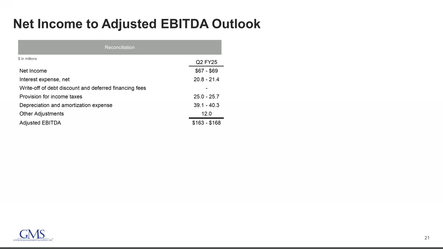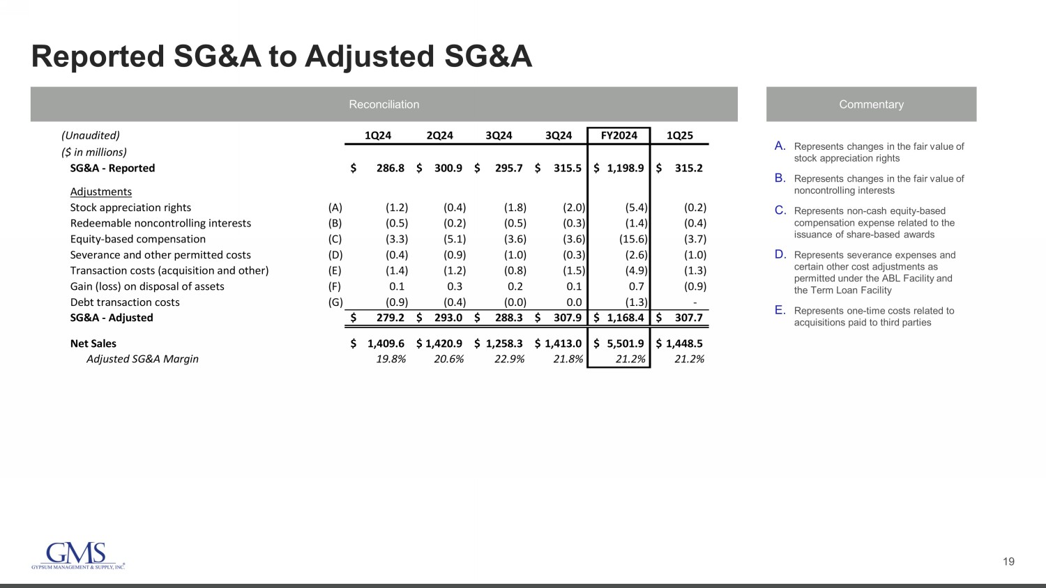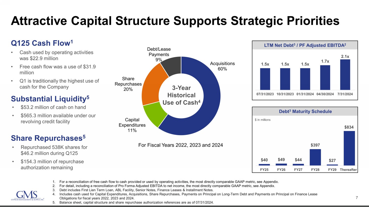 6 $450.6 $451.6 32.0% 31.2% 30.0% 30.5% 31.0% 31.5% 32.0% 32.5% 33.0% 33.5% $0 $50 $100 $150 $200 $250 $300 $350 $400 $450 $500 Fiscal Q1 2024 Fiscal Q1 2025 Gross Profit Gross Margin ($ mm) Shifts in Price Realization and Demand Mix Impacted Profitability * For a reconciliation of Adjusted SG&A, Adjusted EBITDA and Adjusted EBITDA Margin to the most directly comparable GAAP metric s, see Appendix. $279.2 $307.7 19.8% 21.2% 18.0% 18.5% 19.0% 19.5% 20.0% 20.5% 21.0% 21.5% 22.0% 22.5% 23.0% 23.5% 24.0% 24.5% $0 $50 $100 $150 $200 $250 $300 Fiscal Q1 2024 Fiscal Q1 2025 Adj. SG&A* Adj. SG&A* as % of Sales ($ mm) $173.3 $145.9 12.3% 10.1% 8.0% 8.5% 9.0% 9.5% 10.0% 10.5% 11.0% 11.5% 12.0% 12.5% 13.0% 13.5% $0 $50 $100 $150 $200 Fiscal Q1 2024 Fiscal Q1 2025 Adj. EBITDA* Adj. EBITDA Margin* ($ mm) Gross Profit & Gross Margin Gross Profit up slightly YOY. Gross margin down primarily due to the mix impact of steel price deflation, a mix shift from commercial and multi - family to single - family Wallboard deliveries and price/cost dynamics in Wallboard, all of which were more pronounced than expectations. SG&A SG&A expense as a percentage of sales increased 150 basis points. Contributing to the variance was 85 basis points from operating cost inflation and activity - based increases, 55 basis points due to reduced revenue from steel price deflation and 10 basis points from recent acquisitions and greenfield openings. Net Income & Adj. EBITDA * Net income decreased 34.1% YOY to $57.2M, including a 17.4% increase in interest expense and a $3.2 million one - time tax benefit in Q124. Net income margin was 4.0% Adjusted EBITDA * was $145.9 million with 10.1% Adjusted EBITDA margin.
