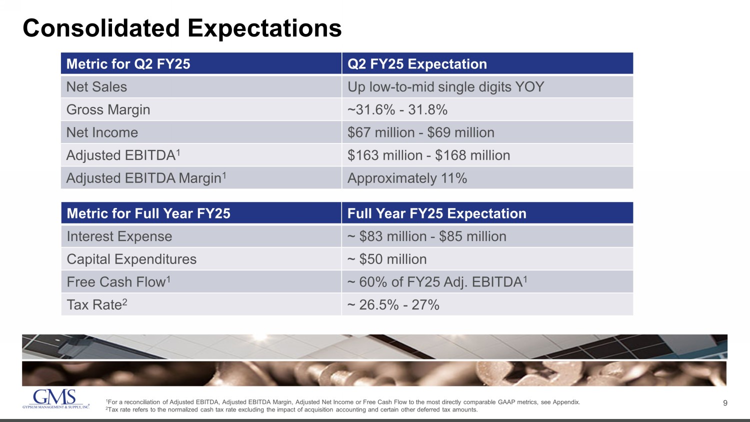 8 End Market & Product - Level Expectations Product Category Q2 FY25 YOY Volume Expectations Q2 FY25 YOY Price/Mix Expectations Organic Total (Incl. acquisitions) •Single - family: Up mid - single digits •Multi - family: Down low - double digits •Commercial: Down high - single digits Total Wallboard: Flat to down low - single digits Up low - single digits Up slightly Ceilings: Up low - single digits Up low - double digits Flat to up low - single digits Steel Framing: Down mid - to - high single digits Up low - single digits Down low - teens Complementary Products: Sales growth in the mid single digits or just better than that