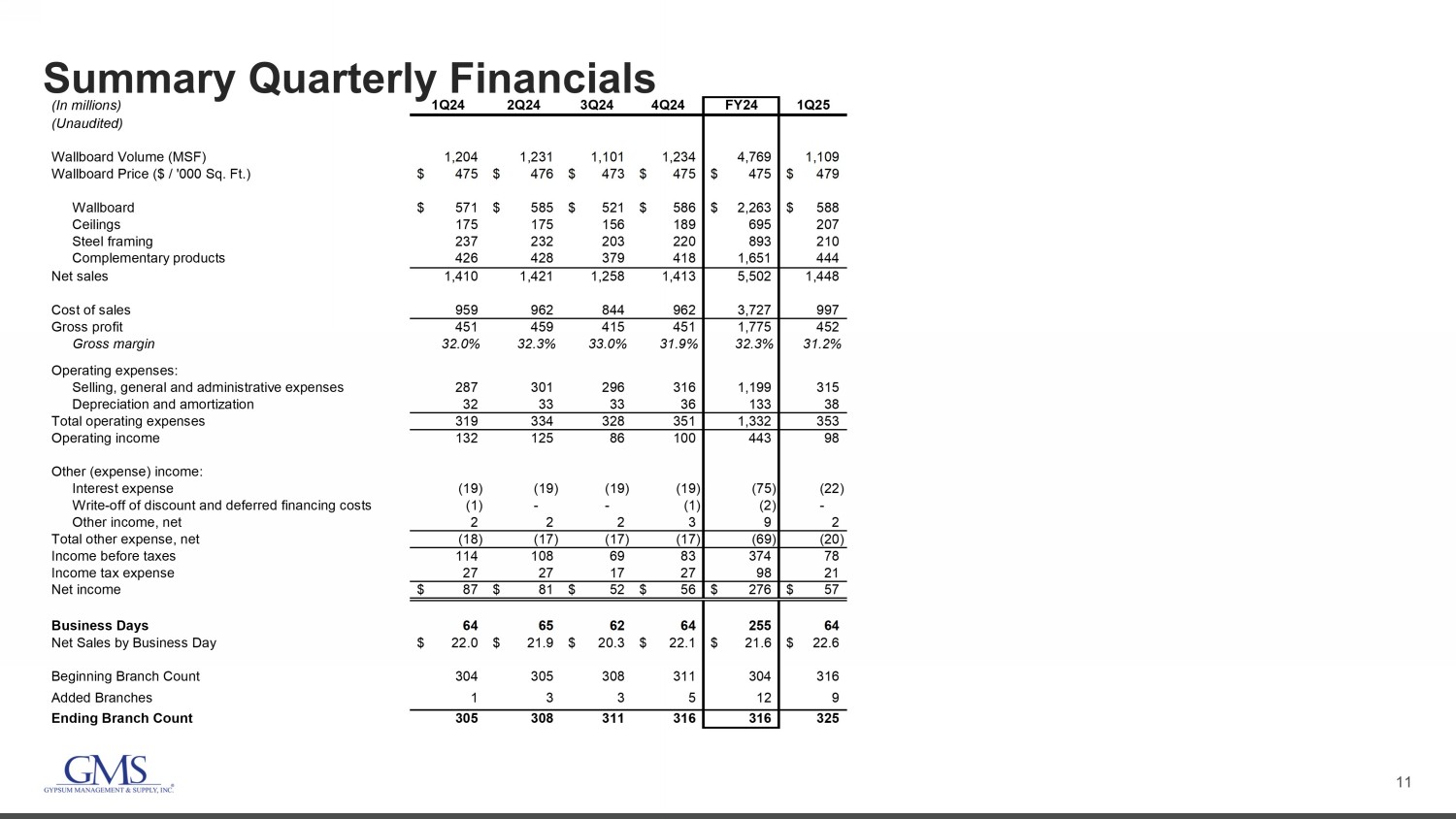 11 Summary Quarterly Financials (In millions) 1Q24 2Q24 3Q24 4Q24 FY24 1Q25 (Unaudited) Wallboard Volume (MSF) 1,204 1,231 1,101 1,234 4,769 1,109 Wallboard Price ($ / '000 Sq. Ft.) 475$ 476$ 473$ 475$ 475$ 479$ Wallboard 571$ 585$ 521$ 586$ 2,263$ 588$ Ceilings 175 175 156 189 695 207 Steel framing 237 232 203 220 893 210 Complementary products 426 428 379 418 1,651 444 Net sales 1,410 1,421 1,258 1,413 5,502 1,448 Cost of sales 959 962 844 962 3,727 997 Gross profit 451 459 415 451 1,775 452 Gross margin 32.0% 32.3% 33.0% 31.9% 32.3% 31.2% Operating expenses: Selling, general and administrative expenses 287 301 296 316 1,199 315 Depreciation and amortization 32 33 33 36 133 38 Total operating expenses 319 334 328 351 1,332 353 Operating income 132 125 86 100 443 98 Other (expense) income: Interest expense (19) (19) (19) (19) (75) (22) Write-off of discount and deferred financing costs (1) - - (1) (2) - Other income, net 2 2 2 3 9 2 Total other expense, net (18) (17) (17) (17) (69) (20) Income before taxes 114 108 69 83 374 78 Income tax expense 27 27 17 27 98 21 Net income 87$ 81$ 52$ 56$ 276$ 57$ Business Days 64 65 62 64 255 64 Net Sales by Business Day 22.0$ 21.9$ 20.3$ 22.1$ 21.6$ 22.6$ Beginning Branch Count 304 305 308 311 304 316 Added Branches 1 3 3 5 12 9 Ending Branch Count 305 308 311 316 316 325