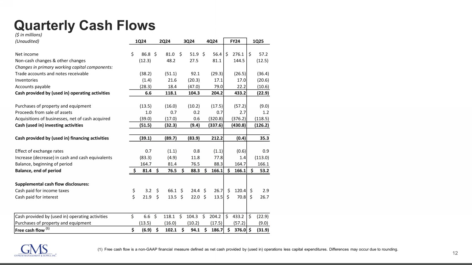 12 Quarterly Cash Flows (1) Free cash flow is a non - GAAP financial measure defined as net cash provided by (used in) operations less capital expenditures. D ifferences may occur due to rounding. ($ in millions) (Unaudited) 1Q24 2Q24 3Q24 4Q24 FY24 1Q25 Net income $ 86.8 $ 81.0 $ 51.9 $ 56.4 $ 276.1 $ 57.2 Non-cash changes & other changes (12.3) 48.2 27.5 81.1 144.5 (12.5) Changes in primary working capital components: Trade accounts and notes receivable (38.2) (51.1) 92.1 (29.3) (26.5) (36.4) Inventories (1.4) 21.6 (20.3) 17.1 17.0 (20.6) Accounts payable (28.3) 18.4 (47.0) 79.0 22.2 (10.6) Cash provided by (used in) operating activities 6.6 118.1 104.3 204.2 433.2 (22.9) Purchases of property and equipment (13.5) (16.0) (10.2) (17.5) (57.2) (9.0) Proceeds from sale of assets 1.0 0.7 0.2 0.7 2.7 1.2 Acquisitions of businesses, net of cash acquired (39.0) (17.0) 0.6 (320.8) (376.2) (118.5) Cash (used in) investing activities (51.5) (32.3) (9.4) (337.6) (430.8) (126.2) Cash provided by (used in) financing activities (39.1) (89.7) (83.9) 212.2 (0.4) 35.3 Effect of exchange rates 0.7 (1.1) 0.8 (1.1) (0.6) 0.9 Increase (decrease) in cash and cash equivalents (83.3) (4.9) 11.8 77.8 1.4 (113.0) Balance, beginning of period 164.7 81.4 76.5 88.3 164.7 166.1 Balance, end of period $ 81.4 $ 76.5 $ 88.3 $ 166.1 $ 166.1 $ 53.2 Supplemental cash flow disclosures: Cash paid for income taxes $ 3.2 $ 66.1 $ 24.4 $ 26.7 $ 120.4 $ 2.9 Cash paid for interest $ 21.9 $ 13.5 $ 22.0 $ 13.5 $ 70.8 $ 26.7 Cash provided by (used in) operating activities $ 6.6 $ 118.1 $ 104.3 $ 204.2 $ 433.2 $ (22.9) Purchases of property and equipment (13.5) (16.0) (10.2) (17.5) (57.2) (9.0) Free cash flow (1) $ (6.9) $ 102.1 $ 94.1 $ 186.7 $ 376.0 $ (31.9)