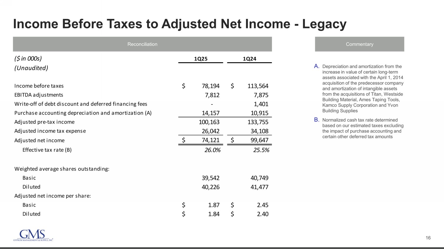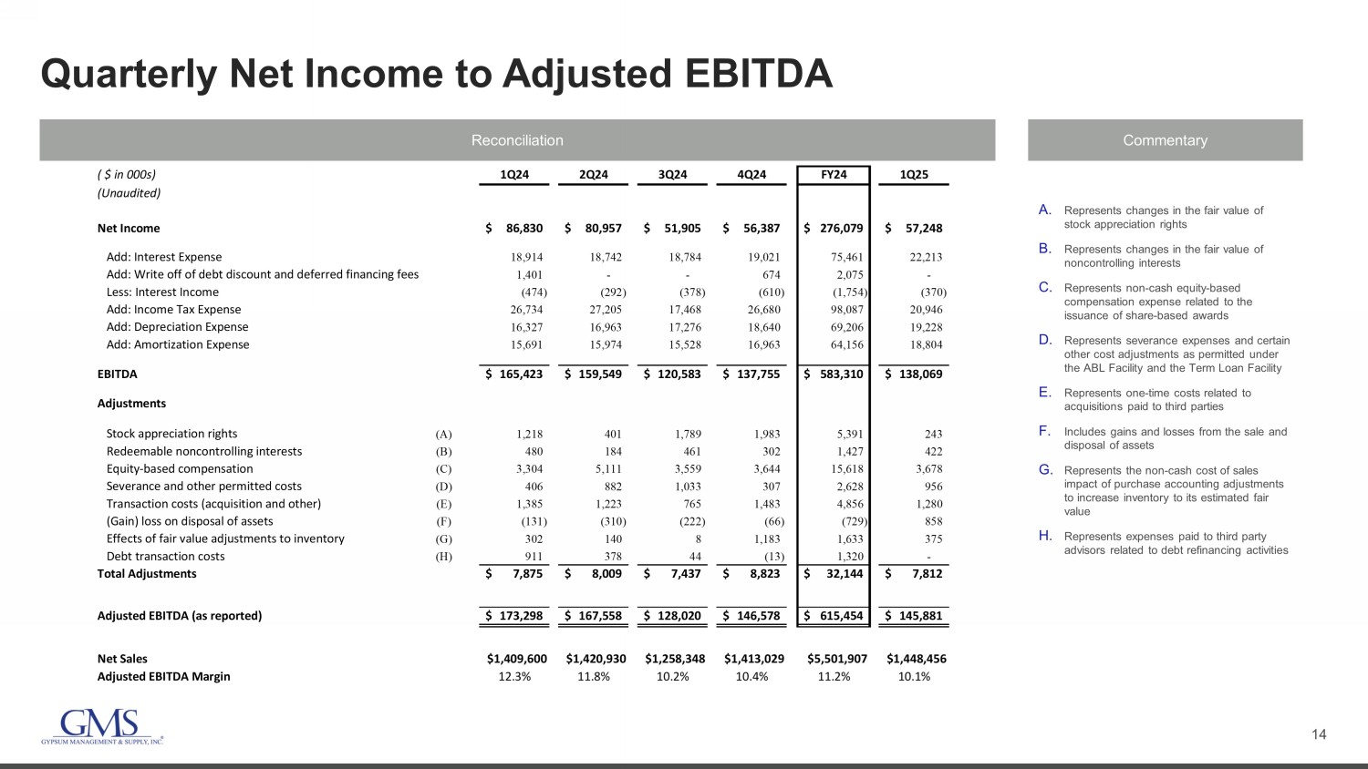 15 Net Income to Pro Forma Adjusted EBITDA Reconciliation Commentary A. Represents changes in the fair value of stock appreciation rights B. Represents changes in the fair value of noncontrolling interests C. Represents non - cash equity - based compensation expense related to the issuance of share - based awards D. Represents severance expenses and certain other cost adjustments as permitted under the ABL Facility and the Term Loan Facility E. Represents one - time costs related to our initial public offering and acquisitions paid to third party advisors as well as costs related to the retirement of corporate stock appreciation rights F. Represents the non - cash cost of sales impact of purchase accounting adjustments to increase inventory to its estimated fair value G. Represents mark - to - market adjustments for derivative financial instruments H. Represents one - time costs related to our secondary offerings paid to third party advisors I. Represents expenses paid to third party advisors related to debt refinancing activities J. Pro forma impact of earnings from acquisitions from the beginning of the LTM period to the date of acquisition, including synergies ( $ in 000s) LTM FY25 Q1 2024 2023 2022 2021 2020 2019 2018 2017(Unaudited) Net Income 246,497$ 276,079$ 332,991$ 273,442$ 105,560$ 23,381$ 56,002$ 62,971$ 48,886$ Add: Interest Expense 78,760 75,461 65,843 58,097 53,786 67,718 73,677 31,395 29,360 Add: Write off of debt discount and deferred financing fees 674 2,075 - - 4,606 1,331 - 74 7,103 Less: Interest Income (1,650) (1,754) (1,287) (163) (86) (88) (66) (177) (152) Add: Income Tax Expense 92,299 98,087 114,512 91,377 31,534 22,944 14,039 20,883 22,654 Add: Depreciation Expense 72,107 69,206 61,177 55,437 50,480 51,332 46,456 24,075 25,565 Add: Amortization Expense 67,269 64,156 65,730 63,795 57,645 65,201 71,003 41,455 43,675 EBITDA 555,956$ 583,310$ 638,966$ 541,985$ 303,525$ 231,819$ 261,111$ 180,676$ 177,091$ Adjustments Impairment of goodwill - - 63,074 - - - Stock appreciation rights (A) 4,416 5,391 7,703 4,403 3,173 1,572 2,730 2,318 148 Redeemable noncontrolling interests (B) 1,369 1,427 1,178 1,983 1,288 520 1,188 1,868 3,536 Equity-based compensation (C) 15,992 15,618 13,217 10,968 8,442 7,060 3,906 1,695 2,534 Severance and other permitted costs (D) 3,178 2,628 2,788 1,132 2,948 5,733 8,152 581 (157) Transaction costs (acquisition and other) (E) 4,751 4,856 1,961 3,545 1,068 2,414 7,858 3,370 2,249 (Gain) loss on disposal of assets 260 (729) (1,413) (913) (1,011) 658 (525) (509) (338) Effects of fair value adjustments to inventory (F) 1,706 1,633 1,123 3,818 788 575 4,176 324 946 Gain on legal settlement - - - - (1,382) (14,029) - - - Change in fair value of financial instruments (G) - - - - - - 6,395 6,125 382 Secondary public offerings (H) - - - - - 363 - 1,525 1,385 Debt transaction costs (I) 409 1,320 173 - 532 - 678 1,285 265 Total Adjustments 32,081$ 32,144$ 26,730$ 24,936$ 15,846$ 67,940$ 34,558$ 18,582$ 11,138$ Adjusted EBITDA (as reported) 588,037$ 615,454$ 665,696$ 566,921$ 319,371$ 299,759$ 295,669$ 199,258$ 188,229$ Contributions from acquisitions (J) 35,211 24,213 9,535 21,348 4,948 1,480 6,717 1,280 9,500 Pro Forma Adjusted EBITDA 623,248$ 639,667$ 675,231$ 588,269$ 324,319$ 301,239$ 302,386$ 200,538$ 197,729$ Net Sales $5,540,763 $5,501,907 $5,329,252 $4,634,875 $3,298,823 $3,241,307 $3,116,032 $2,511,469 $2,319,146 Adjusted EBITDA margin (as reported) 10.6% 11.2% 12.5% 12.2% 9.7% 9.2% 9.5% 7.9% 8.1%