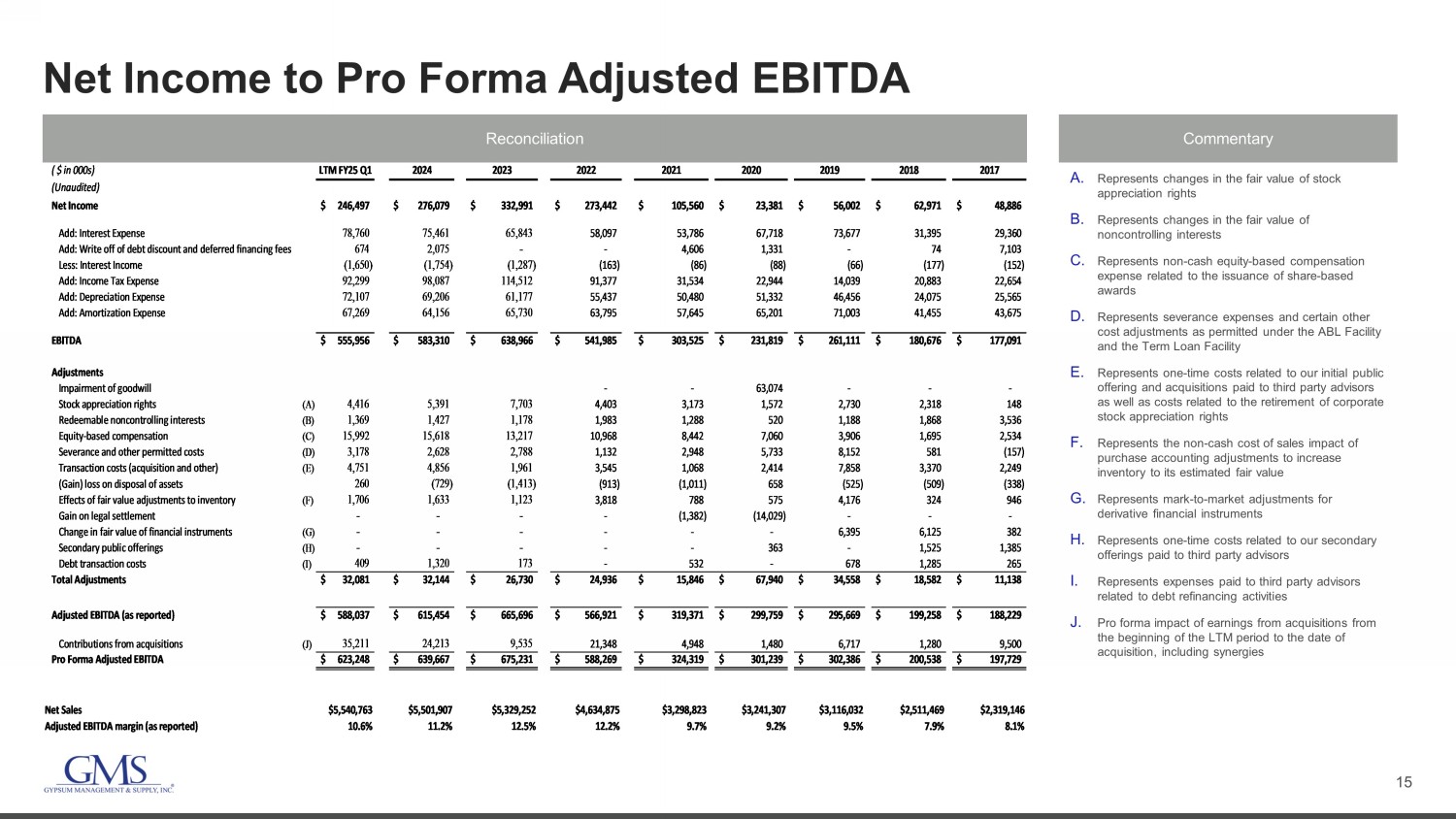 14 Quarterly Net Income to Adjusted EBITDA Reconciliation Commentary A. Represents changes in the fair value of stock appreciation rights B. Represents changes in the fair value of noncontrolling interests C. Represents non - cash equity - based compensation expense related to the issuance of share - based awards D. Represents severance expenses and certain other cost adjustments as permitted under the ABL Facility and the Term Loan Facility E. Represents one - time costs related to acquisitions paid to third parties F. Includes gains and losses from the sale and disposal of assets G. Represents the non - cash cost of sales impact of purchase accounting adjustments to increase inventory to its estimated fair value H. Represents expenses paid to third party advisors related to debt refinancing activities ( $ in 000s) 1Q24 2Q24 3Q24 4Q24 FY24 1Q25 (Unaudited) Net Income 86,830$ 80,957$ 51,905$ 56,387$ 276,079$ 57,248$ Add: Interest Expense 18,914 18,742 18,784 19,021 75,461 22,213 Add: Write off of debt discount and deferred financing fees 1,401 - - 674 2,075 - Less: Interest Income (474) (292) (378) (610) (1,754) (370) Add: Income Tax Expense 26,734 27,205 17,468 26,680 98,087 20,946 Add: Depreciation Expense 16,327 16,963 17,276 18,640 69,206 19,228 Add: Amortization Expense 15,691 15,974 15,528 16,963 64,156 18,804 EBITDA 165,423$ 159,549$ 120,583$ 137,755$ 583,310$ 138,069$ Adjustments Stock appreciation rights (A) 1,218 401 1,789 1,983 5,391 243 Redeemable noncontrolling interests (B) 480 184 461 302 1,427 422 Equity-based compensation (C) 3,304 5,111 3,559 3,644 15,618 3,678 Severance and other permitted costs (D) 406 882 1,033 307 2,628 956 Transaction costs (acquisition and other) (E) 1,385 1,223 765 1,483 4,856 1,280 (Gain) loss on disposal of assets (F) (131) (310) (222) (66) (729) 858 Effects of fair value adjustments to inventory (G) 302 140 8 1,183 1,633 375 Debt transaction costs (H) 911 378 44 (13) 1,320 - Total Adjustments 7,875$ 8,009$ 7,437$ 8,823$ 32,144$ 7,812$ Adjusted EBITDA (as reported) 173,298$ 167,558$ 128,020$ 146,578$ 615,454$ 145,881$ Net Sales $1,409,600 $1,420,930 $1,258,348 $1,413,029 $5,501,907 $1,448,456 Adjusted EBITDA Margin 12.3% 11.8% 10.2% 10.4% 11.2% 10.1%