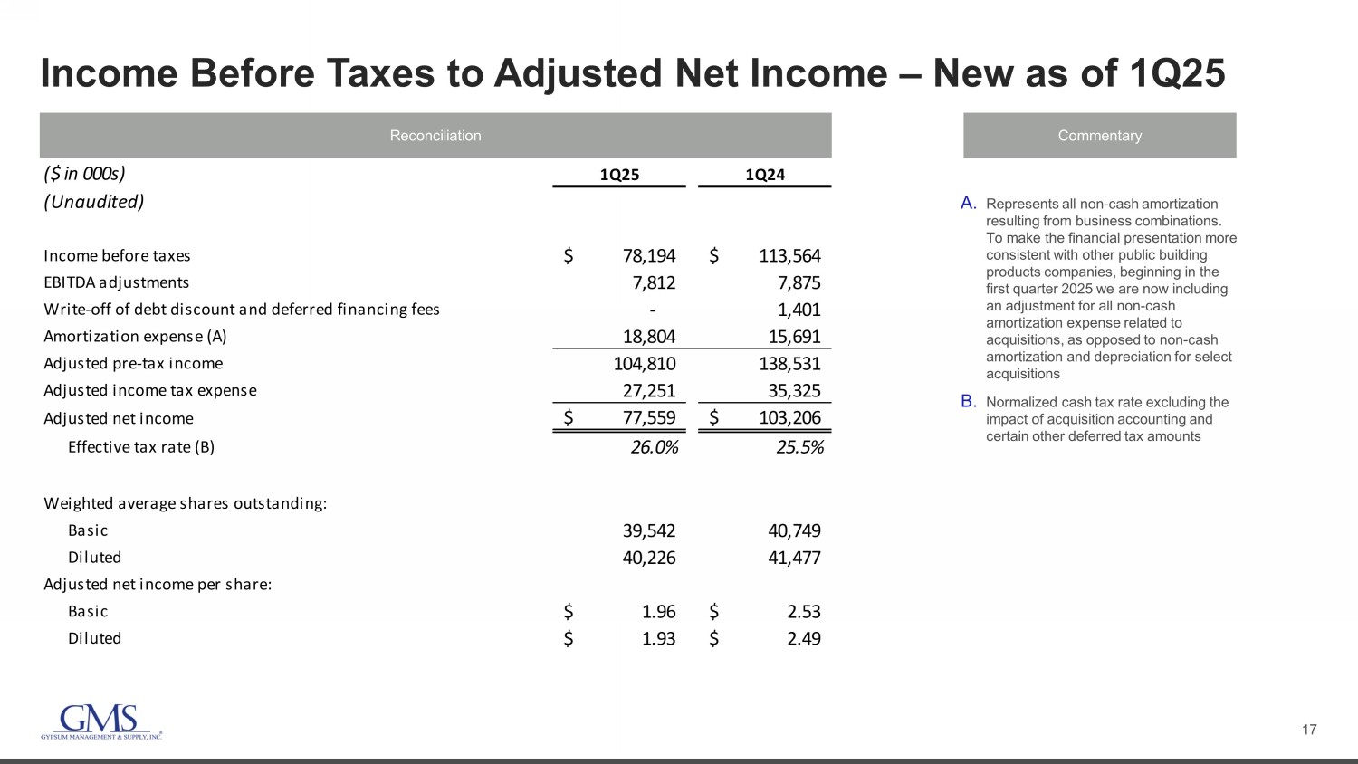 16 Income Before Taxes to Adjusted Net Income - Legacy Reconciliation Commentary A. Depreciation and amortization from the increase in value of certain long - term assets associated with the April 1, 2014 acquisition of the predecessor company and amortization of intangible assets from the acquisitions of Titan, Westside Building Material, Ames Taping Tools, Kamco Supply Corporation and Yvon Building Supplies B. Normalized cash tax rate determined based on our estimated taxes excluding the impact of purchase accounting and certain other deferred tax amounts ($ in 000s) 1Q25 1Q24 (Unaudited) Income before taxes 78,194$ 113,564$ EBITDA adjustments 7,812 7,875 Write-off of debt discount and deferred financing fees - 1,401 Purchase accounting depreciation and amortization (A) 14,157 10,915 Adjusted pre-tax income 100,163 133,755 Adjusted income tax expense 26,042 34,108 Adjusted net income 74,121$ 99,647$ Effective tax rate (B) 26.0% 25.5% Weighted average shares outstanding: Basic 39,542 40,749 Diluted 40,226 41,477 Adjusted net income per share: Basic 1.87$ 2.45$ Diluted 1.84$ 2.40$