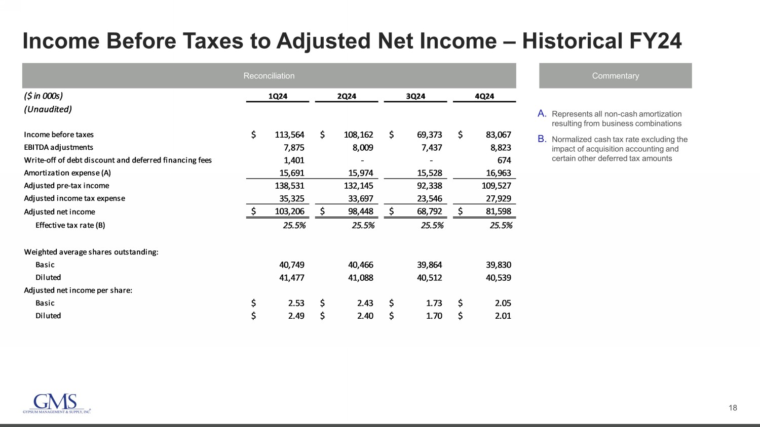 17 Income Before Taxes to Adjusted Net Income – New as of 1Q25 Reconciliation Commentary A. Represents all non - cash amortization resulting from business combinations. To make the financial presentation more consistent with other public building products companies, beginning in the first quarter 2025 we are now including an adjustment for all non - cash amortization expense related to acquisitions, as opposed to non - cash amortization and depreciation for select acquisitions B. Normalized cash tax rate excluding the impact of acquisition accounting and certain other deferred tax amounts ($ in 000s) 1Q25 1Q24 (Unaudited) Income before taxes 78,194$ 113,564$ EBITDA adjustments 7,812 7,875 Write-off of debt discount and deferred financing fees - 1,401 Amortization expense (A) 18,804 15,691 Adjusted pre-tax income 104,810 138,531 Adjusted income tax expense 27,251 35,325 Adjusted net income 77,559$ 103,206$ Effective tax rate (B) 26.0% 25.5% Weighted average shares outstanding: Basic 39,542 40,749 Diluted 40,226 41,477 Adjusted net income per share: Basic 1.96$ 2.53$ Diluted 1.93$ 2.49$