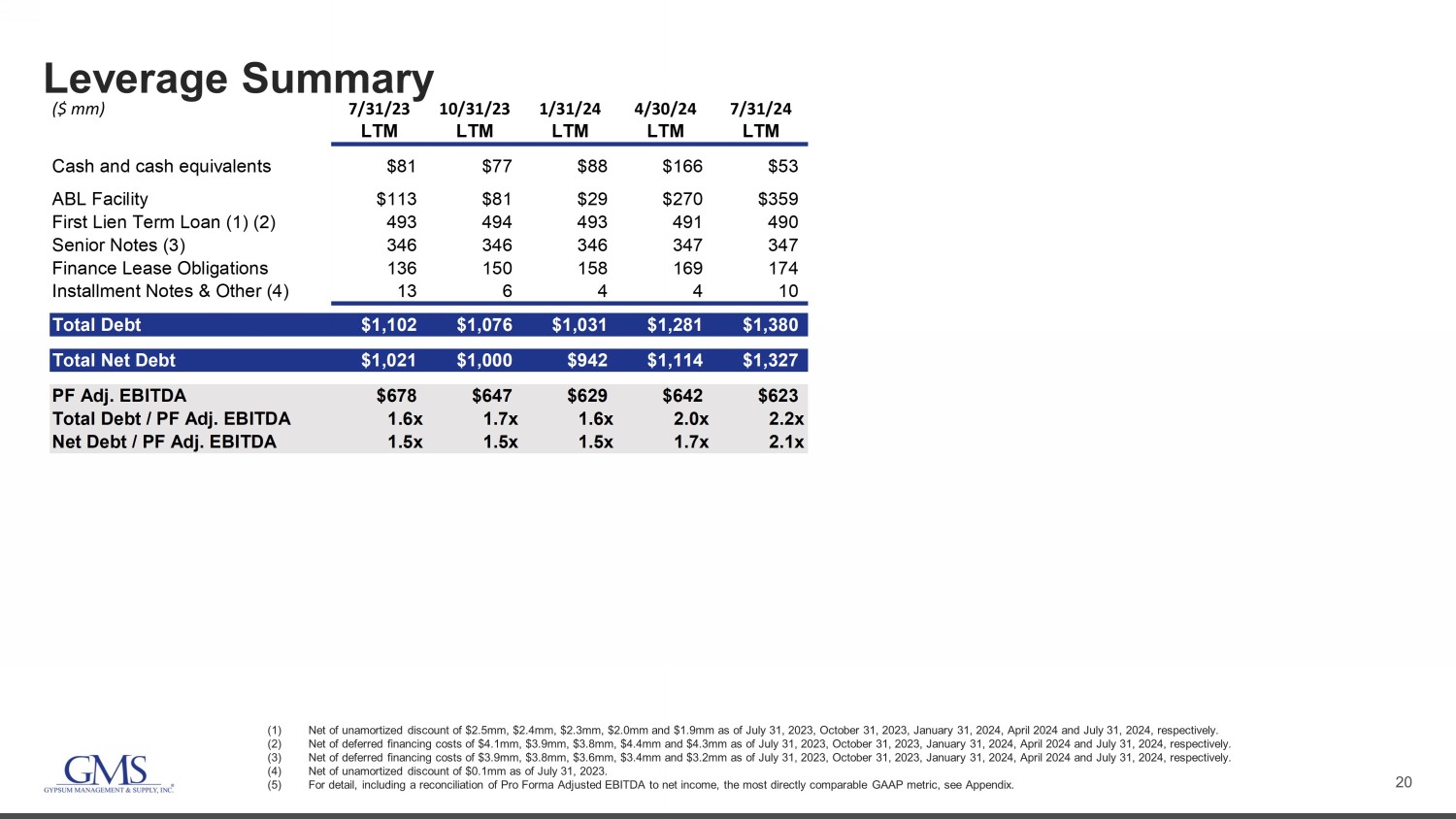19 Reported SG&A to Adjusted SG&A Reconciliation Commentary A. Represents changes in the fair value of stock appreciation rights B. Represents changes in the fair value of noncontrolling interests C. Represents non - cash equity - based compensation expense related to the issuance of share - based awards D. Represents severance expenses and certain other cost adjustments as permitted under the ABL Facility and the Term Loan Facility E. Represents one - time costs related to acquisitions paid to third parties (Unaudited) 1Q24 2Q24 3Q24 3Q24 FY2024 1Q25 ($ in millions) SG&A - Reported 286.8$ 300.9$ 295.7$ 315.5$ 1,198.9$ 315.2$ Adjustments Stock appreciation rights (A) (1.2) (0.4) (1.8) (2.0) (5.4) (0.2) Redeemable noncontrolling interests (B) (0.5) (0.2) (0.5) (0.3) (1.4) (0.4) Equity-based compensation (C) (3.3) (5.1) (3.6) (3.6) (15.6) (3.7) Severance and other permitted costs (D) (0.4) (0.9) (1.0) (0.3) (2.6) (1.0) Transaction costs (acquisition and other) (E) (1.4) (1.2) (0.8) (1.5) (4.9) (1.3) Gain (loss) on disposal of assets (F) 0.1 0.3 0.2 0.1 0.7 (0.9) Debt transaction costs (G) (0.9) (0.4) (0.0) 0.0 (1.3) - SG&A - Adjusted 279.2$ 293.0$ 288.3$ 307.9$ 1,168.4$ 307.7$ Net Sales 1,409.6$ 1,420.9$ 1,258.3$ 1,413.0$ 5,501.9$ 1,448.5$ Adjusted SG&A Margin 19.8% 20.6% 22.9% 21.8% 21.2% 21.2%