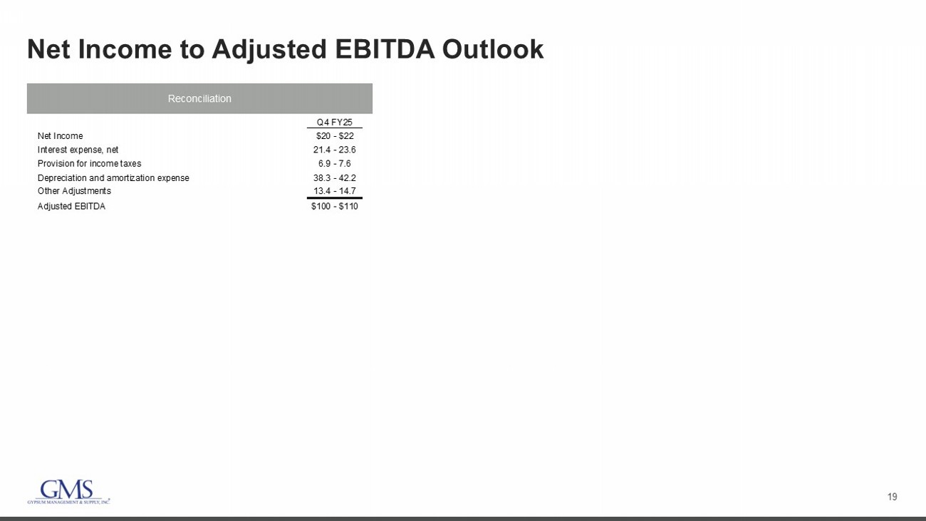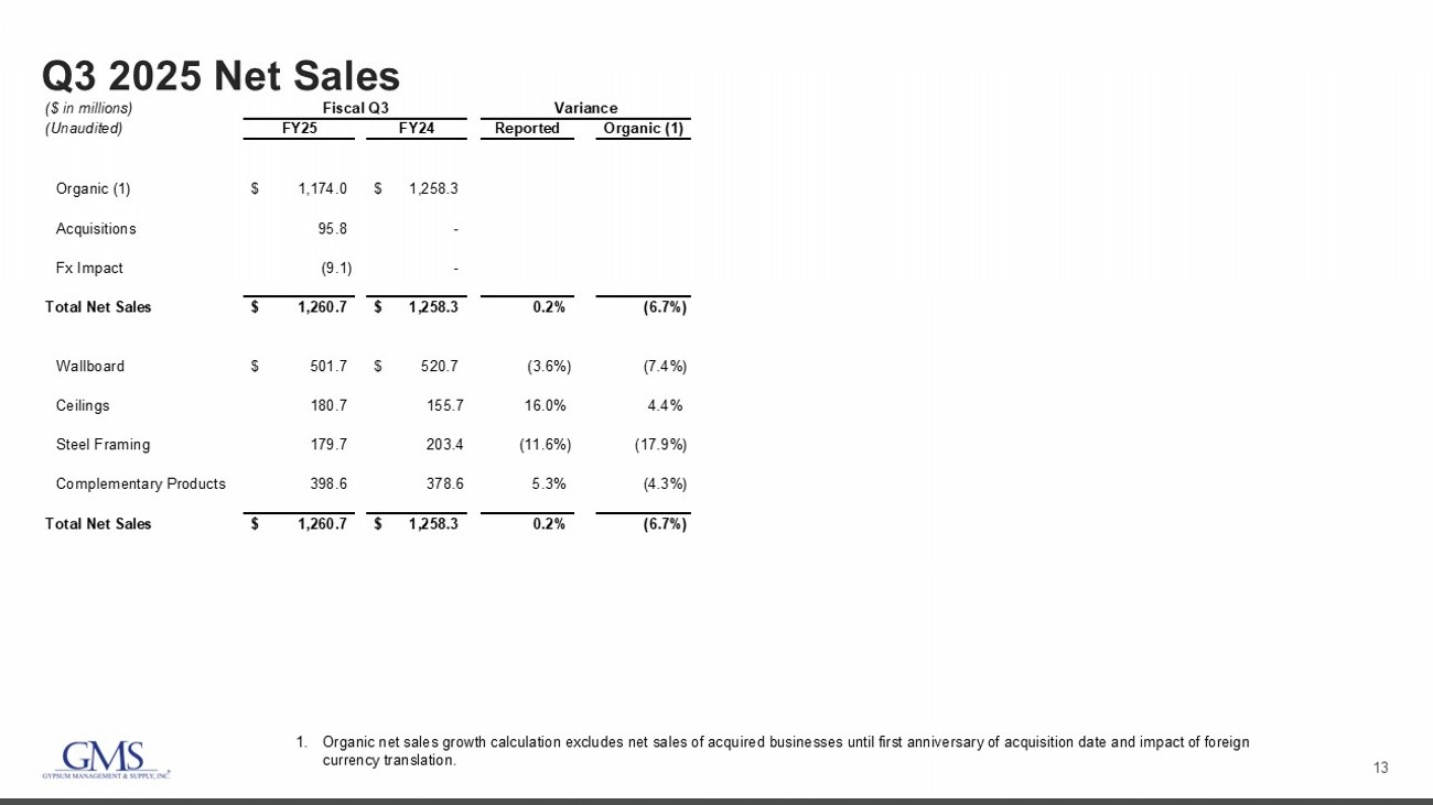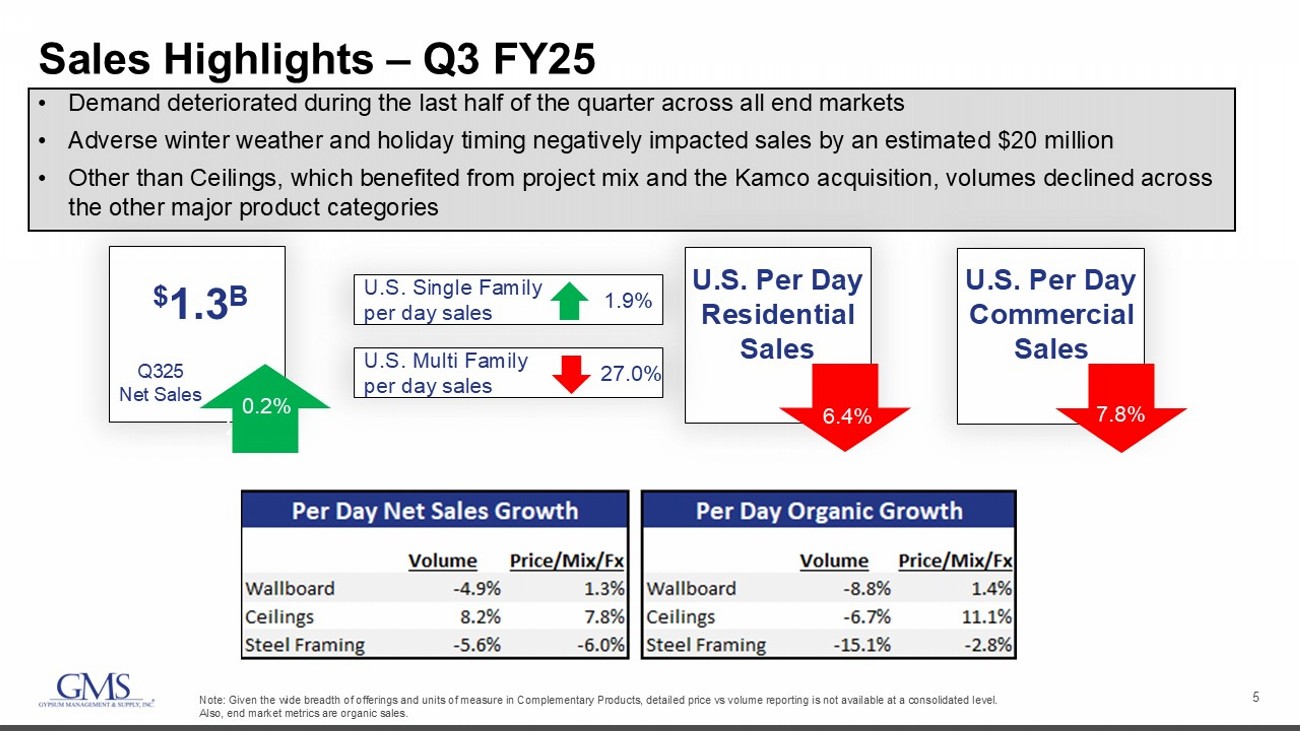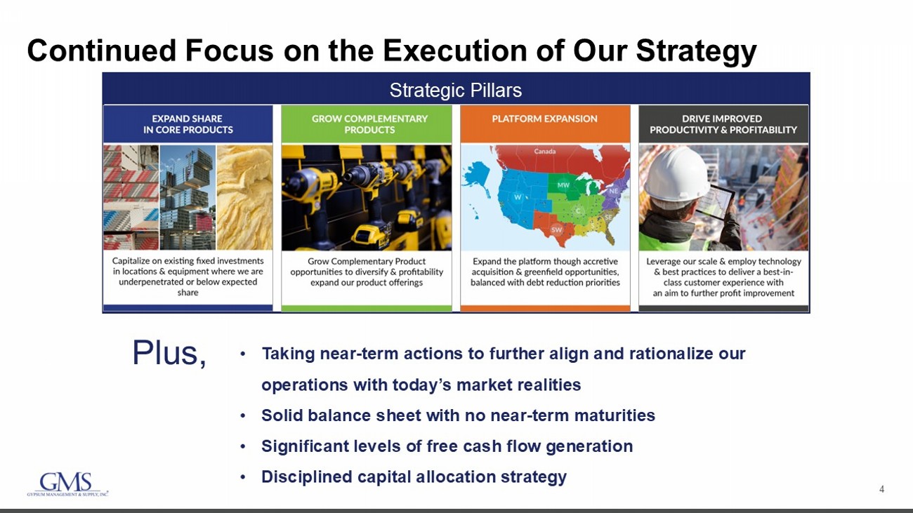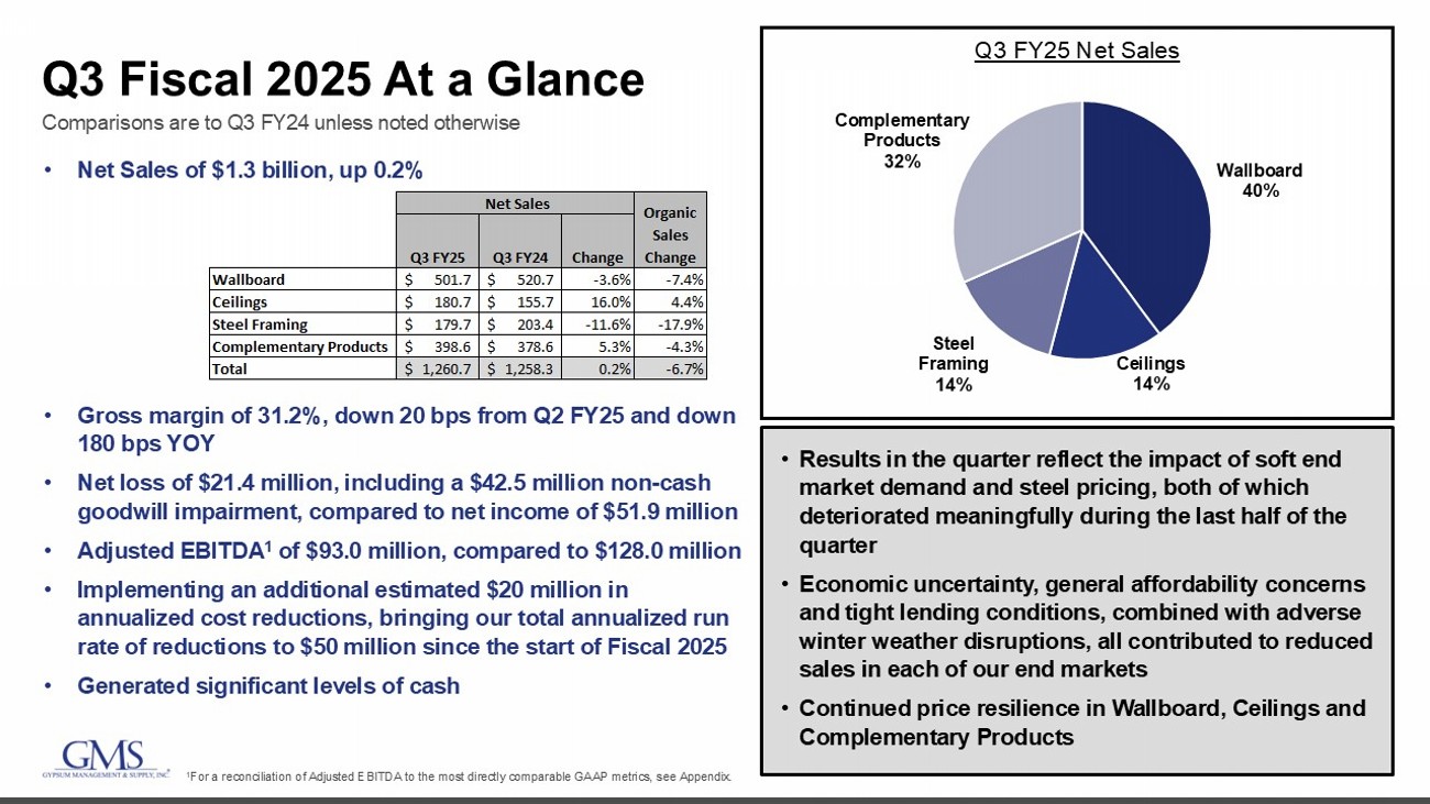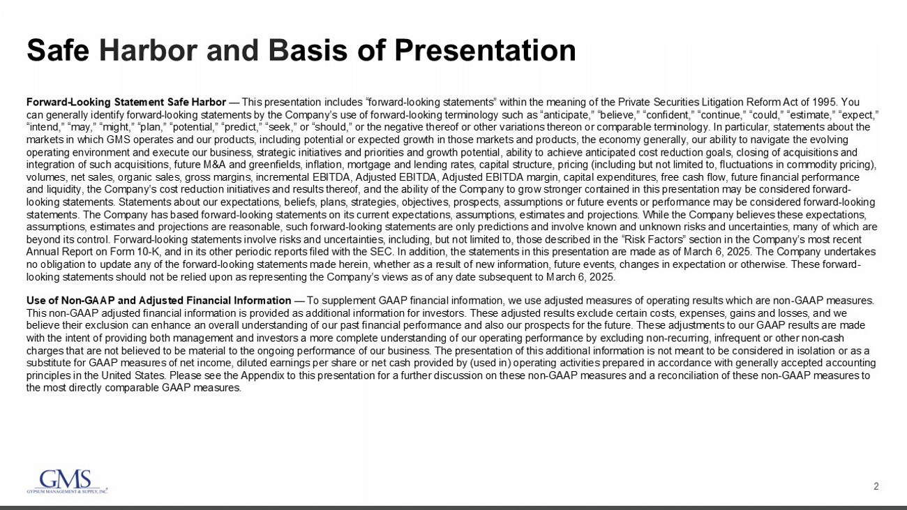 2 Safe Harbor and B asis of Presentation Forward - Looking Statement Safe Harbor — This presentation includes “forward - looking statements” within the meaning of the Private Securities Litigation Reform Act of 1995. You can generally identify forward - looking statements by the Company’s use of forward - looking terminology such as “anticipate,” “bel ieve,” “confident,” “continue,” “could,” “estimate,” “expect,” “intend,” “may,” “might,” “plan,” “potential,” “predict,” “seek,” or “should,” or the negative thereof or other variations th ere on or comparable terminology. In particular, statements about the markets in which GMS operates and our products, including potential or expected growth in those markets and products, the eco nom y generally, our ability to navigate the evolving operating environment and execute our business, strategic initiatives and priorities and growth potential, ability to achieve an ticipated cost reduction goals, closing of acquisitions and integration of such acquisitions, future M&A and greenfields, inflation, mortgage and lending rates, capital structure, prici ng (including but not limited to, fluctuations in commodity pricing), volumes, net sales, organic sales, gross margins, incremental EBITDA, Adjusted EBITDA, Adjusted EBITDA margin, capital expend itu res, free cash flow, future financial performance and liquidity, the Company’s cost reduction initiatives and results thereof, and the ability of the Company to grow stronger con tained in this presentation may be considered forward - looking statements. Statements about our expectations, beliefs, plans, strategies, objectives, prospects, assumptions or futu re events or performance may be considered forward - looking statements. The Company has based forward - looking statements on its current expectations, assumptions, estimates and projections . While the Company believes these expectations, assumptions, estimates and projections are reasonable, such forward - looking statements are only predictions and involve known an d unknown risks and uncertainties, many of which are beyond its control. Forward - looking statements involve risks and uncertainties, including, but not limited to, those described i n the “Risk Factors” section in the Company’s most recent Annual Report on Form 10 - K, and in its other periodic reports filed with the SEC. In addition, the statements in this presentati on are made as of March 6, 2025. The Company undertakes no obligation to update any of the forward - looking statements made herein, whether as a result of new information, future events , changes in expectation or otherwise. These forward - looking statements should not be relied upon as representing the Company’s views as of any date subsequent to March 6, 2025. Use of Non - GAAP and Adjusted Financial Information — To supplement GAAP financial information, we use adjusted measures of operating results which are non - GAAP measures. This non - GAAP adjusted financial information is provided as additional information for investors. These adjusted results exclude certain costs, expenses, gains and losses, and we believe their exclusion can enhance an overall understanding of our past financial performance and also our prospects for the fu ture. These adjustments to our GAAP results are made with the intent of providing both management and investors a more complete understanding of our operating performance by excl udi ng non - recurring, infrequent or other non - cash charges that are not believed to be material to the ongoing performance of our business. The presentation of this additional inf ormation is not meant to be considered in isolation or as a substitute for GAAP measures of net income, diluted earnings per share or net cash provided by (used in) operating activities pr epared in accordance with generally accepted accounting principles in the United States. Please see the Appendix to this presentation for a further discussion on these non - GAAP measure s and a reconciliation of these non - GAAP measures to the most directly comparable GAAP measures.