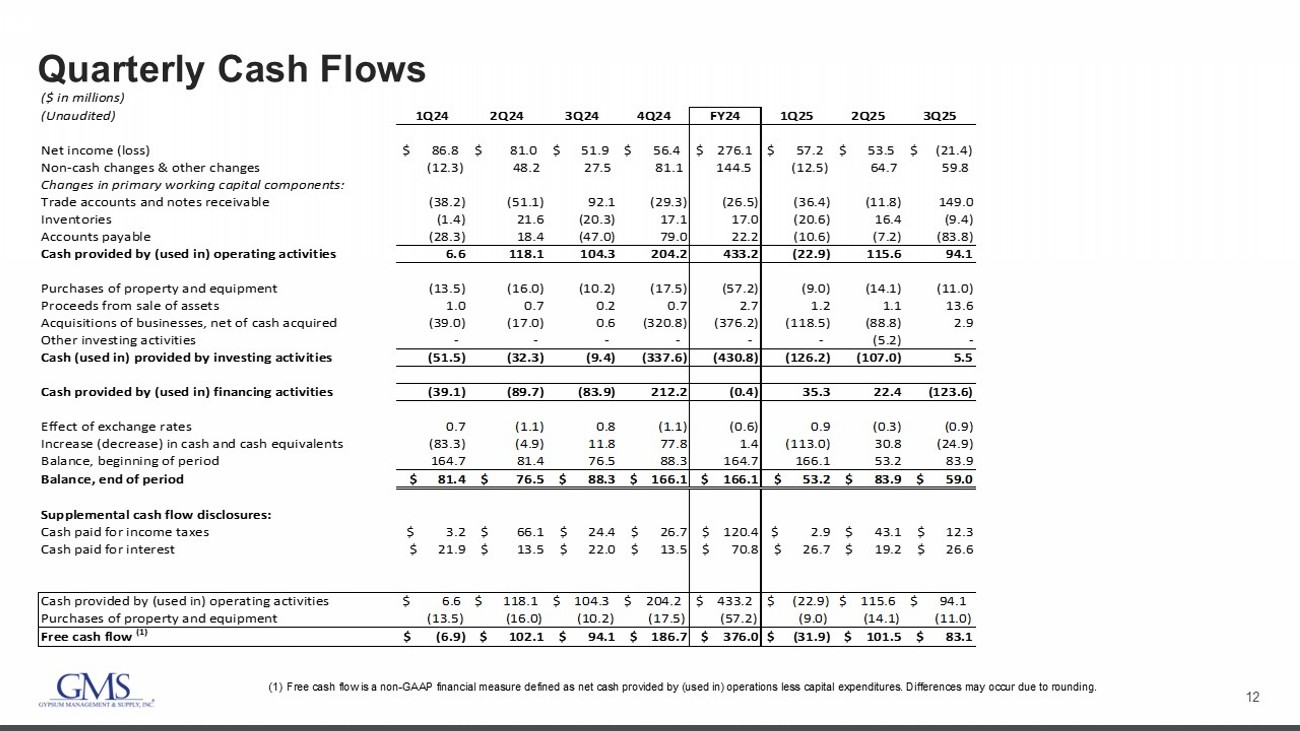 12 Quarterly Cash Flows (1) Free cash flow is a non - GAAP financial measure defined as net cash provided by (used in) operations less capital expenditures. D ifferences may occur due to rounding. ($ in millions) (Unaudited) 1Q24 2Q24 3Q24 4Q24 FY24 1Q25 2Q25 3Q25 Net income (loss) $ 86.8 $ 81.0 $ 51.9 $ 56.4 $ 276.1 $ 57.2 $ 53.5 $ (21.4) Non-cash changes & other changes (12.3) 48.2 27.5 81.1 144.5 (12.5) 64.7 59.8 Changes in primary working capital components: Trade accounts and notes receivable (38.2) (51.1) 92.1 (29.3) (26.5) (36.4) (11.8) 149.0 Inventories (1.4) 21.6 (20.3) 17.1 17.0 (20.6) 16.4 (9.4) Accounts payable (28.3) 18.4 (47.0) 79.0 22.2 (10.6) (7.2) (83.8) Cash provided by (used in) operating activities 6.6 118.1 104.3 204.2 433.2 (22.9) 115.6 94.1 Purchases of property and equipment (13.5) (16.0) (10.2) (17.5) (57.2) (9.0) (14.1) (11.0) Proceeds from sale of assets 1.0 0.7 0.2 0.7 2.7 1.2 1.1 13.6 Acquisitions of businesses, net of cash acquired (39.0) (17.0) 0.6 (320.8) (376.2) (118.5) (88.8) 2.9 Other investing activities - - - - - - (5.2) - Cash (used in) provided by investing activities (51.5) (32.3) (9.4) (337.6) (430.8) (126.2) (107.0) 5.5 Cash provided by (used in) financing activities (39.1) (89.7) (83.9) 212.2 (0.4) 35.3 22.4 (123.6) Effect of exchange rates 0.7 (1.1) 0.8 (1.1) (0.6) 0.9 (0.3) (0.9) Increase (decrease) in cash and cash equivalents (83.3) (4.9) 11.8 77.8 1.4 (113.0) 30.8 (24.9) Balance, beginning of period 164.7 81.4 76.5 88.3 164.7 166.1 53.2 83.9 Balance, end of period $ 81.4 $ 76.5 $ 88.3 $ 166.1 $ 166.1 $ 53.2 $ 83.9 $ 59.0 Supplemental cash flow disclosures: Cash paid for income taxes $ 3.2 $ 66.1 $ 24.4 $ 26.7 $ 120.4 $ 2.9 $ 43.1 $ 12.3 Cash paid for interest $ 21.9 $ 13.5 $ 22.0 $ 13.5 $ 70.8 $ 26.7 $ 19.2 $ 26.6 Cash provided by (used in) operating activities $ 6.6 $ 118.1 $ 104.3 $ 204.2 $ 433.2 $ (22.9) $ 115.6 $ 94.1 Purchases of property and equipment (13.5) (16.0) (10.2) (17.5) (57.2) (9.0) (14.1) (11.0) Free cash flow (1) $ (6.9) $ 102.1 $ 94.1 $ 186.7 $ 376.0 $ (31.9) $ 101.5 $ 83.1