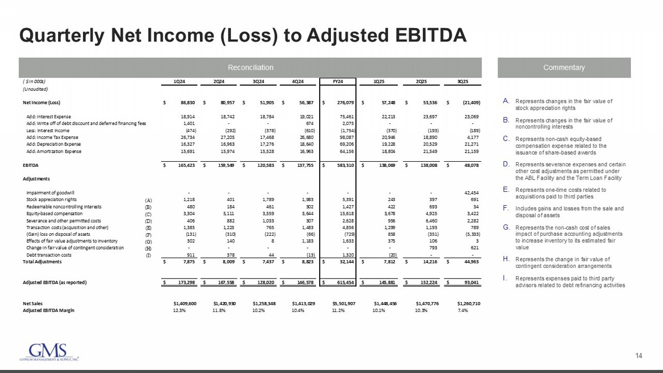 13 Q3 2025 Net Sales 1. Organic net sales growth calculation excludes net sales of acquired businesses until first anniversary of acquisition date an d i mpact of foreign currency translation. ($ in millions) (Unaudited) FY25 FY24 Reported Organic (1) Organic (1) 1,174.0$ 1,258.3$ Acquisitions 95.8 - Fx Impact (9.1) - Total Net Sales 1,260.7$ 1,258.3$ 0.2% (6.7%) Wallboard 501.7$ 520.7$ (3.6%) (7.4%) Ceilings 180.7 155.7 16.0% 4.4% Steel Framing 179.7 203.4 (11.6%) (17.9%) Complementary Products 398.6 378.6 5.3% (4.3%) Total Net Sales 1,260.7$ 1,258.3$ 0.2% (6.7%) Fiscal Q3 Variance