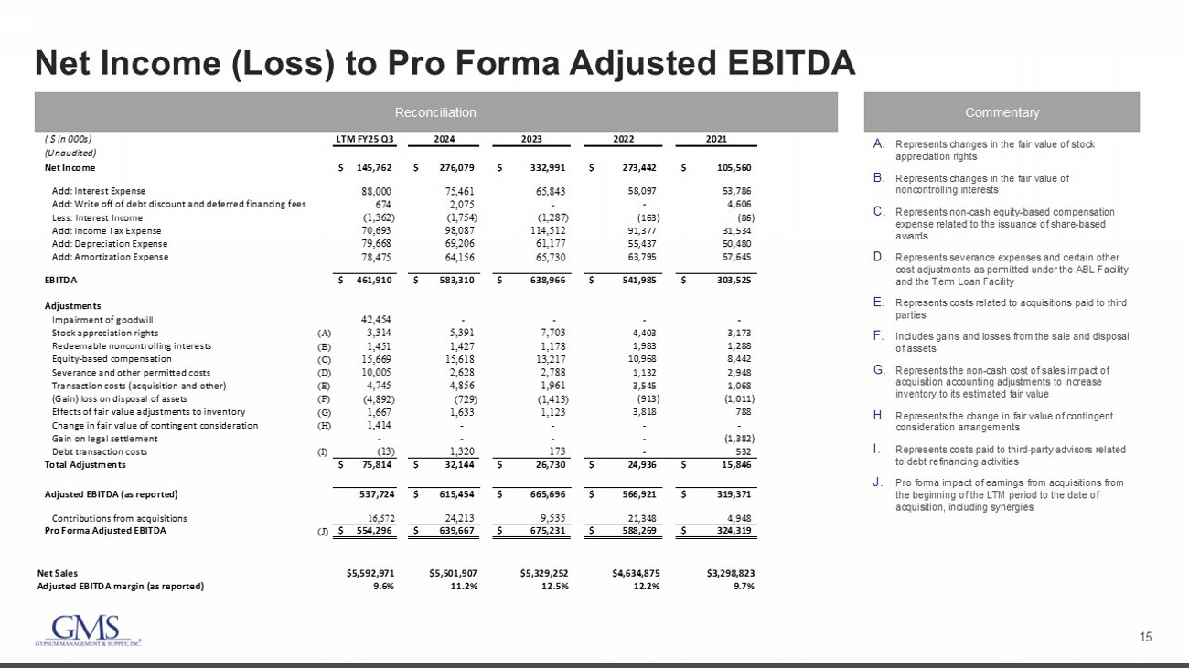 14 Quarterly Net Income (Loss) to Adjusted EBITDA Reconciliation Commentary A. Represents changes in the fair value of stock appreciation rights B. Represents changes in the fair value of noncontrolling interests C. Represents non - cash equity - based compensation expense related to the issuance of share - based awards D. Represents severance expenses and certain other cost adjustments as permitted under the ABL Facility and the Term Loan Facility E. Represents one - time costs related to acquisitions paid to third parties F. Includes gains and losses from the sale and disposal of assets G. Represents the non - cash cost of sales impact of purchase accounting adjustments to increase inventory to its estimated fair value H. Represents the change in fair value of contingent consideration arrangements I. Represents expenses paid to third party advisors related to debt refinancing activities ( $ in 000s) 1Q24 2Q24 3Q24 4Q24 FY24 1Q25 2Q25 3Q25 (Unaudited) Net Income (Loss) 86,830$ 80,957$ 51,905$ 56,387$ 276,079$ 57,248$ 53,536$ (21,409)$ Add: Interest Expense 18,914 18,742 18,784 19,021 75,461 22,213 23,697 23,069 Add: Write off of debt discount and deferred financing fees 1,401 - - 674 2,075 - - - Less: Interest Income (474) (292) (378) (610) (1,754) (370) (193) (189) Add: Income Tax Expense 26,734 27,205 17,468 26,680 98,087 20,946 18,890 4,177 Add: Depreciation Expense 16,327 16,963 17,276 18,640 69,206 19,228 20,529 21,271 Add: Amortization Expense 15,691 15,974 15,528 16,963 64,156 18,804 21,549 21,159 EBITDA 165,423$ 159,549$ 120,583$ 137,755$ 583,310$ 138,069$ 138,008$ 48,078$ Adjustments Impairment of goodwill - - - - - - - 42,454 Stock appreciation rights (A) 1,218 401 1,789 1,983 5,391 243 397 691 Redeemable noncontrolling interests (B) 480 184 461 302 1,427 422 693 34 Equity-based compensation (C) 3,304 5,111 3,559 3,644 15,618 3,678 4,925 3,422 Severance and other permitted costs (D) 406 882 1,033 307 2,628 956 6,460 2,282 Transaction costs (acquisition and other) (E) 1,385 1,223 765 1,483 4,856 1,299 1,193 789 (Gain) loss on disposal of assets (F) (131) (310) (222) (66) (729) 858 (351) (5,333) Effects of fair value adjustments to inventory (G) 302 140 8 1,183 1,633 375 106 3 Change in fair value of contingent consideration (H) - - - - - - 793 621 Debt transaction costs (I) 911 378 44 (13) 1,320 (20) - - Total Adjustments 7,875$ 8,009$ 7,437$ 8,823$ 32,144$ 7,812$ 14,216$ 44,963$ Adjusted EBITDA (as reported) 173,298$ 167,558$ 128,020$ 146,578$ 615,454$ 145,881$ 152,224$ 93,041$ Net Sales $1,409,600 $1,420,930 $1,258,348 $1,413,029 $5,501,907 $1,448,456 $1,470,776 $1,260,710 Adjusted EBITDA Margin 12.3% 11.8% 10.2% 10.4% 11.2% 10.1% 10.3% 7.4%