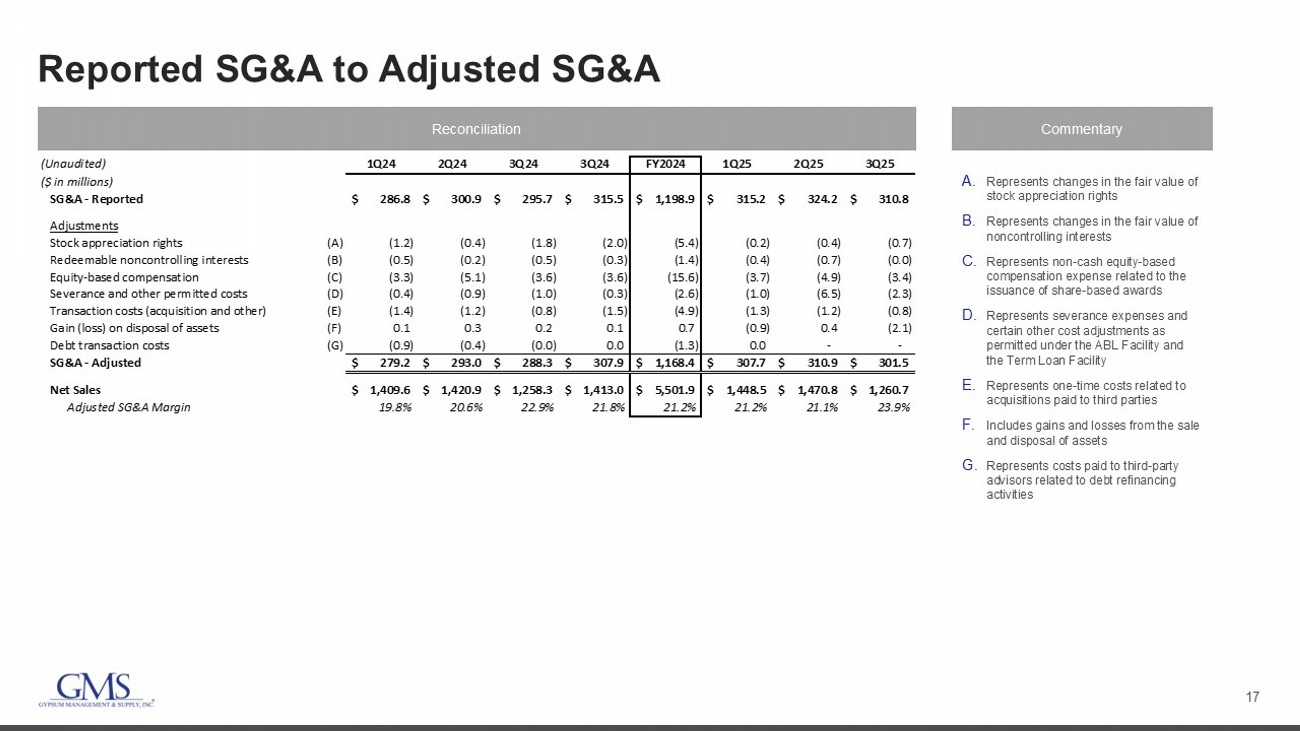 15 Net Income (Loss) to Pro Forma Adjusted EBITDA Reconciliation Commentary A. Represents changes in the fair value of stock appreciation rights B. Represents changes in the fair value of noncontrolling interests C. Represents non - cash equity - based compensation expense related to the issuance of share - based awards D. Represents severance expenses and certain other cost adjustments as permitted under the ABL Facility and the Term Loan Facility E. Represents costs related to acquisitions paid to third parties F. Includes gains and losses from the sale and disposal of assets G. Represents the non - cash cost of sales impact of acquisition accounting adjustments to increase inventory to its estimated fair value H. Represents the change in fair value of contingent consideration arrangements I. Represents costs paid to third - party advisors related to debt refinancing activities J. Pro forma impact of earnings from acquisitions from the beginning of the LTM period to the date of acquisition, including synergies ( $ in 000s) LTM FY25 Q3 2024 2023 2022 2021(Unaudited) Net Income 145,762$ 276,079$ 332,991$ 273,442$ 105,560$ Add: Interest Expense 88,000 75,461 65,843 58,097 53,786 Add: Write off of debt discount and deferred financing fees 674 2,075 - - 4,606 Less: Interest Income (1,362) (1,754) (1,287) (163) (86) Add: Income Tax Expense 70,693 98,087 114,512 91,377 31,534 Add: Depreciation Expense 79,668 69,206 61,177 55,437 50,480 Add: Amortization Expense 78,475 64,156 65,730 63,795 57,645 EBITDA 461,910$ 583,310$ 638,966$ 541,985$ 303,525$ Adjustments Impairment of goodwill 42,454 - - - - Stock appreciation rights (A) 3,314 5,391 7,703 4,403 3,173 Redeemable noncontrolling interests (B) 1,451 1,427 1,178 1,983 1,288 Equity-based compensation (C) 15,669 15,618 13,217 10,968 8,442 Severance and other permitted costs (D) 10,005 2,628 2,788 1,132 2,948 Transaction costs (acquisition and other) (E) 4,745 4,856 1,961 3,545 1,068 (Gain) loss on disposal of assets (F) (4,892) (729) (1,413) (913) (1,011) Effects of fair value adjustments to inventory (G) 1,667 1,633 1,123 3,818 788 Change in fair value of contingent consideration (H) 1,414 - - - - Gain on legal settlement - - - - (1,382) Debt transaction costs (I) (13) 1,320 173 - 532 Total Adjustments 75,814$ 32,144$ 26,730$ 24,936$ 15,846$ Adjusted EBITDA (as reported) 537,724 615,454$ 665,696$ 566,921$ 319,371$ Contributions from acquisitions 16,572 24,213 9,535 21,348 4,948 Pro Forma Adjusted EBITDA (J) 554,296$ 639,667$ 675,231$ 588,269$ 324,319$ Net Sales $5,592,971 $5,501,907 $5,329,252 $4,634,875 $3,298,823 Adjusted EBITDA margin (as reported) 9.6% 11.2% 12.5% 12.2% 9.7%