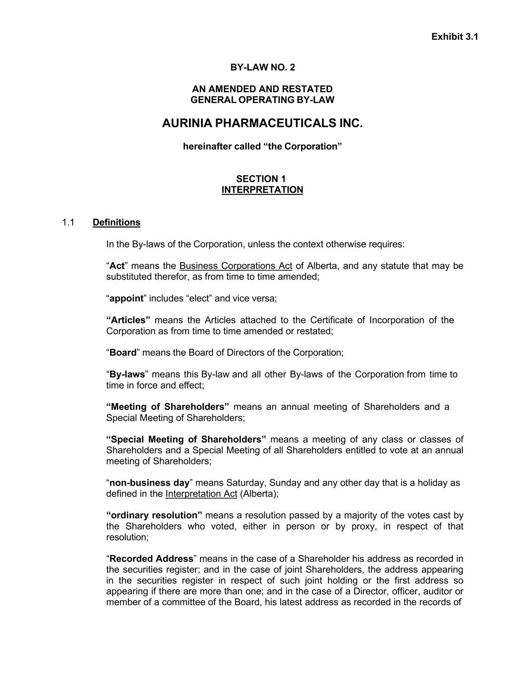 Exhibit 3.1 BY-LAW NO. 2 AN AMENDED AND RESTATED GENERAL OPERATING BY-LAW AURINIA PHARMACEUTICALS INC. hereinafter called “the Corporation” SECTION 1 INTERPRETATION 1.1 Definitions In the By-laws of the Corporation, unless the context otherwise requires: “Act” means the Business Corporations Act of Alberta, and any statute that may be substituted therefor, as from time to time amended; “appoint” includes “elect” and vice versa; “Articles” means the Articles attached to the Certificate of Incorporation of the Corporation as from time to time amended or restated; “Board” means the Board of Directors of the Corporation; “By-laws” means this By-law and all other By-laws of the Corporation from time to time in force and effect; “Meeting of Shareholders” means an annual meeting of Shareholders and a Special Meeting of Shareholders; “Special Meeting of Shareholders” means a meeting of any class or classes of Shareholders and a Special Meeting of all Shareholders entitled to vote at an annual meeting of Shareholders; “non-business day” means Saturday, Sunday and any other day that is a holiday as defined in the Interpretation Act (Alberta); “ordinary resolution” means a resolution passed by a majority of the votes cast by the Shareholders who voted, either in person or by proxy, in respect of that resolution; “Recorded Address” means in the case of a Shareholder his address as recorded in the securities register; and in the case of joint Shareholders, the address appearing in the securities register in respect of such joint holding or the first address so appearing if there are more than one; and in the case of a Director, officer, auditor or member of a committee of the Board, his latest address as recorded in the records of