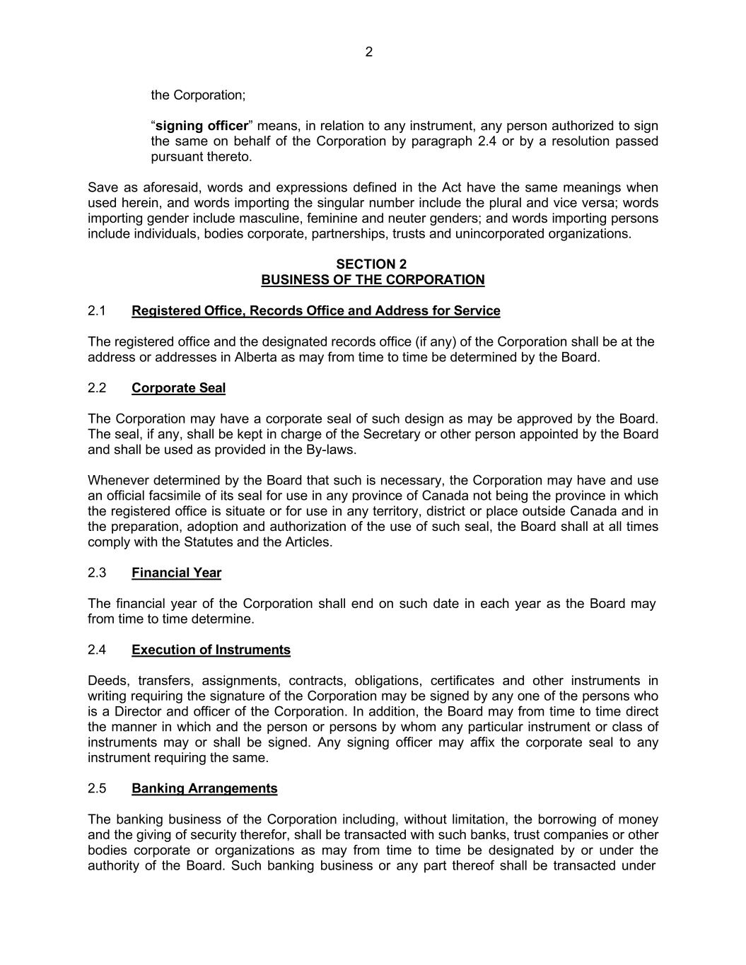 2 the Corporation; “signing officer” means, in relation to any instrument, any person authorized to sign the same on behalf of the Corporation by paragraph 2.4 or by a resolution passed pursuant thereto. Save as aforesaid, words and expressions defined in the Act have the same meanings when used herein, and words importing the singular number include the plural and vice versa; words importing gender include masculine, feminine and neuter genders; and words importing persons include individuals, bodies corporate, partnerships, trusts and unincorporated organizations. SECTION 2 BUSINESS OF THE CORPORATION 2.1 Registered Office, Records Office and Address for Service The registered office and the designated records office (if any) of the Corporation shall be at the address or addresses in Alberta as may from time to time be determined by the Board. 2.2 Corporate Seal The Corporation may have a corporate seal of such design as may be approved by the Board. The seal, if any, shall be kept in charge of the Secretary or other person appointed by the Board and shall be used as provided in the By-laws. Whenever determined by the Board that such is necessary, the Corporation may have and use an official facsimile of its seal for use in any province of Canada not being the province in which the registered office is situate or for use in any territory, district or place outside Canada and in the preparation, adoption and authorization of the use of such seal, the Board shall at all times comply with the Statutes and the Articles. 2.3 Financial Year The financial year of the Corporation shall end on such date in each year as the Board may from time to time determine. 2.4 Execution of Instruments Deeds, transfers, assignments, contracts, obligations, certificates and other instruments in writing requiring the signature of the Corporation may be signed by any one of the persons who is a Director and officer of the Corporation. In addition, the Board may from time to time direct the manner in which and the person or persons by whom any particular instrument or class of instruments may or shall be signed. Any signing officer may affix the corporate seal to any instrument requiring the same. 2.5 Banking Arrangements The banking business of the Corporation including, without limitation, the borrowing of money and the giving of security therefor, shall be transacted with such banks, trust companies or other bodies corporate or organizations as may from time to time be designated by or under the authority of the Board. Such banking business or any part thereof shall be transacted under