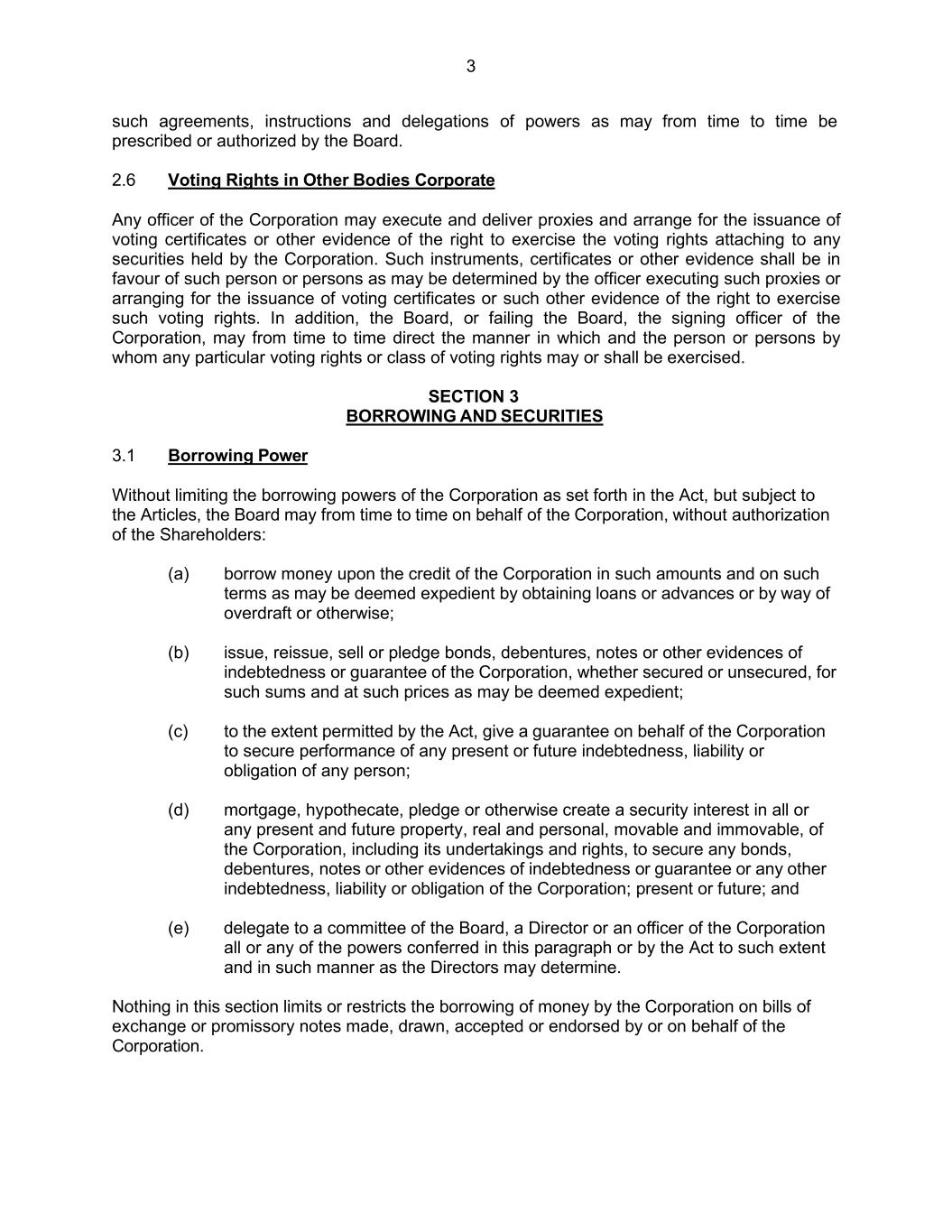 3 such agreements, instructions and delegations of powers as may from time to time be prescribed or authorized by the Board. 2.6 Voting Rights in Other Bodies Corporate Any officer of the Corporation may execute and deliver proxies and arrange for the issuance of voting certificates or other evidence of the right to exercise the voting rights attaching to any securities held by the Corporation. Such instruments, certificates or other evidence shall be in favour of such person or persons as may be determined by the officer executing such proxies or arranging for the issuance of voting certificates or such other evidence of the right to exercise such voting rights. In addition, the Board, or failing the Board, the signing officer of the Corporation, may from time to time direct the manner in which and the person or persons by whom any particular voting rights or class of voting rights may or shall be exercised. SECTION 3 BORROWING AND SECURITIES 3.1 Borrowing Power Without limiting the borrowing powers of the Corporation as set forth in the Act, but subject to the Articles, the Board may from time to time on behalf of the Corporation, without authorization of the Shareholders: (a) borrow money upon the credit of the Corporation in such amounts and on such terms as may be deemed expedient by obtaining loans or advances or by way of overdraft or otherwise; (b) issue, reissue, sell or pledge bonds, debentures, notes or other evidences of indebtedness or guarantee of the Corporation, whether secured or unsecured, for such sums and at such prices as may be deemed expedient; (c) to the extent permitted by the Act, give a guarantee on behalf of the Corporation to secure performance of any present or future indebtedness, liability or obligation of any person; (d) mortgage, hypothecate, pledge or otherwise create a security interest in all or any present and future property, real and personal, movable and immovable, of the Corporation, including its undertakings and rights, to secure any bonds, debentures, notes or other evidences of indebtedness or guarantee or any other indebtedness, liability or obligation of the Corporation; present or future; and (e) delegate to a committee of the Board, a Director or an officer of the Corporation all or any of the powers conferred in this paragraph or by the Act to such extent and in such manner as the Directors may determine. Nothing in this section limits or restricts the borrowing of money by the Corporation on bills of exchange or promissory notes made, drawn, accepted or endorsed by or on behalf of the Corporation.