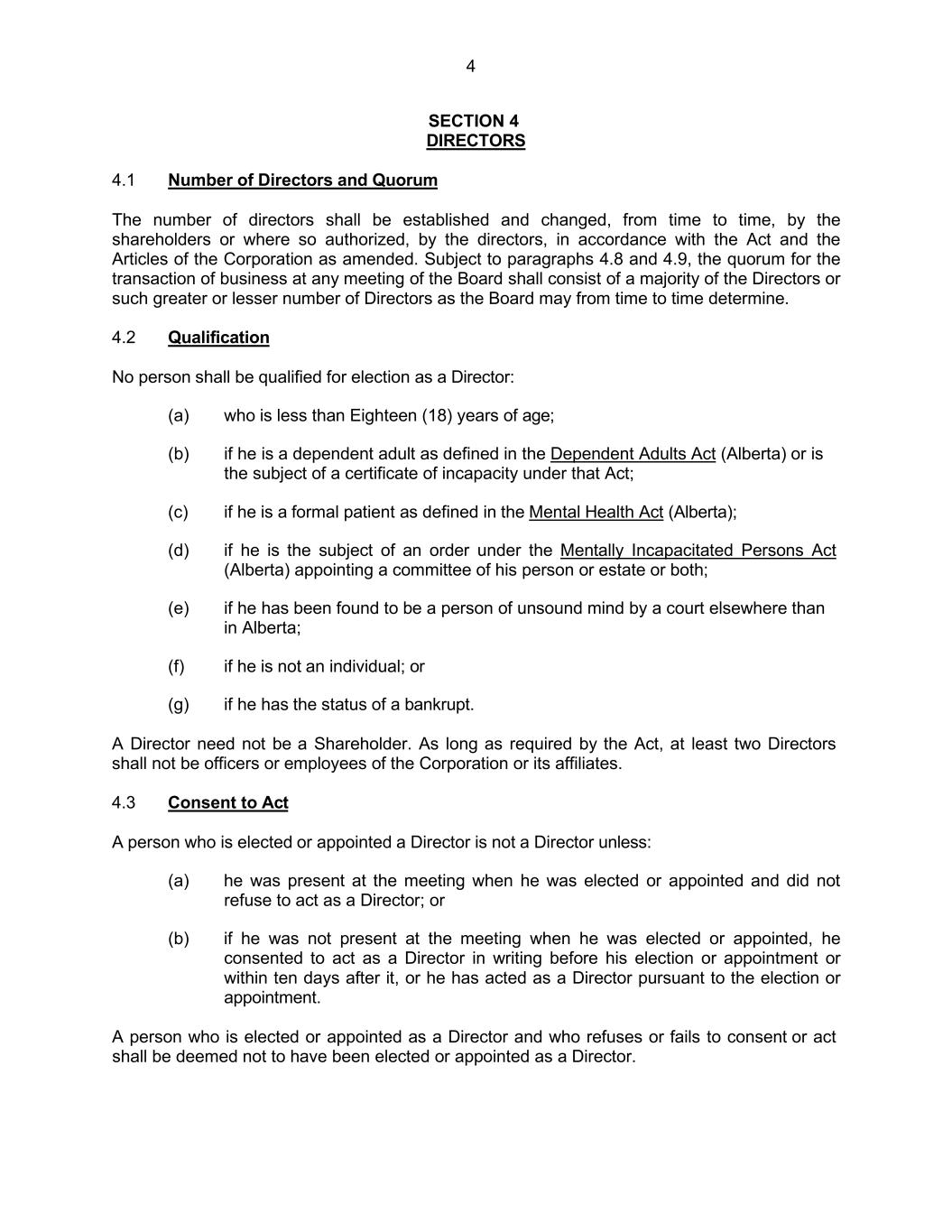 4 SECTION 4 DIRECTORS 4.1 Number of Directors and Quorum The number of directors shall be established and changed, from time to time, by the shareholders or where so authorized, by the directors, in accordance with the Act and the Articles of the Corporation as amended. Subject to paragraphs 4.8 and 4.9, the quorum for the transaction of business at any meeting of the Board shall consist of a majority of the Directors or such greater or lesser number of Directors as the Board may from time to time determine. 4.2 Qualification No person shall be qualified for election as a Director: (a) who is less than Eighteen (18) years of age; (b) if he is a dependent adult as defined in the Dependent Adults Act (Alberta) or is the subject of a certificate of incapacity under that Act; (c) if he is a formal patient as defined in the Mental Health Act (Alberta); (d) if he is the subject of an order under the Mentally Incapacitated Persons Act (Alberta) appointing a committee of his person or estate or both; (e) if he has been found to be a person of unsound mind by a court elsewhere than in Alberta; (f) if he is not an individual; or (g) if he has the status of a bankrupt. A Director need not be a Shareholder. As long as required by the Act, at least two Directors shall not be officers or employees of the Corporation or its affiliates. 4.3 Consent to Act A person who is elected or appointed a Director is not a Director unless: (a) he was present at the meeting when he was elected or appointed and did not refuse to act as a Director; or (b) if he was not present at the meeting when he was elected or appointed, he consented to act as a Director in writing before his election or appointment or within ten days after it, or he has acted as a Director pursuant to the election or appointment. A person who is elected or appointed as a Director and who refuses or fails to consent or act shall be deemed not to have been elected or appointed as a Director.