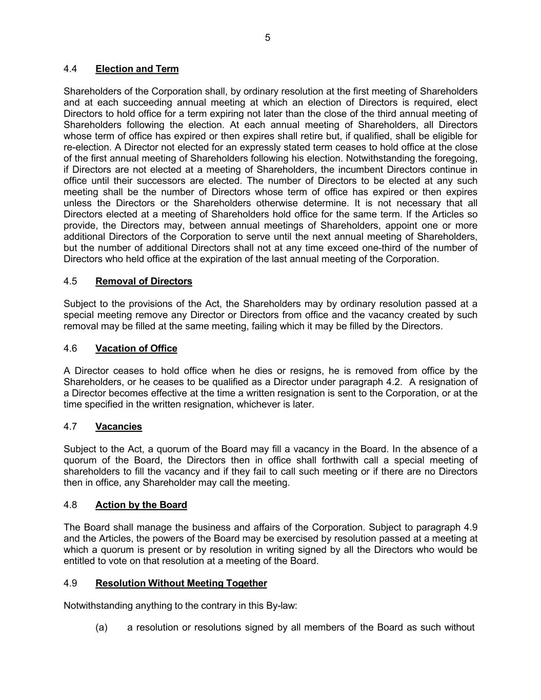 5 4.4 Election and Term Shareholders of the Corporation shall, by ordinary resolution at the first meeting of Shareholders and at each succeeding annual meeting at which an election of Directors is required, elect Directors to hold office for a term expiring not later than the close of the third annual meeting of Shareholders following the election. At each annual meeting of Shareholders, all Directors whose term of office has expired or then expires shall retire but, if qualified, shall be eligible for re-election. A Director not elected for an expressly stated term ceases to hold office at the close of the first annual meeting of Shareholders following his election. Notwithstanding the foregoing, if Directors are not elected at a meeting of Shareholders, the incumbent Directors continue in office until their successors are elected. The number of Directors to be elected at any such meeting shall be the number of Directors whose term of office has expired or then expires unless the Directors or the Shareholders otherwise determine. It is not necessary that all Directors elected at a meeting of Shareholders hold office for the same term. If the Articles so provide, the Directors may, between annual meetings of Shareholders, appoint one or more additional Directors of the Corporation to serve until the next annual meeting of Shareholders, but the number of additional Directors shall not at any time exceed one-third of the number of Directors who held office at the expiration of the last annual meeting of the Corporation. 4.5 Removal of Directors Subject to the provisions of the Act, the Shareholders may by ordinary resolution passed at a special meeting remove any Director or Directors from office and the vacancy created by such removal may be filled at the same meeting, failing which it may be filled by the Directors. 4.6 Vacation of Office A Director ceases to hold office when he dies or resigns, he is removed from office by the Shareholders, or he ceases to be qualified as a Director under paragraph 4.2. A resignation of a Director becomes effective at the time a written resignation is sent to the Corporation, or at the time specified in the written resignation, whichever is later. 4.7 Vacancies Subject to the Act, a quorum of the Board may fill a vacancy in the Board. In the absence of a quorum of the Board, the Directors then in office shall forthwith call a special meeting of shareholders to fill the vacancy and if they fail to call such meeting or if there are no Directors then in office, any Shareholder may call the meeting. 4.8 Action by the Board The Board shall manage the business and affairs of the Corporation. Subject to paragraph 4.9 and the Articles, the powers of the Board may be exercised by resolution passed at a meeting at which a quorum is present or by resolution in writing signed by all the Directors who would be entitled to vote on that resolution at a meeting of the Board. 4.9 Resolution Without Meeting Together Notwithstanding anything to the contrary in this By-law: (a) a resolution or resolutions signed by all members of the Board as such without