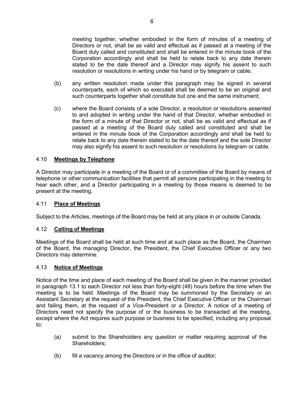 6 meeting together, whether embodied in the form of minutes of a meeting of Directors or not, shall be as valid and effectual as if passed at a meeting of the Board duly called and constituted and shall be entered in the minute book of the Corporation accordingly and shall be held to relate back to any date therein stated to be the date thereof and a Director may signify his assent to such resolution or resolutions in writing under his hand or by telegram or cable; (b) any written resolution made under this paragraph may be signed in several counterparts, each of which so executed shall be deemed to be an original and such counterparts together shall constitute but one and the same instrument; (c) where the Board consists of a sole Director, a resolution or resolutions assented to and adopted in writing under the hand of that Director, whether embodied in the form of a minute of that Director or not, shall be as valid and effectual as if passed at a meeting of the Board duly called and constituted and shall be entered in the minute book of the Corporation accordingly and shall be held to relate back to any date therein stated to be the date thereof and the sole Director may also signify his assent to such resolution or resolutions by telegram or cable. 4.10 Meetings by Telephone A Director may participate in a meeting of the Board or of a committee of the Board by means of telephone or other communication facilities that permit all persons participating in the meeting to hear each other, and a Director participating in a meeting by those means is deemed to be present at the meeting. 4.11 Place of Meetings Subject to the Articles, meetings of the Board may be held at any place in or outside Canada. 4.12 Calling of Meetings Meetings of the Board shall be held at such time and at such place as the Board, the Chairman of the Board, the managing Director, the President, the Chief Executive Officer or any two Directors may determine. 4.13 Notice of Meetings Notice of the time and place of each meeting of the Board shall be given in the manner provided in paragraph 13.1 to each Director not less than forty-eight (48) hours before the time when the meeting is to be held. Meetings of the Board may be summoned by the Secretary or an Assistant Secretary at the request of the President, the Chief Executive Officer or the Chairman and failing them, at the request of a Vice-President or a Director. A notice of a meeting of Directors need not specify the purpose of or the business to be transacted at the meeting, except where the Act requires such purpose or business to be specified, including any proposal to: (a) submit to the Shareholders any question or matter requiring approval of the Shareholders; (b) fill a vacancy among the Directors or in the office of auditor;