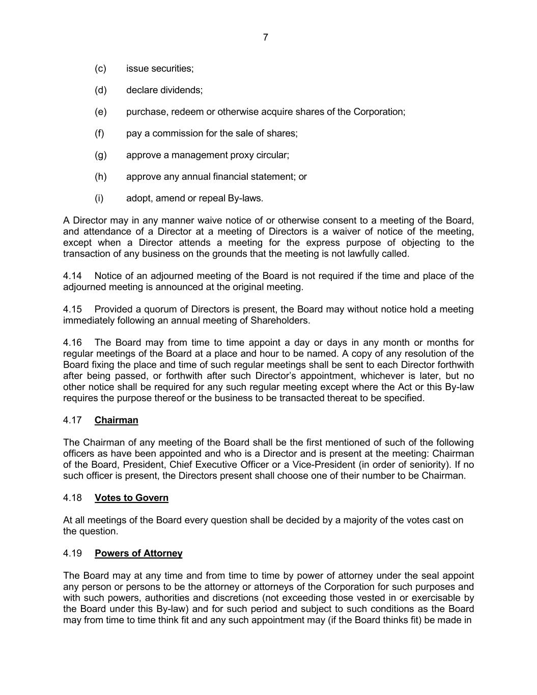 7 (c) issue securities; (d) declare dividends; (e) purchase, redeem or otherwise acquire shares of the Corporation; (f) pay a commission for the sale of shares; (g) approve a management proxy circular; (h) approve any annual financial statement; or (i) adopt, amend or repeal By-laws. A Director may in any manner waive notice of or otherwise consent to a meeting of the Board, and attendance of a Director at a meeting of Directors is a waiver of notice of the meeting, except when a Director attends a meeting for the express purpose of objecting to the transaction of any business on the grounds that the meeting is not lawfully called. 4.14 Notice of an adjourned meeting of the Board is not required if the time and place of the adjourned meeting is announced at the original meeting. 4.15 Provided a quorum of Directors is present, the Board may without notice hold a meeting immediately following an annual meeting of Shareholders. 4.16 The Board may from time to time appoint a day or days in any month or months for regular meetings of the Board at a place and hour to be named. A copy of any resolution of the Board fixing the place and time of such regular meetings shall be sent to each Director forthwith after being passed, or forthwith after such Director’s appointment, whichever is later, but no other notice shall be required for any such regular meeting except where the Act or this By-law requires the purpose thereof or the business to be transacted thereat to be specified. 4.17 Chairman The Chairman of any meeting of the Board shall be the first mentioned of such of the following officers as have been appointed and who is a Director and is present at the meeting: Chairman of the Board, President, Chief Executive Officer or a Vice-President (in order of seniority). If no such officer is present, the Directors present shall choose one of their number to be Chairman. 4.18 Votes to Govern At all meetings of the Board every question shall be decided by a majority of the votes cast on the question. 4.19 Powers of Attorney The Board may at any time and from time to time by power of attorney under the seal appoint any person or persons to be the attorney or attorneys of the Corporation for such purposes and with such powers, authorities and discretions (not exceeding those vested in or exercisable by the Board under this By-law) and for such period and subject to such conditions as the Board may from time to time think fit and any such appointment may (if the Board thinks fit) be made in