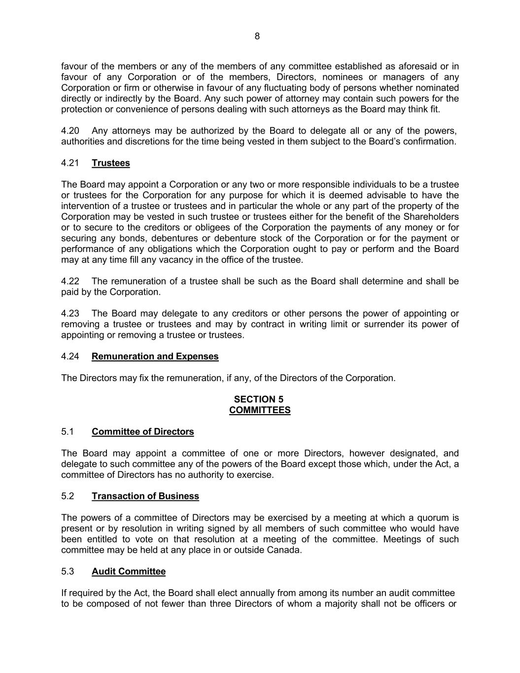 8 favour of the members or any of the members of any committee established as aforesaid or in favour of any Corporation or of the members, Directors, nominees or managers of any Corporation or firm or otherwise in favour of any fluctuating body of persons whether nominated directly or indirectly by the Board. Any such power of attorney may contain such powers for the protection or convenience of persons dealing with such attorneys as the Board may think fit. 4.20 Any attorneys may be authorized by the Board to delegate all or any of the powers, authorities and discretions for the time being vested in them subject to the Board’s confirmation. 4.21 Trustees The Board may appoint a Corporation or any two or more responsible individuals to be a trustee or trustees for the Corporation for any purpose for which it is deemed advisable to have the intervention of a trustee or trustees and in particular the whole or any part of the property of the Corporation may be vested in such trustee or trustees either for the benefit of the Shareholders or to secure to the creditors or obligees of the Corporation the payments of any money or for securing any bonds, debentures or debenture stock of the Corporation or for the payment or performance of any obligations which the Corporation ought to pay or perform and the Board may at any time fill any vacancy in the office of the trustee. 4.22 The remuneration of a trustee shall be such as the Board shall determine and shall be paid by the Corporation. 4.23 The Board may delegate to any creditors or other persons the power of appointing or removing a trustee or trustees and may by contract in writing limit or surrender its power of appointing or removing a trustee or trustees. 4.24 Remuneration and Expenses The Directors may fix the remuneration, if any, of the Directors of the Corporation. SECTION 5 COMMITTEES 5.1 Committee of Directors The Board may appoint a committee of one or more Directors, however designated, and delegate to such committee any of the powers of the Board except those which, under the Act, a committee of Directors has no authority to exercise. 5.2 Transaction of Business The powers of a committee of Directors may be exercised by a meeting at which a quorum is present or by resolution in writing signed by all members of such committee who would have been entitled to vote on that resolution at a meeting of the committee. Meetings of such committee may be held at any place in or outside Canada. 5.3 Audit Committee If required by the Act, the Board shall elect annually from among its number an audit committee to be composed of not fewer than three Directors of whom a majority shall not be officers or