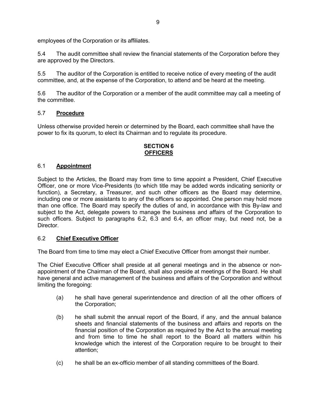 9 employees of the Corporation or its affiliates. 5.4 The audit committee shall review the financial statements of the Corporation before they are approved by the Directors. 5.5 The auditor of the Corporation is entitled to receive notice of every meeting of the audit committee, and, at the expense of the Corporation, to attend and be heard at the meeting. 5.6 The auditor of the Corporation or a member of the audit committee may call a meeting of the committee. 5.7 Procedure Unless otherwise provided herein or determined by the Board, each committee shall have the power to fix its quorum, to elect its Chairman and to regulate its procedure. SECTION 6 OFFICERS 6.1 Appointment Subject to the Articles, the Board may from time to time appoint a President, Chief Executive Officer, one or more Vice-Presidents (to which title may be added words indicating seniority or function), a Secretary, a Treasurer, and such other officers as the Board may determine, including one or more assistants to any of the officers so appointed. One person may hold more than one office. The Board may specify the duties of and, in accordance with this By-law and subject to the Act, delegate powers to manage the business and affairs of the Corporation to such officers. Subject to paragraphs 6.2, 6.3 and 6.4, an officer may, but need not, be a Director. 6.2 Chief Executive Officer The Board from time to time may elect a Chief Executive Officer from amongst their number. The Chief Executive Officer shall preside at all general meetings and in the absence or non- appointment of the Chairman of the Board, shall also preside at meetings of the Board. He shall have general and active management of the business and affairs of the Corporation and without limiting the foregoing: (a) he shall have general superintendence and direction of all the other officers of the Corporation; (b) he shall submit the annual report of the Board, if any, and the annual balance sheets and financial statements of the business and affairs and reports on the financial position of the Corporation as required by the Act to the annual meeting and from time to time he shall report to the Board all matters within his knowledge which the interest of the Corporation require to be brought to their attention; (c) he shall be an ex-officio member of all standing committees of the Board.