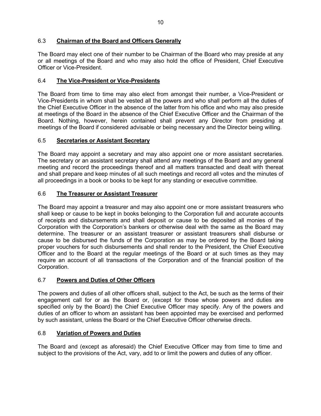 10 6.3 Chairman of the Board and Officers Generally The Board may elect one of their number to be Chairman of the Board who may preside at any or all meetings of the Board and who may also hold the office of President, Chief Executive Officer or Vice-President. 6.4 The Vice-President or Vice-Presidents The Board from time to time may also elect from amongst their number, a Vice-President or Vice-Presidents in whom shall be vested all the powers and who shall perform all the duties of the Chief Executive Officer in the absence of the latter from his office and who may also preside at meetings of the Board in the absence of the Chief Executive Officer and the Chairman of the Board. Nothing, however, herein contained shall prevent any Director from presiding at meetings of the Board if considered advisable or being necessary and the Director being willing. 6.5 Secretaries or Assistant Secretary The Board may appoint a secretary and may also appoint one or more assistant secretaries. The secretary or an assistant secretary shall attend any meetings of the Board and any general meeting and record the proceedings thereof and all matters transacted and dealt with thereat and shall prepare and keep minutes of all such meetings and record all votes and the minutes of all proceedings in a book or books to be kept for any standing or executive committee. 6.6 The Treasurer or Assistant Treasurer The Board may appoint a treasurer and may also appoint one or more assistant treasurers who shall keep or cause to be kept in books belonging to the Corporation full and accurate accounts of receipts and disbursements and shall deposit or cause to be deposited all monies of the Corporation with the Corporation’s bankers or otherwise deal with the same as the Board may determine. The treasurer or an assistant treasurer or assistant treasurers shall disburse or cause to be disbursed the funds of the Corporation as may be ordered by the Board taking proper vouchers for such disbursements and shall render to the President, the Chief Executive Officer and to the Board at the regular meetings of the Board or at such times as they may require an account of all transactions of the Corporation and of the financial position of the Corporation. 6.7 Powers and Duties of Other Officers The powers and duties of all other officers shall, subject to the Act, be such as the terms of their engagement call for or as the Board or, (except for those whose powers and duties are specified only by the Board) the Chief Executive Officer may specify. Any of the powers and duties of an officer to whom an assistant has been appointed may be exercised and performed by such assistant, unless the Board or the Chief Executive Officer otherwise directs. 6.8 Variation of Powers and Duties The Board and (except as aforesaid) the Chief Executive Officer may from time to time and subject to the provisions of the Act, vary, add to or limit the powers and duties of any officer.