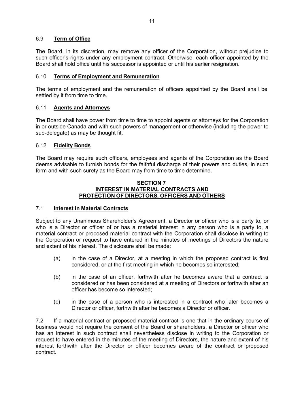 11 6.9 Term of Office The Board, in its discretion, may remove any officer of the Corporation, without prejudice to such officer’s rights under any employment contract. Otherwise, each officer appointed by the Board shall hold office until his successor is appointed or until his earlier resignation. 6.10 Terms of Employment and Remuneration The terms of employment and the remuneration of officers appointed by the Board shall be settled by it from time to time. 6.11 Agents and Attorneys The Board shall have power from time to time to appoint agents or attorneys for the Corporation in or outside Canada and with such powers of management or otherwise (including the power to sub-delegate) as may be thought fit. 6.12 Fidelity Bonds The Board may require such officers, employees and agents of the Corporation as the Board deems advisable to furnish bonds for the faithful discharge of their powers and duties, in such form and with such surety as the Board may from time to time determine. SECTION 7 INTEREST IN MATERIAL CONTRACTS AND PROTECTION OF DIRECTORS, OFFICERS AND OTHERS 7.1 Interest in Material Contracts Subject to any Unanimous Shareholder’s Agreement, a Director or officer who is a party to, or who is a Director or officer of or has a material interest in any person who is a party to, a material contract or proposed material contract with the Corporation shall disclose in writing to the Corporation or request to have entered in the minutes of meetings of Directors the nature and extent of his interest. The disclosure shall be made: (a) in the case of a Director, at a meeting in which the proposed contract is first considered, or at the first meeting in which he becomes so interested; (b) in the case of an officer, forthwith after he becomes aware that a contract is considered or has been considered at a meeting of Directors or forthwith after an officer has become so interested; (c) in the case of a person who is interested in a contract who later becomes a Director or officer, forthwith after he becomes a Director or officer. 7.2 If a material contract or proposed material contract is one that in the ordinary course of business would not require the consent of the Board or shareholders, a Director or officer who has an interest in such contract shall nevertheless disclose in writing to the Corporation or request to have entered in the minutes of the meeting of Directors, the nature and extent of his interest forthwith after the Director or officer becomes aware of the contract or proposed contract.