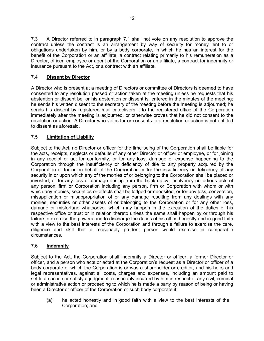12 7.3 A Director referred to in paragraph 7.1 shall not vote on any resolution to approve the contract unless the contract is an arrangement by way of security for money lent to or obligations undertaken by him, or by a body corporate, in which he has an interest for the benefit of the Corporation or an affiliate, a contract relating primarily to his remuneration as a Director, officer, employee or agent of the Corporation or an affiliate, a contract for indemnity or insurance pursuant to the Act, or a contract with an affiliate. 7.4 Dissent by Director A Director who is present at a meeting of Directors or committee of Directors is deemed to have consented to any resolution passed or action taken at the meeting unless he requests that his abstention or dissent be, or his abstention or dissent is, entered in the minutes of the meeting; he sends his written dissent to the secretary of the meeting before the meeting is adjourned; he sends his dissent by registered mail or delivers it to the registered office of the Corporation immediately after the meeting is adjourned, or otherwise proves that he did not consent to the resolution or action. A Director who votes for or consents to a resolution or action is not entitled to dissent as aforesaid. 7.5 Limitation of Liability Subject to the Act, no Director or officer for the time being of the Corporation shall be liable for the acts, receipts, neglects or defaults of any other Director or officer or employee, or for joining in any receipt or act for conformity, or for any loss, damage or expense happening to the Corporation through the insufficiency or deficiency of title to any property acquired by the Corporation or for or on behalf of the Corporation or for the insufficiency or deficiency of any security in or upon which any of the monies of or belonging to the Corporation shall be placed or invested, or for any loss or damage arising from the bankruptcy, insolvency or tortious acts of any person, firm or Corporation including any person, firm or Corporation with whom or with which any monies, securities or effects shall be lodged or deposited, or for any loss, conversion, misapplication or misappropriation of or any damage resulting from any dealings with any monies, securities or other assets of or belonging to the Corporation or for any other loss, damage or misfortune whatsoever which may happen in the execution of the duties of his respective office or trust or in relation thereto unless the same shall happen by or through his failure to exercise the powers and to discharge the duties of his office honestly and in good faith with a view to the best interests of the Corporation and through a failure to exercise the care, diligence and skill that a reasonably prudent person would exercise in comparable circumstances. 7.6 Indemnity Subject to the Act, the Corporation shall indemnify a Director or officer, a former Director or officer, and a person who acts or acted at the Corporation’s request as a Director or officer of a body corporate of which the Corporation is or was a shareholder or creditor, and his heirs and legal representatives, against all costs, charges and expenses, including an amount paid to settle an action or satisfy a judgment, reasonably incurred by him in respect of any civil, criminal or administrative action or proceeding to which he is made a party by reason of being or having been a Director or officer of the Corporation or such body corporate if: (a) he acted honestly and in good faith with a view to the best interests of the Corporation; and