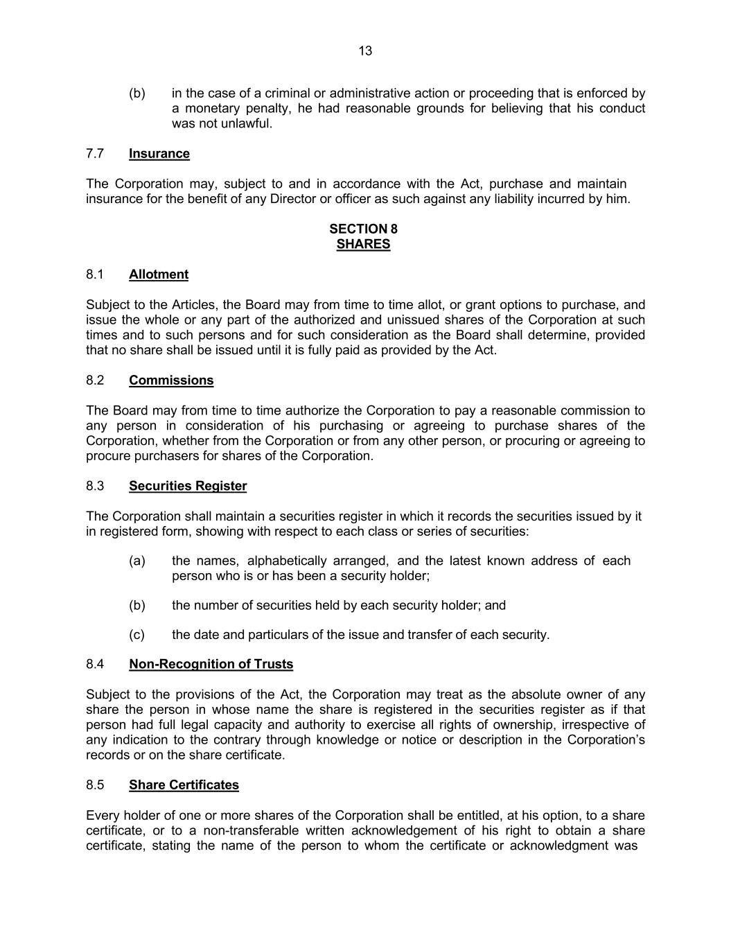 13 (b) in the case of a criminal or administrative action or proceeding that is enforced by a monetary penalty, he had reasonable grounds for believing that his conduct was not unlawful. 7.7 Insurance The Corporation may, subject to and in accordance with the Act, purchase and maintain insurance for the benefit of any Director or officer as such against any liability incurred by him. SECTION 8 SHARES 8.1 Allotment Subject to the Articles, the Board may from time to time allot, or grant options to purchase, and issue the whole or any part of the authorized and unissued shares of the Corporation at such times and to such persons and for such consideration as the Board shall determine, provided that no share shall be issued until it is fully paid as provided by the Act. 8.2 Commissions The Board may from time to time authorize the Corporation to pay a reasonable commission to any person in consideration of his purchasing or agreeing to purchase shares of the Corporation, whether from the Corporation or from any other person, or procuring or agreeing to procure purchasers for shares of the Corporation. 8.3 Securities Register The Corporation shall maintain a securities register in which it records the securities issued by it in registered form, showing with respect to each class or series of securities: (a) the names, alphabetically arranged, and the latest known address of each person who is or has been a security holder; (b) the number of securities held by each security holder; and (c) the date and particulars of the issue and transfer of each security. 8.4 Non-Recognition of Trusts Subject to the provisions of the Act, the Corporation may treat as the absolute owner of any share the person in whose name the share is registered in the securities register as if that person had full legal capacity and authority to exercise all rights of ownership, irrespective of any indication to the contrary through knowledge or notice or description in the Corporation’s records or on the share certificate. 8.5 Share Certificates Every holder of one or more shares of the Corporation shall be entitled, at his option, to a share certificate, or to a non-transferable written acknowledgement of his right to obtain a share certificate, stating the name of the person to whom the certificate or acknowledgment was