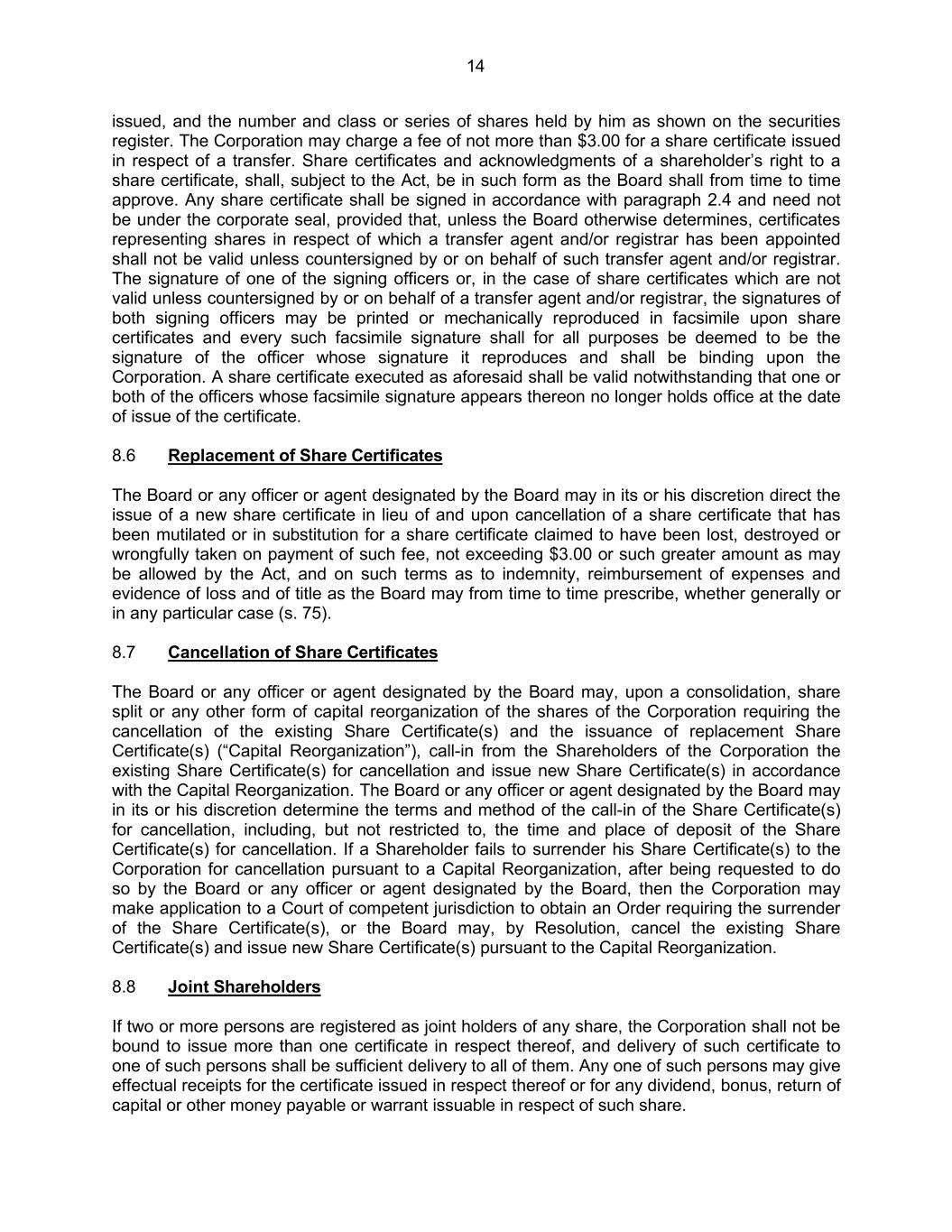 14 issued, and the number and class or series of shares held by him as shown on the securities register. The Corporation may charge a fee of not more than $3.00 for a share certificate issued in respect of a transfer. Share certificates and acknowledgments of a shareholder’s right to a share certificate, shall, subject to the Act, be in such form as the Board shall from time to time approve. Any share certificate shall be signed in accordance with paragraph 2.4 and need not be under the corporate seal, provided that, unless the Board otherwise determines, certificates representing shares in respect of which a transfer agent and/or registrar has been appointed shall not be valid unless countersigned by or on behalf of such transfer agent and/or registrar. The signature of one of the signing officers or, in the case of share certificates which are not valid unless countersigned by or on behalf of a transfer agent and/or registrar, the signatures of both signing officers may be printed or mechanically reproduced in facsimile upon share certificates and every such facsimile signature shall for all purposes be deemed to be the signature of the officer whose signature it reproduces and shall be binding upon the Corporation. A share certificate executed as aforesaid shall be valid notwithstanding that one or both of the officers whose facsimile signature appears thereon no longer holds office at the date of issue of the certificate. 8.6 Replacement of Share Certificates The Board or any officer or agent designated by the Board may in its or his discretion direct the issue of a new share certificate in lieu of and upon cancellation of a share certificate that has been mutilated or in substitution for a share certificate claimed to have been lost, destroyed or wrongfully taken on payment of such fee, not exceeding $3.00 or such greater amount as may be allowed by the Act, and on such terms as to indemnity, reimbursement of expenses and evidence of loss and of title as the Board may from time to time prescribe, whether generally or in any particular case (s. 75). 8.7 Cancellation of Share Certificates The Board or any officer or agent designated by the Board may, upon a consolidation, share split or any other form of capital reorganization of the shares of the Corporation requiring the cancellation of the existing Share Certificate(s) and the issuance of replacement Share Certificate(s) (“Capital Reorganization”), call-in from the Shareholders of the Corporation the existing Share Certificate(s) for cancellation and issue new Share Certificate(s) in accordance with the Capital Reorganization. The Board or any officer or agent designated by the Board may in its or his discretion determine the terms and method of the call-in of the Share Certificate(s) for cancellation, including, but not restricted to, the time and place of deposit of the Share Certificate(s) for cancellation. If a Shareholder fails to surrender his Share Certificate(s) to the Corporation for cancellation pursuant to a Capital Reorganization, after being requested to do so by the Board or any officer or agent designated by the Board, then the Corporation may make application to a Court of competent jurisdiction to obtain an Order requiring the surrender of the Share Certificate(s), or the Board may, by Resolution, cancel the existing Share Certificate(s) and issue new Share Certificate(s) pursuant to the Capital Reorganization. 8.8 Joint Shareholders If two or more persons are registered as joint holders of any share, the Corporation shall not be bound to issue more than one certificate in respect thereof, and delivery of such certificate to one of such persons shall be sufficient delivery to all of them. Any one of such persons may give effectual receipts for the certificate issued in respect thereof or for any dividend, bonus, return of capital or other money payable or warrant issuable in respect of such share.