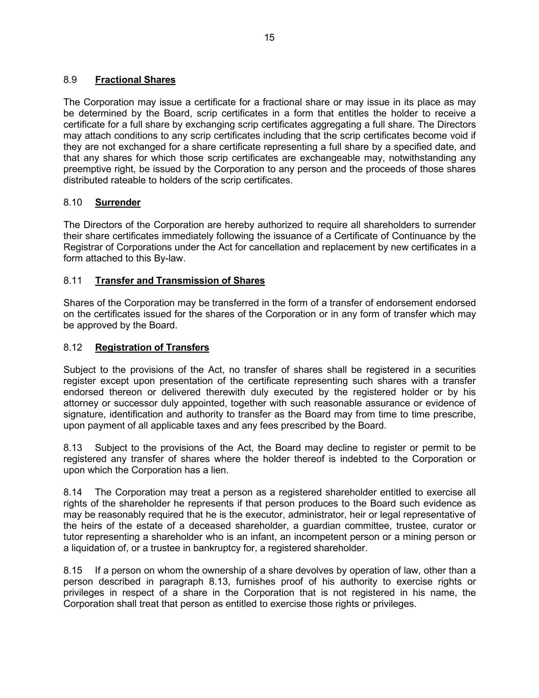 15 8.9 Fractional Shares The Corporation may issue a certificate for a fractional share or may issue in its place as may be determined by the Board, scrip certificates in a form that entitles the holder to receive a certificate for a full share by exchanging scrip certificates aggregating a full share. The Directors may attach conditions to any scrip certificates including that the scrip certificates become void if they are not exchanged for a share certificate representing a full share by a specified date, and that any shares for which those scrip certificates are exchangeable may, notwithstanding any preemptive right, be issued by the Corporation to any person and the proceeds of those shares distributed rateable to holders of the scrip certificates. 8.10 Surrender The Directors of the Corporation are hereby authorized to require all shareholders to surrender their share certificates immediately following the issuance of a Certificate of Continuance by the Registrar of Corporations under the Act for cancellation and replacement by new certificates in a form attached to this By-law. 8.11 Transfer and Transmission of Shares Shares of the Corporation may be transferred in the form of a transfer of endorsement endorsed on the certificates issued for the shares of the Corporation or in any form of transfer which may be approved by the Board. 8.12 Registration of Transfers Subject to the provisions of the Act, no transfer of shares shall be registered in a securities register except upon presentation of the certificate representing such shares with a transfer endorsed thereon or delivered therewith duly executed by the registered holder or by his attorney or successor duly appointed, together with such reasonable assurance or evidence of signature, identification and authority to transfer as the Board may from time to time prescribe, upon payment of all applicable taxes and any fees prescribed by the Board. 8.13 Subject to the provisions of the Act, the Board may decline to register or permit to be registered any transfer of shares where the holder thereof is indebted to the Corporation or upon which the Corporation has a lien. 8.14 The Corporation may treat a person as a registered shareholder entitled to exercise all rights of the shareholder he represents if that person produces to the Board such evidence as may be reasonably required that he is the executor, administrator, heir or legal representative of the heirs of the estate of a deceased shareholder, a guardian committee, trustee, curator or tutor representing a shareholder who is an infant, an incompetent person or a mining person or a liquidation of, or a trustee in bankruptcy for, a registered shareholder. 8.15 If a person on whom the ownership of a share devolves by operation of law, other than a person described in paragraph 8.13, furnishes proof of his authority to exercise rights or privileges in respect of a share in the Corporation that is not registered in his name, the Corporation shall treat that person as entitled to exercise those rights or privileges.