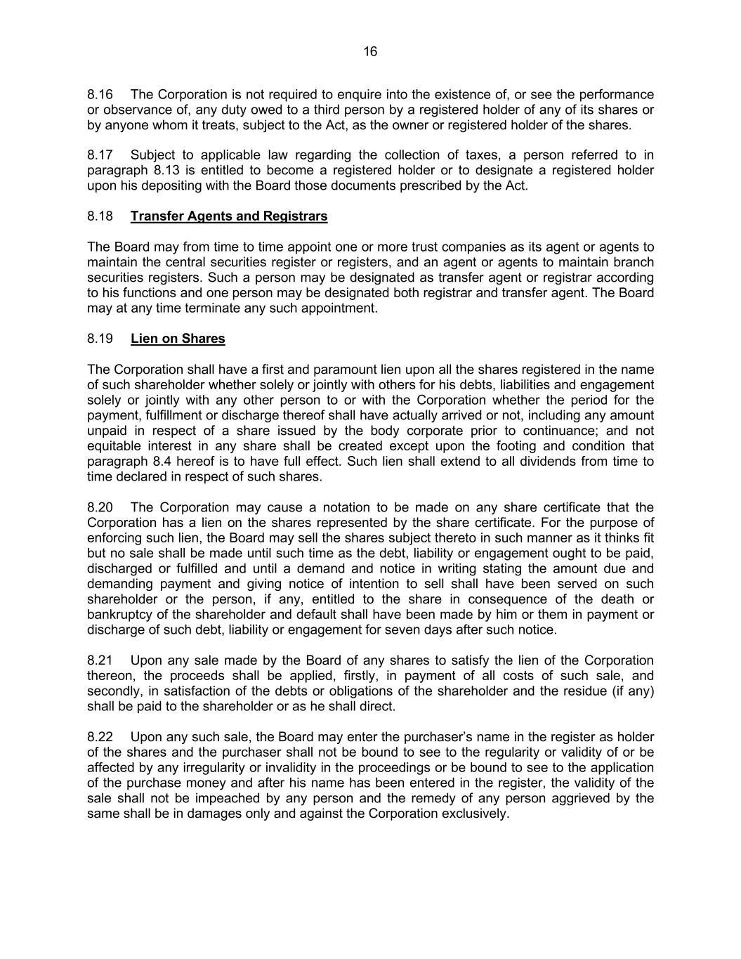 16 8.16 The Corporation is not required to enquire into the existence of, or see the performance or observance of, any duty owed to a third person by a registered holder of any of its shares or by anyone whom it treats, subject to the Act, as the owner or registered holder of the shares. 8.17 Subject to applicable law regarding the collection of taxes, a person referred to in paragraph 8.13 is entitled to become a registered holder or to designate a registered holder upon his depositing with the Board those documents prescribed by the Act. 8.18 Transfer Agents and Registrars The Board may from time to time appoint one or more trust companies as its agent or agents to maintain the central securities register or registers, and an agent or agents to maintain branch securities registers. Such a person may be designated as transfer agent or registrar according to his functions and one person may be designated both registrar and transfer agent. The Board may at any time terminate any such appointment. 8.19 Lien on Shares The Corporation shall have a first and paramount lien upon all the shares registered in the name of such shareholder whether solely or jointly with others for his debts, liabilities and engagement solely or jointly with any other person to or with the Corporation whether the period for the payment, fulfillment or discharge thereof shall have actually arrived or not, including any amount unpaid in respect of a share issued by the body corporate prior to continuance; and not equitable interest in any share shall be created except upon the footing and condition that paragraph 8.4 hereof is to have full effect. Such lien shall extend to all dividends from time to time declared in respect of such shares. 8.20 The Corporation may cause a notation to be made on any share certificate that the Corporation has a lien on the shares represented by the share certificate. For the purpose of enforcing such lien, the Board may sell the shares subject thereto in such manner as it thinks fit but no sale shall be made until such time as the debt, liability or engagement ought to be paid, discharged or fulfilled and until a demand and notice in writing stating the amount due and demanding payment and giving notice of intention to sell shall have been served on such shareholder or the person, if any, entitled to the share in consequence of the death or bankruptcy of the shareholder and default shall have been made by him or them in payment or discharge of such debt, liability or engagement for seven days after such notice. 8.21 Upon any sale made by the Board of any shares to satisfy the lien of the Corporation thereon, the proceeds shall be applied, firstly, in payment of all costs of such sale, and secondly, in satisfaction of the debts or obligations of the shareholder and the residue (if any) shall be paid to the shareholder or as he shall direct. 8.22 Upon any such sale, the Board may enter the purchaser’s name in the register as holder of the shares and the purchaser shall not be bound to see to the regularity or validity of or be affected by any irregularity or invalidity in the proceedings or be bound to see to the application of the purchase money and after his name has been entered in the register, the validity of the sale shall not be impeached by any person and the remedy of any person aggrieved by the same shall be in damages only and against the Corporation exclusively.