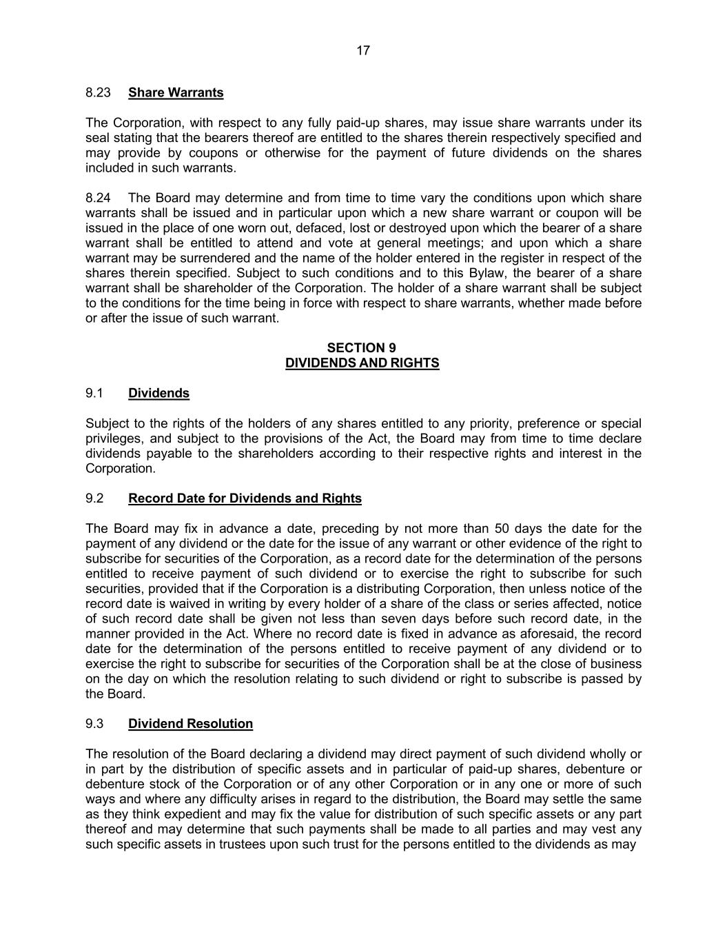 17 8.23 Share Warrants The Corporation, with respect to any fully paid-up shares, may issue share warrants under its seal stating that the bearers thereof are entitled to the shares therein respectively specified and may provide by coupons or otherwise for the payment of future dividends on the shares included in such warrants. 8.24 The Board may determine and from time to time vary the conditions upon which share warrants shall be issued and in particular upon which a new share warrant or coupon will be issued in the place of one worn out, defaced, lost or destroyed upon which the bearer of a share warrant shall be entitled to attend and vote at general meetings; and upon which a share warrant may be surrendered and the name of the holder entered in the register in respect of the shares therein specified. Subject to such conditions and to this Bylaw, the bearer of a share warrant shall be shareholder of the Corporation. The holder of a share warrant shall be subject to the conditions for the time being in force with respect to share warrants, whether made before or after the issue of such warrant. SECTION 9 DIVIDENDS AND RIGHTS 9.1 Dividends Subject to the rights of the holders of any shares entitled to any priority, preference or special privileges, and subject to the provisions of the Act, the Board may from time to time declare dividends payable to the shareholders according to their respective rights and interest in the Corporation. 9.2 Record Date for Dividends and Rights The Board may fix in advance a date, preceding by not more than 50 days the date for the payment of any dividend or the date for the issue of any warrant or other evidence of the right to subscribe for securities of the Corporation, as a record date for the determination of the persons entitled to receive payment of such dividend or to exercise the right to subscribe for such securities, provided that if the Corporation is a distributing Corporation, then unless notice of the record date is waived in writing by every holder of a share of the class or series affected, notice of such record date shall be given not less than seven days before such record date, in the manner provided in the Act. Where no record date is fixed in advance as aforesaid, the record date for the determination of the persons entitled to receive payment of any dividend or to exercise the right to subscribe for securities of the Corporation shall be at the close of business on the day on which the resolution relating to such dividend or right to subscribe is passed by the Board. 9.3 Dividend Resolution The resolution of the Board declaring a dividend may direct payment of such dividend wholly or in part by the distribution of specific assets and in particular of paid-up shares, debenture or debenture stock of the Corporation or of any other Corporation or in any one or more of such ways and where any difficulty arises in regard to the distribution, the Board may settle the same as they think expedient and may fix the value for distribution of such specific assets or any part thereof and may determine that such payments shall be made to all parties and may vest any such specific assets in trustees upon such trust for the persons entitled to the dividends as may
