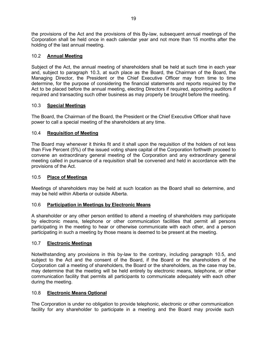 19 the provisions of the Act and the provisions of this By-law, subsequent annual meetings of the Corporation shall be held once in each calendar year and not more than 15 months after the holding of the last annual meeting. 10.2 Annual Meeting Subject of the Act, the annual meeting of shareholders shall be held at such time in each year and, subject to paragraph 10.3, at such place as the Board, the Chairman of the Board, the Managing Director, the President or the Chief Executive Officer may from time to time determine, for the purpose of considering the financial statements and reports required by the Act to be placed before the annual meeting, electing Directors if required, appointing auditors if required and transacting such other business as may properly be brought before the meeting. 10.3 Special Meetings The Board, the Chairman of the Board, the President or the Chief Executive Officer shall have power to call a special meeting of the shareholders at any time. 10.4 Requisition of Meeting The Board may whenever it thinks fit and it shall upon the requisition of the holders of not less than Five Percent (5%) of the issued voting share capital of the Corporation forthwith proceed to convene an extraordinary general meeting of the Corporation and any extraordinary general meeting called in pursuance of a requisition shall be convened and held in accordance with the provisions of the Act. 10.5 Place of Meetings Meetings of shareholders may be held at such location as the Board shall so determine, and may be held within Alberta or outside Alberta. 10.6 Participation in Meetings by Electronic Means A shareholder or any other person entitled to attend a meeting of shareholders may participate by electronic means, telephone or other communication facilities that permit all persons participating in the meeting to hear or otherwise communicate with each other, and a person participating in such a meeting by those means is deemed to be present at the meeting. 10.7 Electronic Meetings Notwithstanding any provisions in this by-law to the contrary, including paragraph 10.5, and subject to the Act and the consent of the Board, if the Board or the shareholders of the Corporation call a meeting of shareholders, the Board or the shareholders, as the case may be, may determine that the meeting will be held entirely by electronic means, telephone, or other communication facility that permits all participants to communicate adequately with each other during the meeting. 10.8 Electronic Means Optional The Corporation is under no obligation to provide telephonic, electronic or other communication facility for any shareholder to participate in a meeting and the Board may provide such