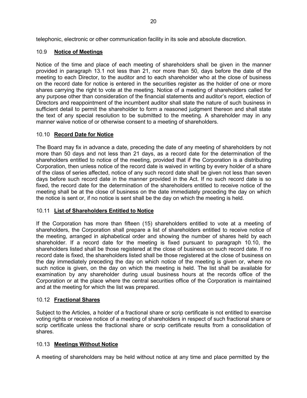 20 telephonic, electronic or other communication facility in its sole and absolute discretion. 10.9 Notice of Meetings Notice of the time and place of each meeting of shareholders shall be given in the manner provided in paragraph 13.1 not less than 21, nor more than 50, days before the date of the meeting to each Director, to the auditor and to each shareholder who at the close of business on the record date for notice is entered in the securities register as the holder of one or more shares carrying the right to vote at the meeting. Notice of a meeting of shareholders called for any purpose other than consideration of the financial statements and auditor’s report, election of Directors and reappointment of the incumbent auditor shall state the nature of such business in sufficient detail to permit the shareholder to form a reasoned judgment thereon and shall state the text of any special resolution to be submitted to the meeting. A shareholder may in any manner waive notice of or otherwise consent to a meeting of shareholders. 10.10 Record Date for Notice The Board may fix in advance a date, preceding the date of any meeting of shareholders by not more than 50 days and not less than 21 days, as a record date for the determination of the shareholders entitled to notice of the meeting, provided that if the Corporation is a distributing Corporation, then unless notice of the record date is waived in writing by every holder of a share of the class of series affected, notice of any such record date shall be given not less than seven days before such record date in the manner provided in the Act. If no such record date is so fixed, the record date for the determination of the shareholders entitled to receive notice of the meeting shall be at the close of business on the date immediately preceding the day on which the notice is sent or, if no notice is sent shall be the day on which the meeting is held. 10.11 List of Shareholders Entitled to Notice If the Corporation has more than fifteen (15) shareholders entitled to vote at a meeting of shareholders, the Corporation shall prepare a list of shareholders entitled to receive notice of the meeting, arranged in alphabetical order and showing the number of shares held by each shareholder. If a record date for the meeting is fixed pursuant to paragraph 10.10, the shareholders listed shall be those registered at the close of business on such record date. If no record date is fixed, the shareholders listed shall be those registered at the close of business on the day immediately preceding the day on which notice of the meeting is given or, where no such notice is given, on the day on which the meeting is held. The list shall be available for examination by any shareholder during usual business hours at the records office of the Corporation or at the place where the central securities office of the Corporation is maintained and at the meeting for which the list was prepared. 10.12 Fractional Shares Subject to the Articles, a holder of a fractional share or scrip certificate is not entitled to exercise voting rights or receive notice of a meeting of shareholders in respect of such fractional share or scrip certificate unless the fractional share or scrip certificate results from a consolidation of shares. 10.13 Meetings Without Notice A meeting of shareholders may be held without notice at any time and place permitted by the