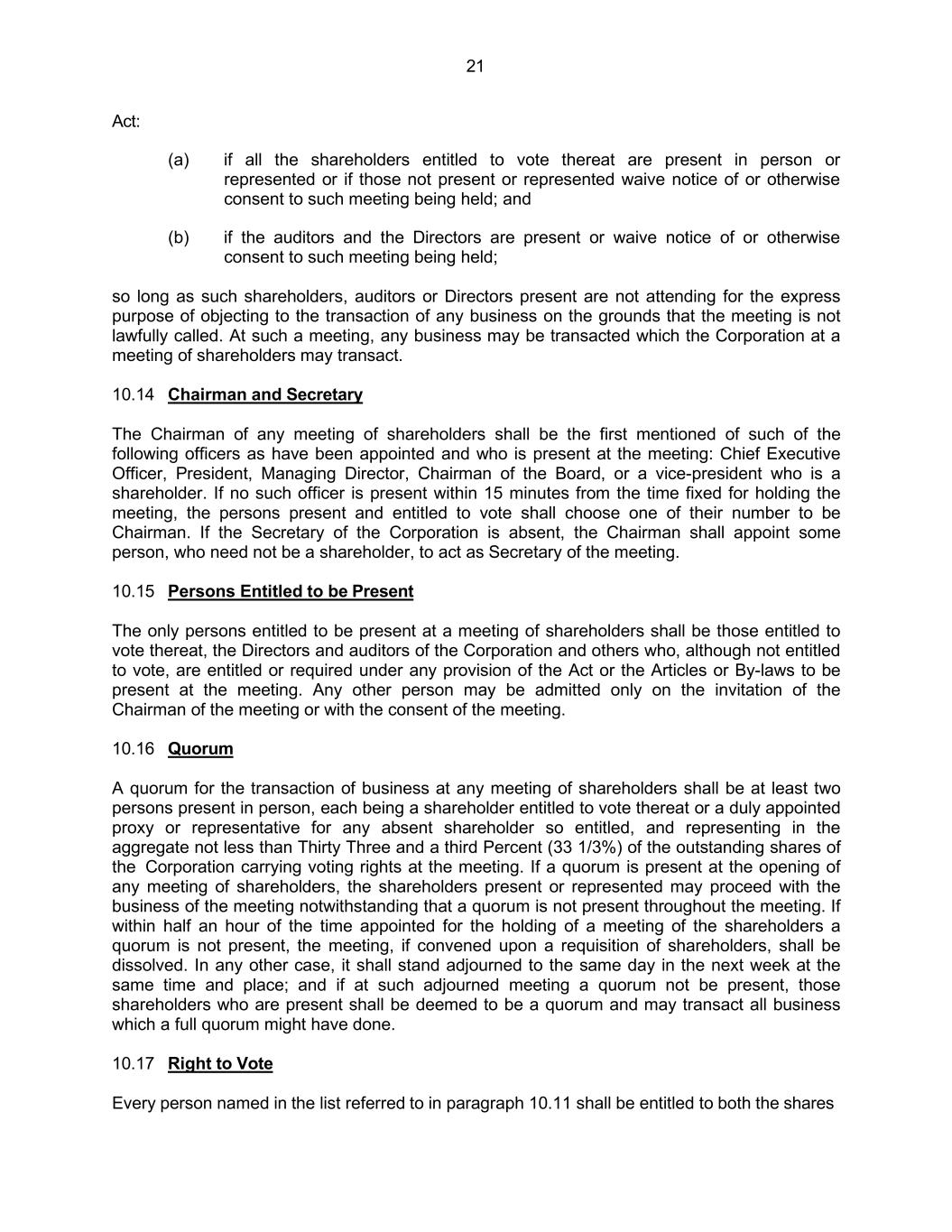 21 Act: (a) if all the shareholders entitled to vote thereat are present in person or represented or if those not present or represented waive notice of or otherwise consent to such meeting being held; and (b) if the auditors and the Directors are present or waive notice of or otherwise consent to such meeting being held; so long as such shareholders, auditors or Directors present are not attending for the express purpose of objecting to the transaction of any business on the grounds that the meeting is not lawfully called. At such a meeting, any business may be transacted which the Corporation at a meeting of shareholders may transact. 10.14 Chairman and Secretary The Chairman of any meeting of shareholders shall be the first mentioned of such of the following officers as have been appointed and who is present at the meeting: Chief Executive Officer, President, Managing Director, Chairman of the Board, or a vice-president who is a shareholder. If no such officer is present within 15 minutes from the time fixed for holding the meeting, the persons present and entitled to vote shall choose one of their number to be Chairman. If the Secretary of the Corporation is absent, the Chairman shall appoint some person, who need not be a shareholder, to act as Secretary of the meeting. 10.15 Persons Entitled to be Present The only persons entitled to be present at a meeting of shareholders shall be those entitled to vote thereat, the Directors and auditors of the Corporation and others who, although not entitled to vote, are entitled or required under any provision of the Act or the Articles or By-laws to be present at the meeting. Any other person may be admitted only on the invitation of the Chairman of the meeting or with the consent of the meeting. 10.16 Quorum A quorum for the transaction of business at any meeting of shareholders shall be at least two persons present in person, each being a shareholder entitled to vote thereat or a duly appointed proxy or representative for any absent shareholder so entitled, and representing in the aggregate not less than Thirty Three and a third Percent (33 1/3%) of the outstanding shares of the Corporation carrying voting rights at the meeting. If a quorum is present at the opening of any meeting of shareholders, the shareholders present or represented may proceed with the business of the meeting notwithstanding that a quorum is not present throughout the meeting. If within half an hour of the time appointed for the holding of a meeting of the shareholders a quorum is not present, the meeting, if convened upon a requisition of shareholders, shall be dissolved. In any other case, it shall stand adjourned to the same day in the next week at the same time and place; and if at such adjourned meeting a quorum not be present, those shareholders who are present shall be deemed to be a quorum and may transact all business which a full quorum might have done. 10.17 Right to Vote Every person named in the list referred to in paragraph 10.11 shall be entitled to both the shares