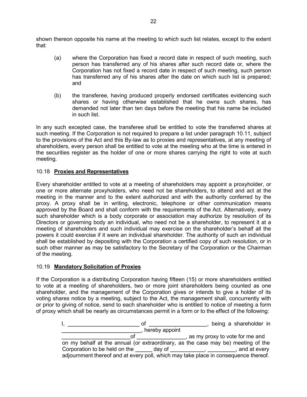 22 shown thereon opposite his name at the meeting to which such list relates, except to the extent that: (a) where the Corporation has fixed a record date in respect of such meeting, such person has transferred any of his shares after such record date or, where the Corporation has not fixed a record date in respect of such meeting, such person has transferred any of his shares after the date on which such list is prepared; and (b) the transferee, having produced properly endorsed certificates evidencing such shares or having otherwise established that he owns such shares, has demanded not later than ten days before the meeting that his name be included in such list. In any such excepted case, the transferee shall be entitled to vote the transferred shares at such meeting. If the Corporation is not required to prepare a list under paragraph 10.11, subject to the provisions of the Act and this By-law as to proxies and representatives, at any meeting of shareholders, every person shall be entitled to vote at the meeting who at the time is entered in the securities register as the holder of one or more shares carrying the right to vote at such meeting. 10.18 Proxies and Representatives Every shareholder entitled to vote at a meeting of shareholders may appoint a proxyholder, or one or more alternate proxyholders, who need not be shareholders, to attend and act at the meeting in the manner and to the extent authorized and with the authority conferred by the proxy. A proxy shall be in writing, electronic, telephone or other communication means approved by the Board and shall conform with the requirements of the Act. Alternatively, every such shareholder which is a body corporate or association may authorize by resolution of its Directors or governing body an individual, who need not be a shareholder, to represent it at a meeting of shareholders and such individual may exercise on the shareholder’s behalf all the powers it could exercise if it were an individual shareholder. The authority of such an individual shall be established by depositing with the Corporation a certified copy of such resolution, or in such other manner as may be satisfactory to the Secretary of the Corporation or the Chairman of the meeting. 10.19 Mandatory Solicitation of Proxies If the Corporation is a distributing Corporation having fifteen (15) or more shareholders entitled to vote at a meeting of shareholders, two or more joint shareholders being counted as one shareholder, and the management of the Corporation gives or intends to give a holder of its voting shares notice by a meeting, subject to the Act, the management shall, concurrently with or prior to giving of notice, send to each shareholder who is entitled to notice of meeting a form of proxy which shall be nearly as circumstances permit in a form or to the effect of the following: I, of , being a shareholder in , hereby appoint of , as my proxy to vote for me and on my behalf at the annual (or extraordinary, as the case may be) meeting of the Corporation to be held on the day of , , and at every adjournment thereof and at every poll, which may take place in consequence thereof.