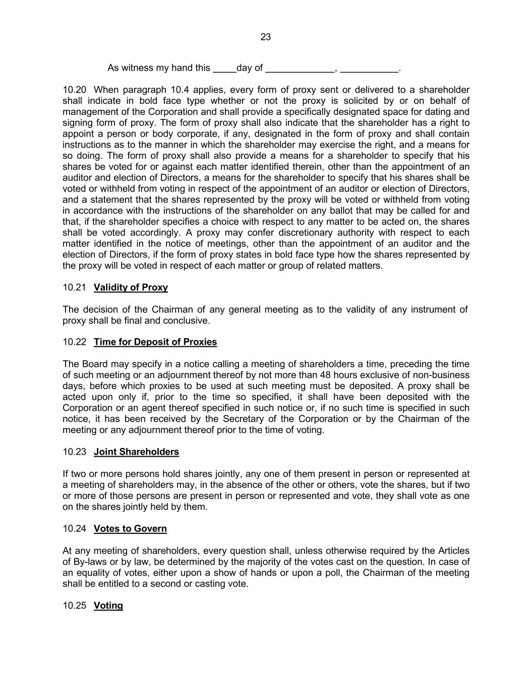 23 As witness my hand this day of , . 10.20 When paragraph 10.4 applies, every form of proxy sent or delivered to a shareholder shall indicate in bold face type whether or not the proxy is solicited by or on behalf of management of the Corporation and shall provide a specifically designated space for dating and signing form of proxy. The form of proxy shall also indicate that the shareholder has a right to appoint a person or body corporate, if any, designated in the form of proxy and shall contain instructions as to the manner in which the shareholder may exercise the right, and a means for so doing. The form of proxy shall also provide a means for a shareholder to specify that his shares be voted for or against each matter identified therein, other than the appointment of an auditor and election of Directors, a means for the shareholder to specify that his shares shall be voted or withheld from voting in respect of the appointment of an auditor or election of Directors, and a statement that the shares represented by the proxy will be voted or withheld from voting in accordance with the instructions of the shareholder on any ballot that may be called for and that, if the shareholder specifies a choice with respect to any matter to be acted on, the shares shall be voted accordingly. A proxy may confer discretionary authority with respect to each matter identified in the notice of meetings, other than the appointment of an auditor and the election of Directors, if the form of proxy states in bold face type how the shares represented by the proxy will be voted in respect of each matter or group of related matters. 10.21 Validity of Proxy The decision of the Chairman of any general meeting as to the validity of any instrument of proxy shall be final and conclusive. 10.22 Time for Deposit of Proxies The Board may specify in a notice calling a meeting of shareholders a time, preceding the time of such meeting or an adjournment thereof by not more than 48 hours exclusive of non-business days, before which proxies to be used at such meeting must be deposited. A proxy shall be acted upon only if, prior to the time so specified, it shall have been deposited with the Corporation or an agent thereof specified in such notice or, if no such time is specified in such notice, it has been received by the Secretary of the Corporation or by the Chairman of the meeting or any adjournment thereof prior to the time of voting. 10.23 Joint Shareholders If two or more persons hold shares jointly, any one of them present in person or represented at a meeting of shareholders may, in the absence of the other or others, vote the shares, but if two or more of those persons are present in person or represented and vote, they shall vote as one on the shares jointly held by them. 10.24 Votes to Govern At any meeting of shareholders, every question shall, unless otherwise required by the Articles of By-laws or by law, be determined by the majority of the votes cast on the question. In case of an equality of votes, either upon a show of hands or upon a poll, the Chairman of the meeting shall be entitled to a second or casting vote. 10.25 Voting