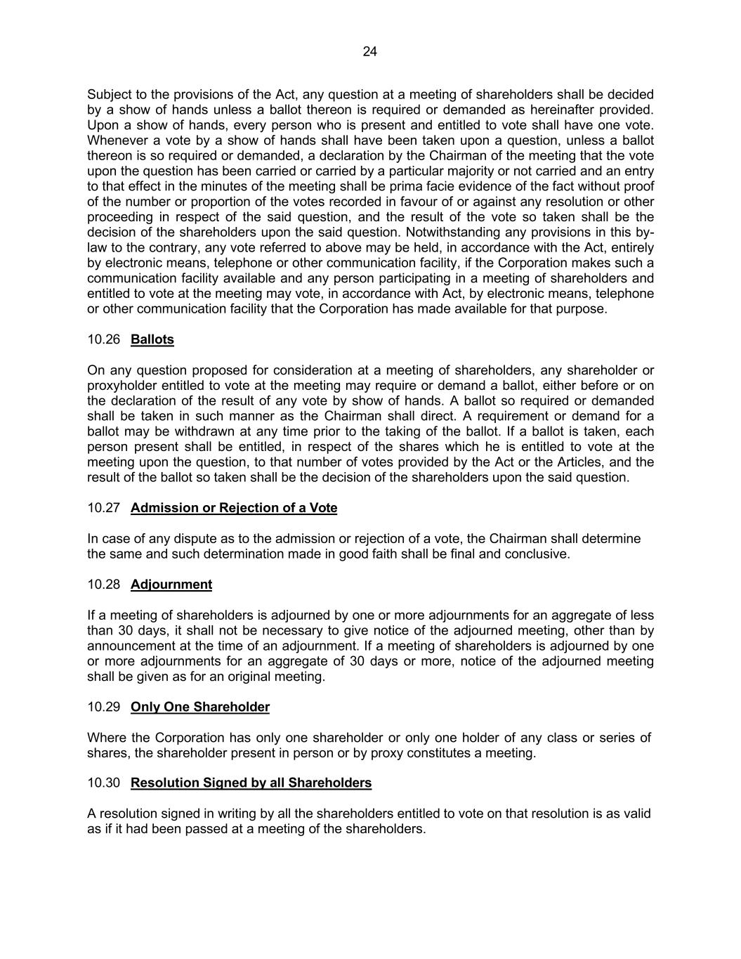 24 Subject to the provisions of the Act, any question at a meeting of shareholders shall be decided by a show of hands unless a ballot thereon is required or demanded as hereinafter provided. Upon a show of hands, every person who is present and entitled to vote shall have one vote. Whenever a vote by a show of hands shall have been taken upon a question, unless a ballot thereon is so required or demanded, a declaration by the Chairman of the meeting that the vote upon the question has been carried or carried by a particular majority or not carried and an entry to that effect in the minutes of the meeting shall be prima facie evidence of the fact without proof of the number or proportion of the votes recorded in favour of or against any resolution or other proceeding in respect of the said question, and the result of the vote so taken shall be the decision of the shareholders upon the said question. Notwithstanding any provisions in this by- law to the contrary, any vote referred to above may be held, in accordance with the Act, entirely by electronic means, telephone or other communication facility, if the Corporation makes such a communication facility available and any person participating in a meeting of shareholders and entitled to vote at the meeting may vote, in accordance with Act, by electronic means, telephone or other communication facility that the Corporation has made available for that purpose. 10.26 Ballots On any question proposed for consideration at a meeting of shareholders, any shareholder or proxyholder entitled to vote at the meeting may require or demand a ballot, either before or on the declaration of the result of any vote by show of hands. A ballot so required or demanded shall be taken in such manner as the Chairman shall direct. A requirement or demand for a ballot may be withdrawn at any time prior to the taking of the ballot. If a ballot is taken, each person present shall be entitled, in respect of the shares which he is entitled to vote at the meeting upon the question, to that number of votes provided by the Act or the Articles, and the result of the ballot so taken shall be the decision of the shareholders upon the said question. 10.27 Admission or Rejection of a Vote In case of any dispute as to the admission or rejection of a vote, the Chairman shall determine the same and such determination made in good faith shall be final and conclusive. 10.28 Adjournment If a meeting of shareholders is adjourned by one or more adjournments for an aggregate of less than 30 days, it shall not be necessary to give notice of the adjourned meeting, other than by announcement at the time of an adjournment. If a meeting of shareholders is adjourned by one or more adjournments for an aggregate of 30 days or more, notice of the adjourned meeting shall be given as for an original meeting. 10.29 Only One Shareholder Where the Corporation has only one shareholder or only one holder of any class or series of shares, the shareholder present in person or by proxy constitutes a meeting. 10.30 Resolution Signed by all Shareholders A resolution signed in writing by all the shareholders entitled to vote on that resolution is as valid as if it had been passed at a meeting of the shareholders.