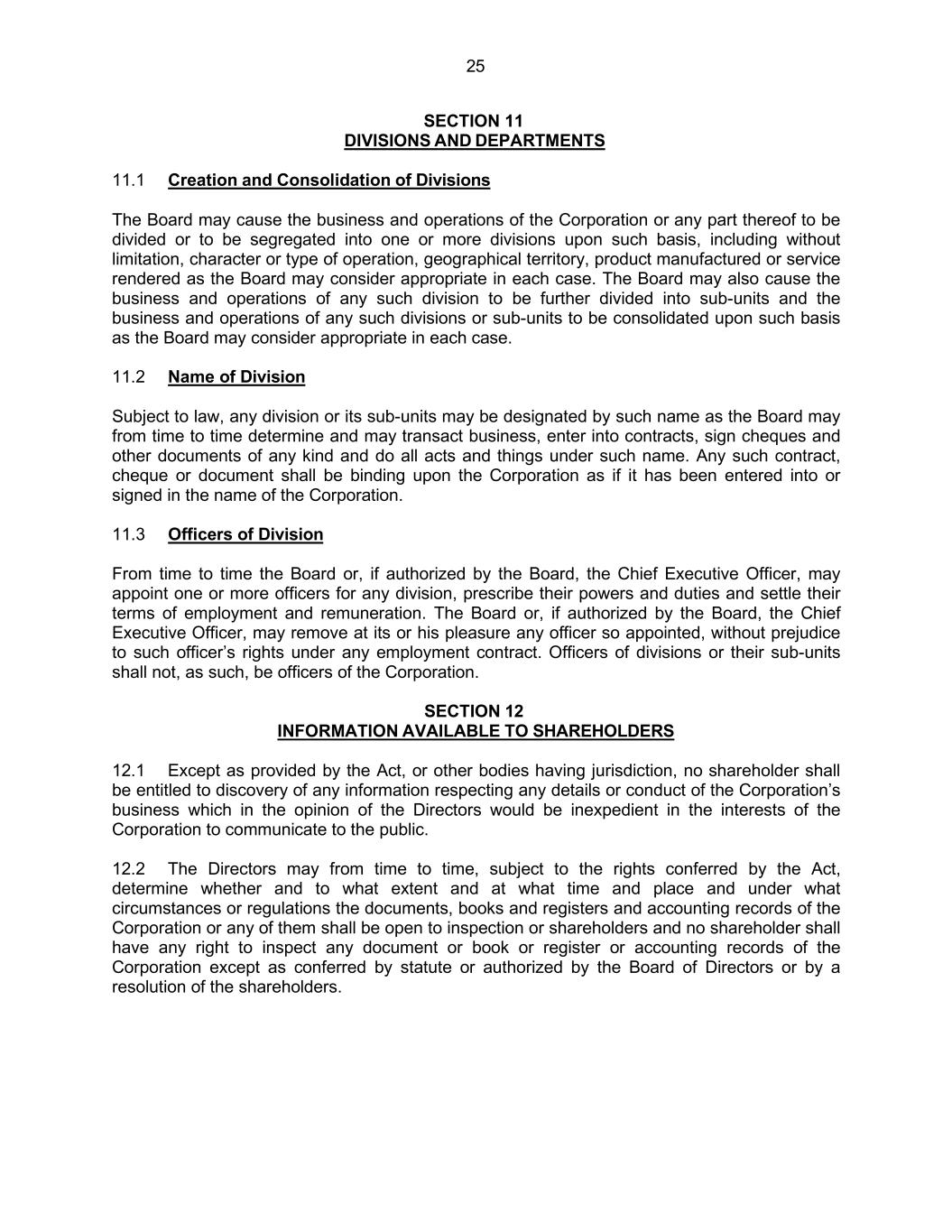 25 SECTION 11 DIVISIONS AND DEPARTMENTS 11.1 Creation and Consolidation of Divisions The Board may cause the business and operations of the Corporation or any part thereof to be divided or to be segregated into one or more divisions upon such basis, including without limitation, character or type of operation, geographical territory, product manufactured or service rendered as the Board may consider appropriate in each case. The Board may also cause the business and operations of any such division to be further divided into sub-units and the business and operations of any such divisions or sub-units to be consolidated upon such basis as the Board may consider appropriate in each case. 11.2 Name of Division Subject to law, any division or its sub-units may be designated by such name as the Board may from time to time determine and may transact business, enter into contracts, sign cheques and other documents of any kind and do all acts and things under such name. Any such contract, cheque or document shall be binding upon the Corporation as if it has been entered into or signed in the name of the Corporation. 11.3 Officers of Division From time to time the Board or, if authorized by the Board, the Chief Executive Officer, may appoint one or more officers for any division, prescribe their powers and duties and settle their terms of employment and remuneration. The Board or, if authorized by the Board, the Chief Executive Officer, may remove at its or his pleasure any officer so appointed, without prejudice to such officer’s rights under any employment contract. Officers of divisions or their sub-units shall not, as such, be officers of the Corporation. SECTION 12 INFORMATION AVAILABLE TO SHAREHOLDERS 12.1 Except as provided by the Act, or other bodies having jurisdiction, no shareholder shall be entitled to discovery of any information respecting any details or conduct of the Corporation’s business which in the opinion of the Directors would be inexpedient in the interests of the Corporation to communicate to the public. 12.2 The Directors may from time to time, subject to the rights conferred by the Act, determine whether and to what extent and at what time and place and under what circumstances or regulations the documents, books and registers and accounting records of the Corporation or any of them shall be open to inspection or shareholders and no shareholder shall have any right to inspect any document or book or register or accounting records of the Corporation except as conferred by statute or authorized by the Board of Directors or by a resolution of the shareholders.