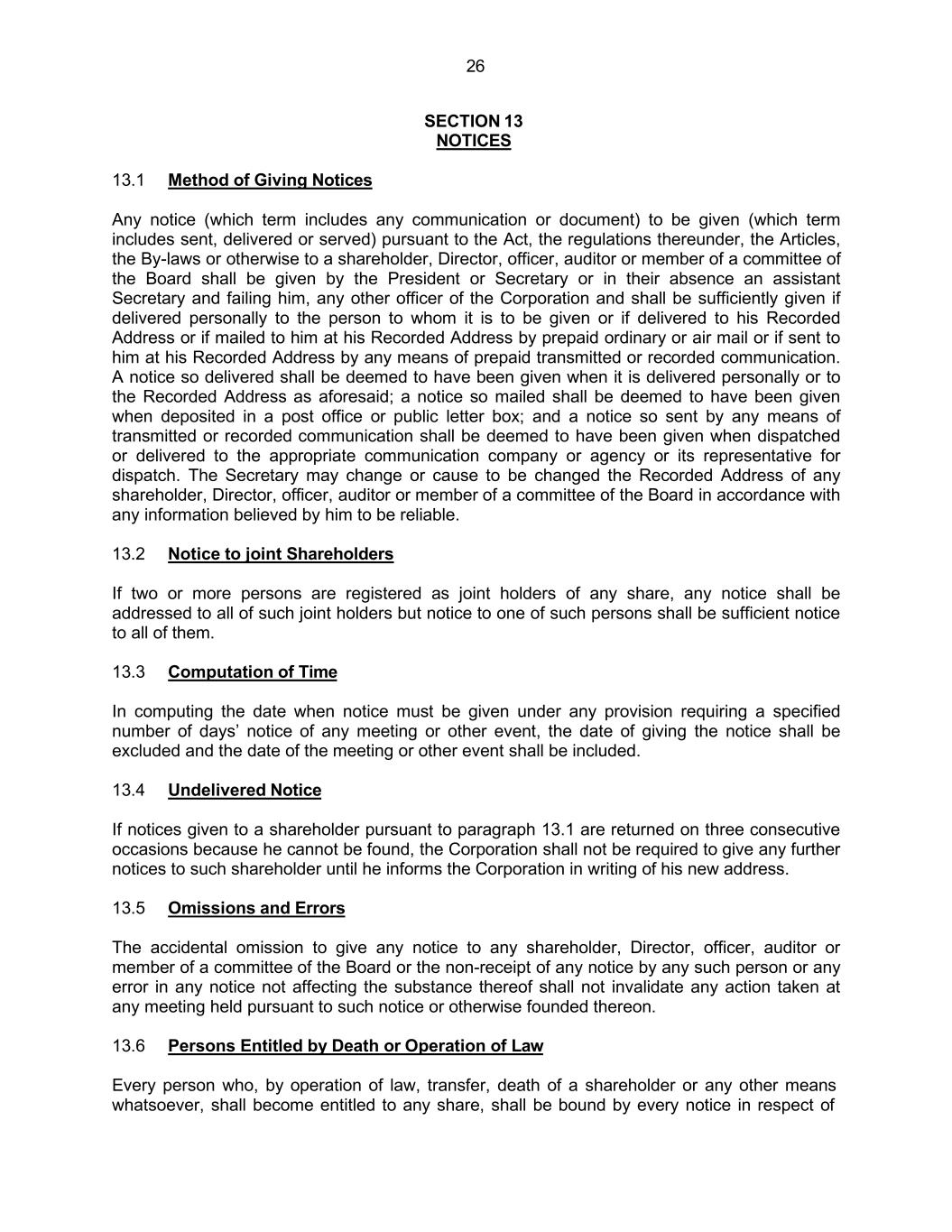 26 SECTION 13 NOTICES 13.1 Method of Giving Notices Any notice (which term includes any communication or document) to be given (which term includes sent, delivered or served) pursuant to the Act, the regulations thereunder, the Articles, the By-laws or otherwise to a shareholder, Director, officer, auditor or member of a committee of the Board shall be given by the President or Secretary or in their absence an assistant Secretary and failing him, any other officer of the Corporation and shall be sufficiently given if delivered personally to the person to whom it is to be given or if delivered to his Recorded Address or if mailed to him at his Recorded Address by prepaid ordinary or air mail or if sent to him at his Recorded Address by any means of prepaid transmitted or recorded communication. A notice so delivered shall be deemed to have been given when it is delivered personally or to the Recorded Address as aforesaid; a notice so mailed shall be deemed to have been given when deposited in a post office or public letter box; and a notice so sent by any means of transmitted or recorded communication shall be deemed to have been given when dispatched or delivered to the appropriate communication company or agency or its representative for dispatch. The Secretary may change or cause to be changed the Recorded Address of any shareholder, Director, officer, auditor or member of a committee of the Board in accordance with any information believed by him to be reliable. 13.2 Notice to joint Shareholders If two or more persons are registered as joint holders of any share, any notice shall be addressed to all of such joint holders but notice to one of such persons shall be sufficient notice to all of them. 13.3 Computation of Time In computing the date when notice must be given under any provision requiring a specified number of days’ notice of any meeting or other event, the date of giving the notice shall be excluded and the date of the meeting or other event shall be included. 13.4 Undelivered Notice If notices given to a shareholder pursuant to paragraph 13.1 are returned on three consecutive occasions because he cannot be found, the Corporation shall not be required to give any further notices to such shareholder until he informs the Corporation in writing of his new address. 13.5 Omissions and Errors The accidental omission to give any notice to any shareholder, Director, officer, auditor or member of a committee of the Board or the non-receipt of any notice by any such person or any error in any notice not affecting the substance thereof shall not invalidate any action taken at any meeting held pursuant to such notice or otherwise founded thereon. 13.6 Persons Entitled by Death or Operation of Law Every person who, by operation of law, transfer, death of a shareholder or any other means whatsoever, shall become entitled to any share, shall be bound by every notice in respect of