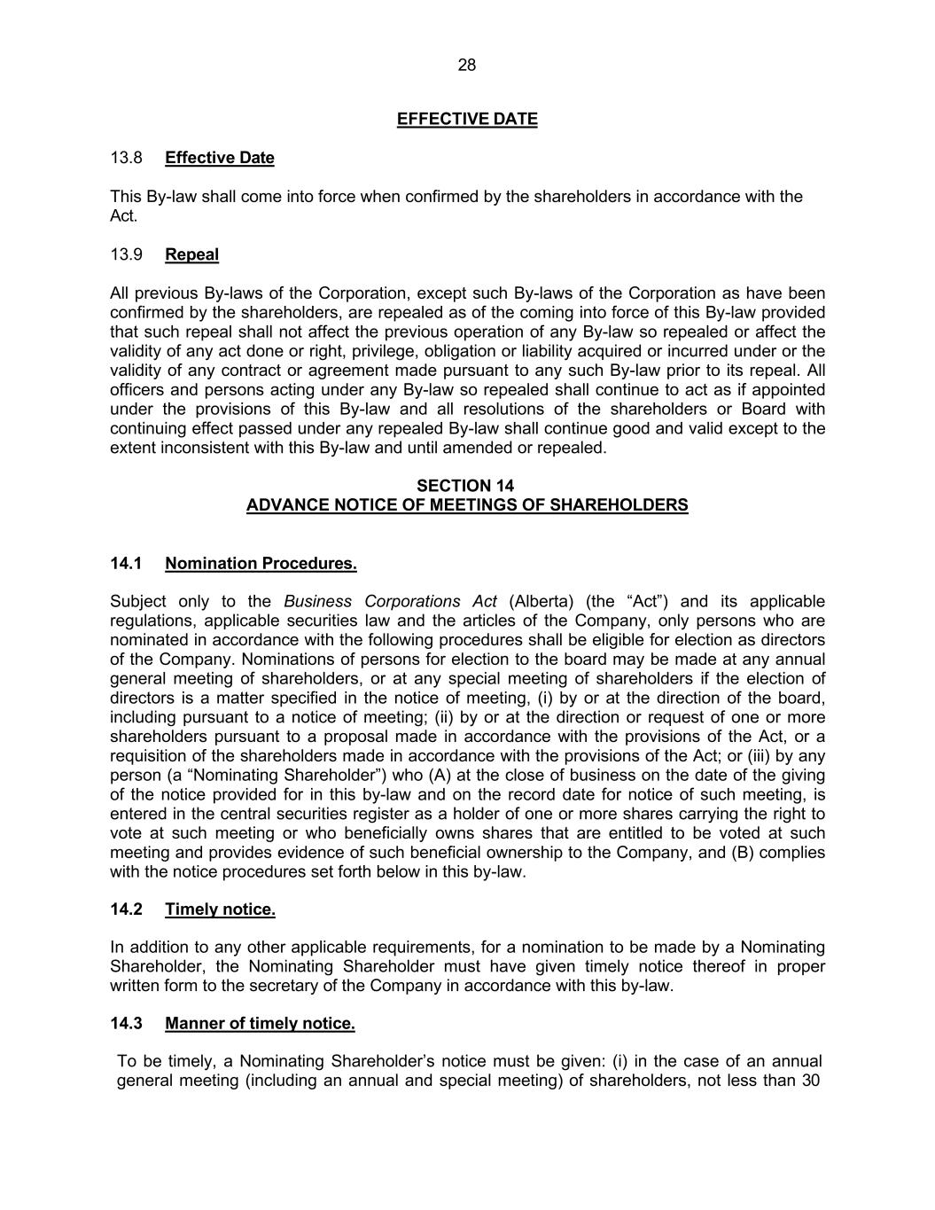 28 EFFECTIVE DATE 13.8 Effective Date This By-law shall come into force when confirmed by the shareholders in accordance with the Act. 13.9 Repeal All previous By-laws of the Corporation, except such By-laws of the Corporation as have been confirmed by the shareholders, are repealed as of the coming into force of this By-law provided that such repeal shall not affect the previous operation of any By-law so repealed or affect the validity of any act done or right, privilege, obligation or liability acquired or incurred under or the validity of any contract or agreement made pursuant to any such By-law prior to its repeal. All officers and persons acting under any By-law so repealed shall continue to act as if appointed under the provisions of this By-law and all resolutions of the shareholders or Board with continuing effect passed under any repealed By-law shall continue good and valid except to the extent inconsistent with this By-law and until amended or repealed. SECTION 14 ADVANCE NOTICE OF MEETINGS OF SHAREHOLDERS 14.1 Nomination Procedures. Subject only to the Business Corporations Act (Alberta) (the “Act”) and its applicable regulations, applicable securities law and the articles of the Company, only persons who are nominated in accordance with the following procedures shall be eligible for election as directors of the Company. Nominations of persons for election to the board may be made at any annual general meeting of shareholders, or at any special meeting of shareholders if the election of directors is a matter specified in the notice of meeting, (i) by or at the direction of the board, including pursuant to a notice of meeting; (ii) by or at the direction or request of one or more shareholders pursuant to a proposal made in accordance with the provisions of the Act, or a requisition of the shareholders made in accordance with the provisions of the Act; or (iii) by any person (a “Nominating Shareholder”) who (A) at the close of business on the date of the giving of the notice provided for in this by-law and on the record date for notice of such meeting, is entered in the central securities register as a holder of one or more shares carrying the right to vote at such meeting or who beneficially owns shares that are entitled to be voted at such meeting and provides evidence of such beneficial ownership to the Company, and (B) complies with the notice procedures set forth below in this by-law. 14.2 Timely notice. In addition to any other applicable requirements, for a nomination to be made by a Nominating Shareholder, the Nominating Shareholder must have given timely notice thereof in proper written form to the secretary of the Company in accordance with this by-law. 14.3 Manner of timely notice. To be timely, a Nominating Shareholder’s notice must be given: (i) in the case of an annual general meeting (including an annual and special meeting) of shareholders, not less than 30