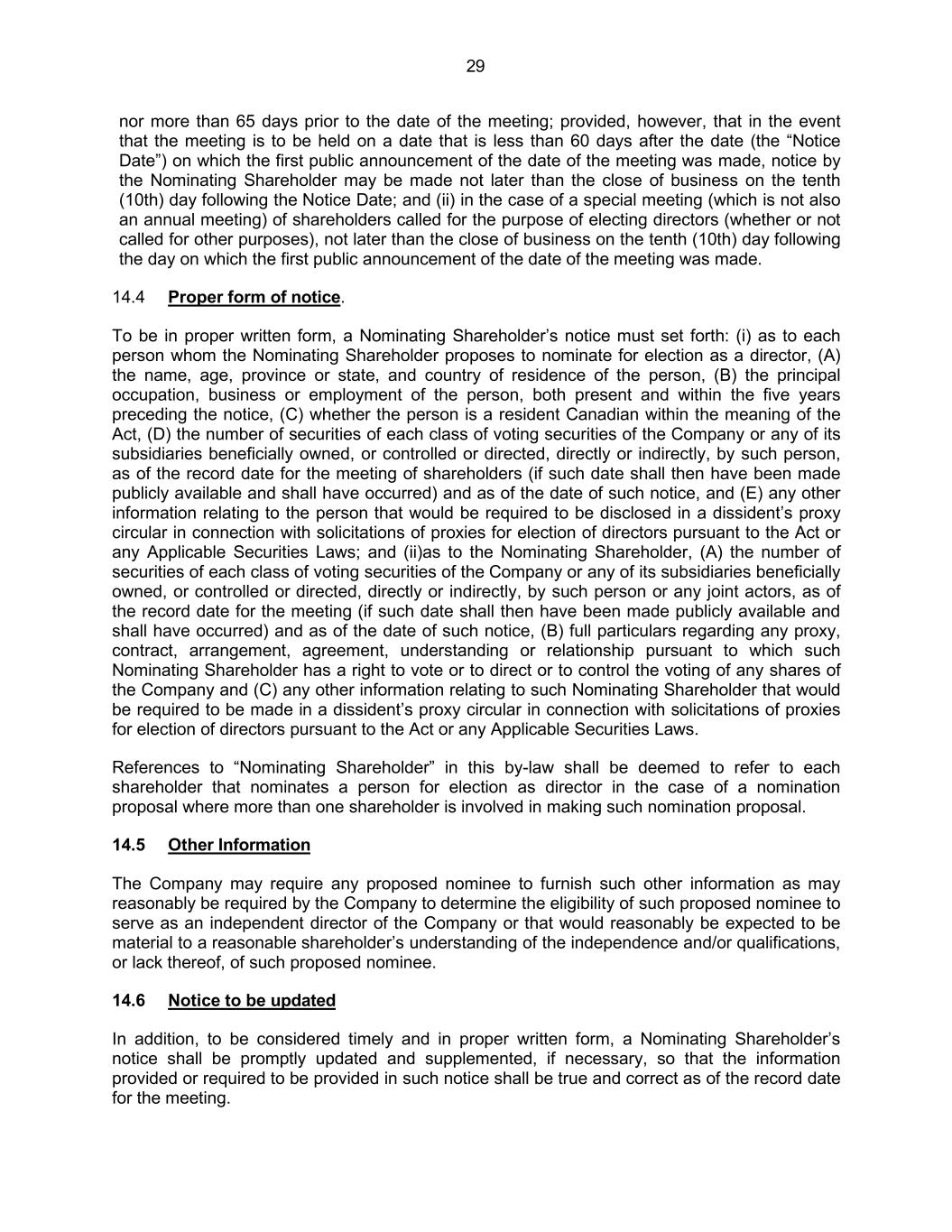 29 nor more than 65 days prior to the date of the meeting; provided, however, that in the event that the meeting is to be held on a date that is less than 60 days after the date (the “Notice Date”) on which the first public announcement of the date of the meeting was made, notice by the Nominating Shareholder may be made not later than the close of business on the tenth (10th) day following the Notice Date; and (ii) in the case of a special meeting (which is not also an annual meeting) of shareholders called for the purpose of electing directors (whether or not called for other purposes), not later than the close of business on the tenth (10th) day following the day on which the first public announcement of the date of the meeting was made. 14.4 Proper form of notice. To be in proper written form, a Nominating Shareholder’s notice must set forth: (i) as to each person whom the Nominating Shareholder proposes to nominate for election as a director, (A) the name, age, province or state, and country of residence of the person, (B) the principal occupation, business or employment of the person, both present and within the five years preceding the notice, (C) whether the person is a resident Canadian within the meaning of the Act, (D) the number of securities of each class of voting securities of the Company or any of its subsidiaries beneficially owned, or controlled or directed, directly or indirectly, by such person, as of the record date for the meeting of shareholders (if such date shall then have been made publicly available and shall have occurred) and as of the date of such notice, and (E) any other information relating to the person that would be required to be disclosed in a dissident’s proxy circular in connection with solicitations of proxies for election of directors pursuant to the Act or any Applicable Securities Laws; and (ii)as to the Nominating Shareholder, (A) the number of securities of each class of voting securities of the Company or any of its subsidiaries beneficially owned, or controlled or directed, directly or indirectly, by such person or any joint actors, as of the record date for the meeting (if such date shall then have been made publicly available and shall have occurred) and as of the date of such notice, (B) full particulars regarding any proxy, contract, arrangement, agreement, understanding or relationship pursuant to which such Nominating Shareholder has a right to vote or to direct or to control the voting of any shares of the Company and (C) any other information relating to such Nominating Shareholder that would be required to be made in a dissident’s proxy circular in connection with solicitations of proxies for election of directors pursuant to the Act or any Applicable Securities Laws. References to “Nominating Shareholder” in this by-law shall be deemed to refer to each shareholder that nominates a person for election as director in the case of a nomination proposal where more than one shareholder is involved in making such nomination proposal. 14.5 Other Information The Company may require any proposed nominee to furnish such other information as may reasonably be required by the Company to determine the eligibility of such proposed nominee to serve as an independent director of the Company or that would reasonably be expected to be material to a reasonable shareholder’s understanding of the independence and/or qualifications, or lack thereof, of such proposed nominee. 14.6 Notice to be updated In addition, to be considered timely and in proper written form, a Nominating Shareholder’s notice shall be promptly updated and supplemented, if necessary, so that the information provided or required to be provided in such notice shall be true and correct as of the record date for the meeting.
