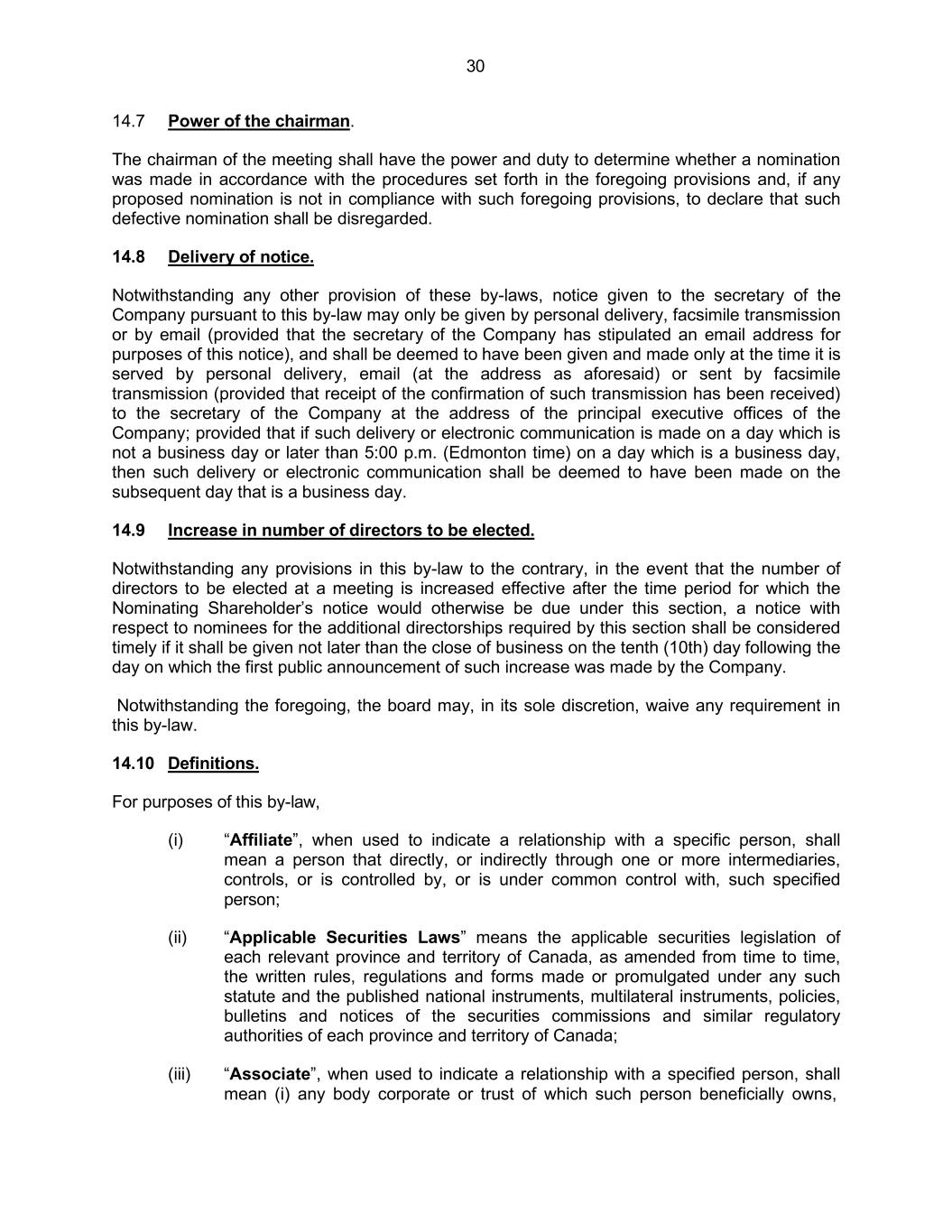 30 14.7 Power of the chairman. The chairman of the meeting shall have the power and duty to determine whether a nomination was made in accordance with the procedures set forth in the foregoing provisions and, if any proposed nomination is not in compliance with such foregoing provisions, to declare that such defective nomination shall be disregarded. 14.8 Delivery of notice. Notwithstanding any other provision of these by-laws, notice given to the secretary of the Company pursuant to this by-law may only be given by personal delivery, facsimile transmission or by email (provided that the secretary of the Company has stipulated an email address for purposes of this notice), and shall be deemed to have been given and made only at the time it is served by personal delivery, email (at the address as aforesaid) or sent by facsimile transmission (provided that receipt of the confirmation of such transmission has been received) to the secretary of the Company at the address of the principal executive offices of the Company; provided that if such delivery or electronic communication is made on a day which is not a business day or later than 5:00 p.m. (Edmonton time) on a day which is a business day, then such delivery or electronic communication shall be deemed to have been made on the subsequent day that is a business day. 14.9 Increase in number of directors to be elected. Notwithstanding any provisions in this by-law to the contrary, in the event that the number of directors to be elected at a meeting is increased effective after the time period for which the Nominating Shareholder’s notice would otherwise be due under this section, a notice with respect to nominees for the additional directorships required by this section shall be considered timely if it shall be given not later than the close of business on the tenth (10th) day following the day on which the first public announcement of such increase was made by the Company. Notwithstanding the foregoing, the board may, in its sole discretion, waive any requirement in this by-law. 14.10 Definitions. For purposes of this by-law, (i) “Affiliate”, when used to indicate a relationship with a specific person, shall mean a person that directly, or indirectly through one or more intermediaries, controls, or is controlled by, or is under common control with, such specified person; (ii) “Applicable Securities Laws” means the applicable securities legislation of each relevant province and territory of Canada, as amended from time to time, the written rules, regulations and forms made or promulgated under any such statute and the published national instruments, multilateral instruments, policies, bulletins and notices of the securities commissions and similar regulatory authorities of each province and territory of Canada; (iii) “Associate”, when used to indicate a relationship with a specified person, shall mean (i) any body corporate or trust of which such person beneficially owns,