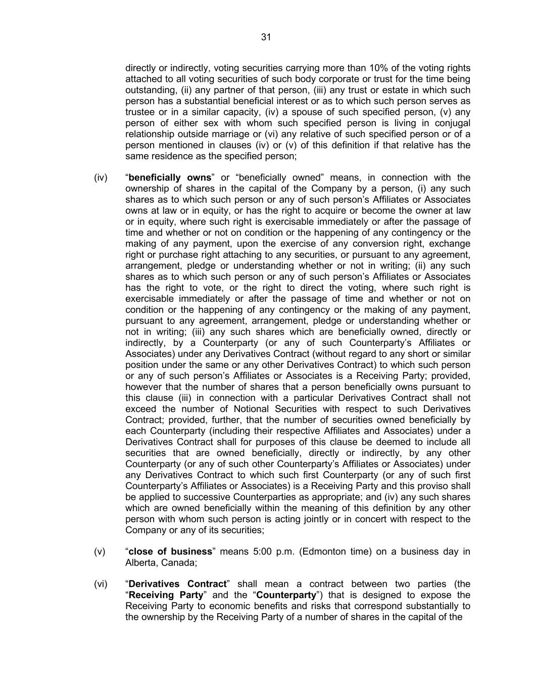 31 directly or indirectly, voting securities carrying more than 10% of the voting rights attached to all voting securities of such body corporate or trust for the time being outstanding, (ii) any partner of that person, (iii) any trust or estate in which such person has a substantial beneficial interest or as to which such person serves as trustee or in a similar capacity, (iv) a spouse of such specified person, (v) any person of either sex with whom such specified person is living in conjugal relationship outside marriage or (vi) any relative of such specified person or of a person mentioned in clauses (iv) or (v) of this definition if that relative has the same residence as the specified person; (iv) “beneficially owns” or “beneficially owned” means, in connection with the ownership of shares in the capital of the Company by a person, (i) any such shares as to which such person or any of such person’s Affiliates or Associates owns at law or in equity, or has the right to acquire or become the owner at law or in equity, where such right is exercisable immediately or after the passage of time and whether or not on condition or the happening of any contingency or the making of any payment, upon the exercise of any conversion right, exchange right or purchase right attaching to any securities, or pursuant to any agreement, arrangement, pledge or understanding whether or not in writing; (ii) any such shares as to which such person or any of such person’s Affiliates or Associates has the right to vote, or the right to direct the voting, where such right is exercisable immediately or after the passage of time and whether or not on condition or the happening of any contingency or the making of any payment, pursuant to any agreement, arrangement, pledge or understanding whether or not in writing; (iii) any such shares which are beneficially owned, directly or indirectly, by a Counterparty (or any of such Counterparty’s Affiliates or Associates) under any Derivatives Contract (without regard to any short or similar position under the same or any other Derivatives Contract) to which such person or any of such person’s Affiliates or Associates is a Receiving Party; provided, however that the number of shares that a person beneficially owns pursuant to this clause (iii) in connection with a particular Derivatives Contract shall not exceed the number of Notional Securities with respect to such Derivatives Contract; provided, further, that the number of securities owned beneficially by each Counterparty (including their respective Affiliates and Associates) under a Derivatives Contract shall for purposes of this clause be deemed to include all securities that are owned beneficially, directly or indirectly, by any other Counterparty (or any of such other Counterparty’s Affiliates or Associates) under any Derivatives Contract to which such first Counterparty (or any of such first Counterparty’s Affiliates or Associates) is a Receiving Party and this proviso shall be applied to successive Counterparties as appropriate; and (iv) any such shares which are owned beneficially within the meaning of this definition by any other person with whom such person is acting jointly or in concert with respect to the Company or any of its securities; (v) “close of business” means 5:00 p.m. (Edmonton time) on a business day in Alberta, Canada; (vi) “Derivatives Contract” shall mean a contract between two parties (the “Receiving Party” and the “Counterparty”) that is designed to expose the Receiving Party to economic benefits and risks that correspond substantially to the ownership by the Receiving Party of a number of shares in the capital of the